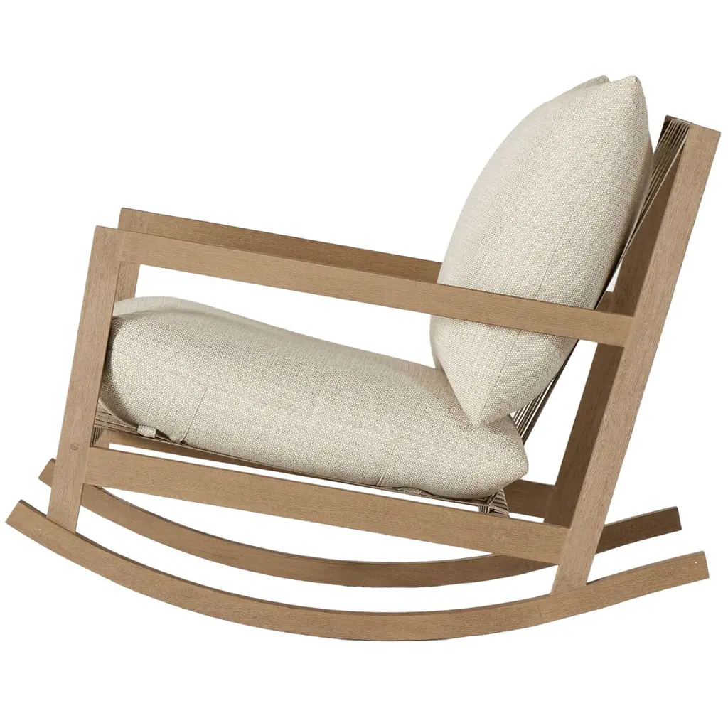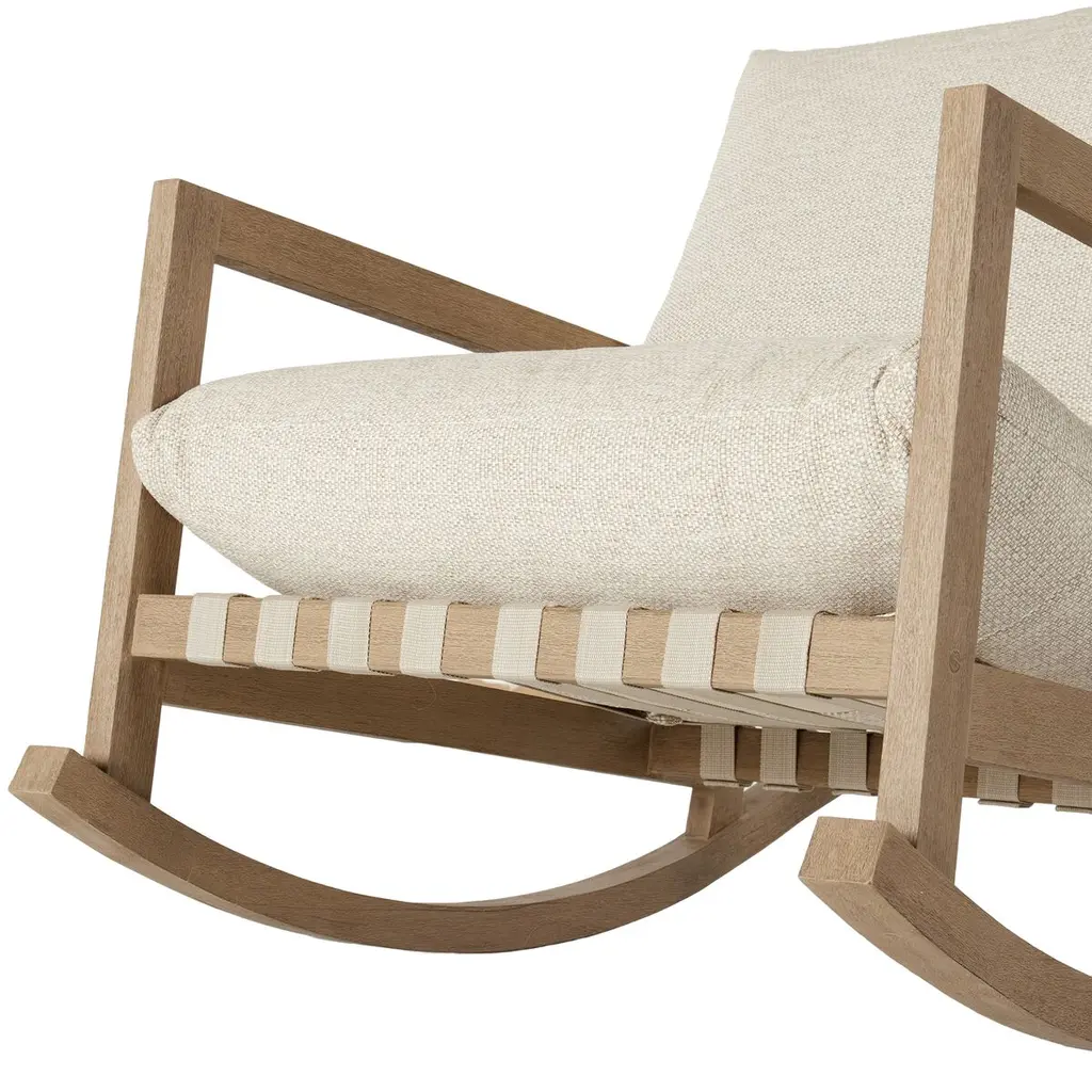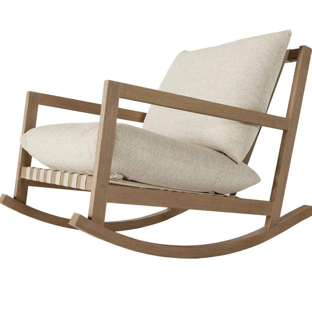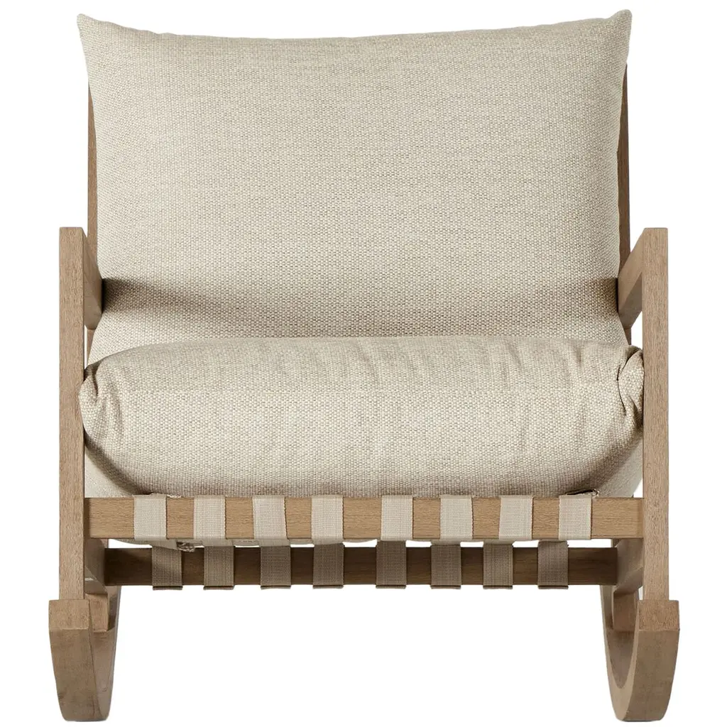With its clean lines and neutral tones, this rocker fits right in with just about any style of porch, patio, or sunroom. The frame is made of durable FSC-certified teak, a hardwood resistant to both moisture and termites; the cushions are clad in equally durable olefin, which resists stains, moisture, and fading.