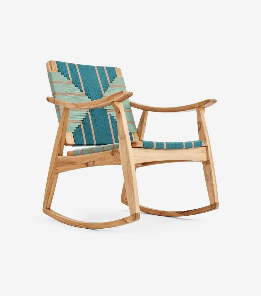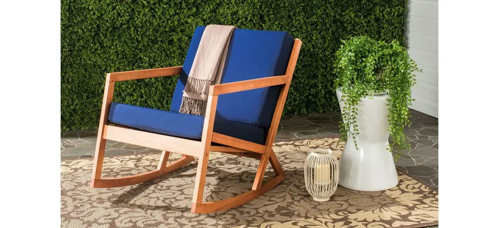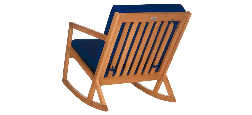 Contemporary with a nod to hand crafted Shaker individuality, this elegant outdoor rocking chair is destined to become a new American classic. Made from eco friendly eucalyptus wood in natural finish, it comes with easy care navy front and back cushions.