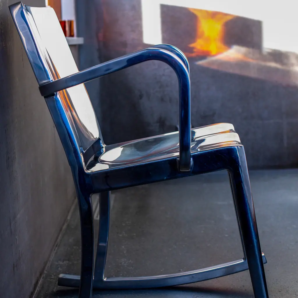 The Hudson, designed for the Hudson hotel in NYC, is Emeco and Starck’s first collaboration. Starck described the chair as "washing the details from the Navy Chair". It takes an additional 8 hours to polish each Hudson chair. Features