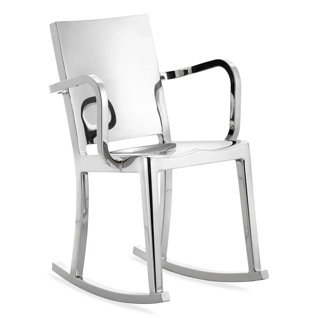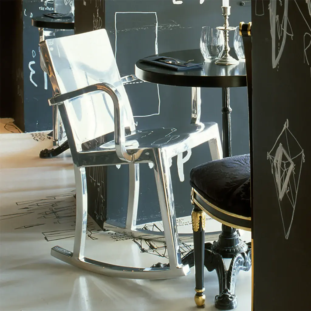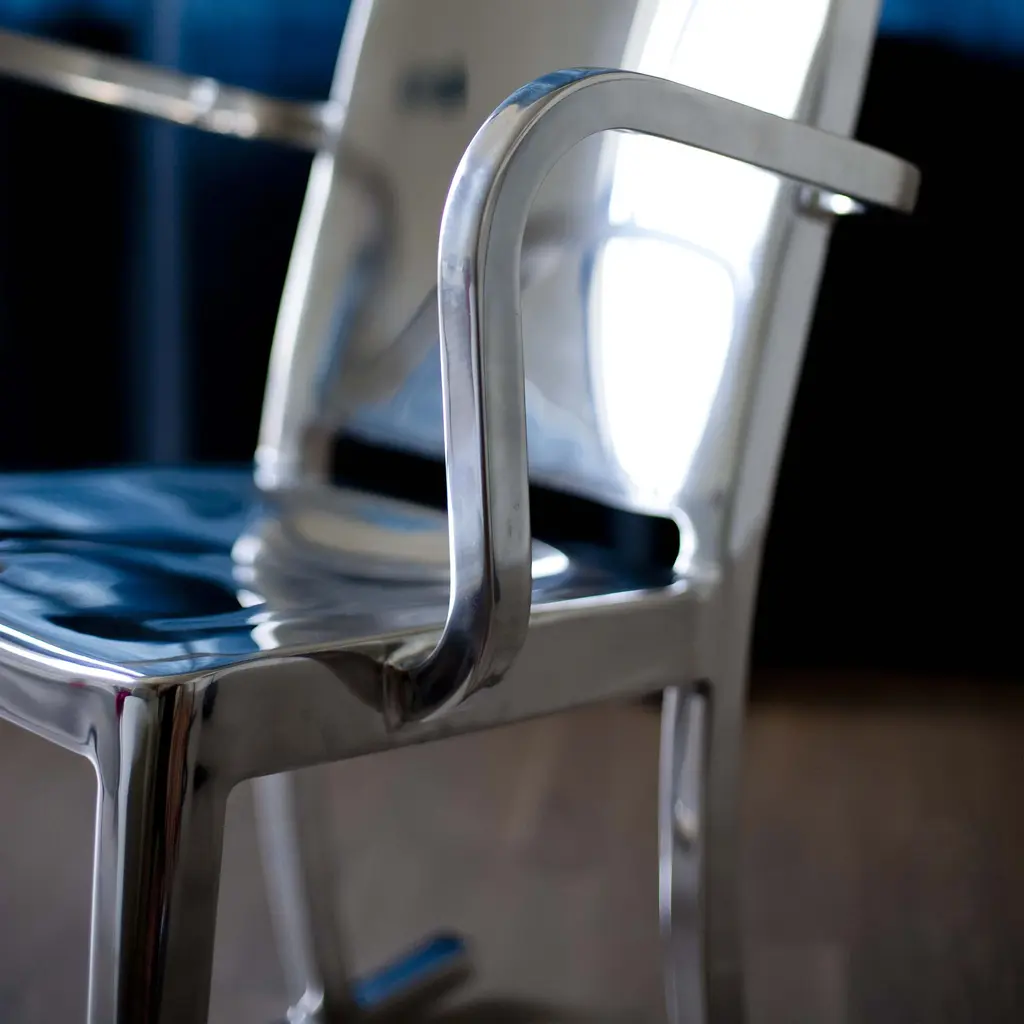 The Hudson, designed for the Hudson hotel in NYC, is Emeco and Starck’s first collaboration. Starck described the chair as "washing the details from the Navy Chair". It takes an additional 8 hours to polish each Hudson chair. Features