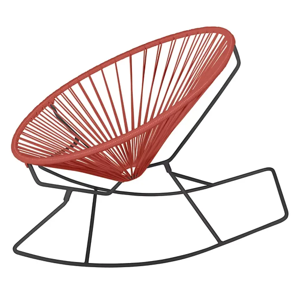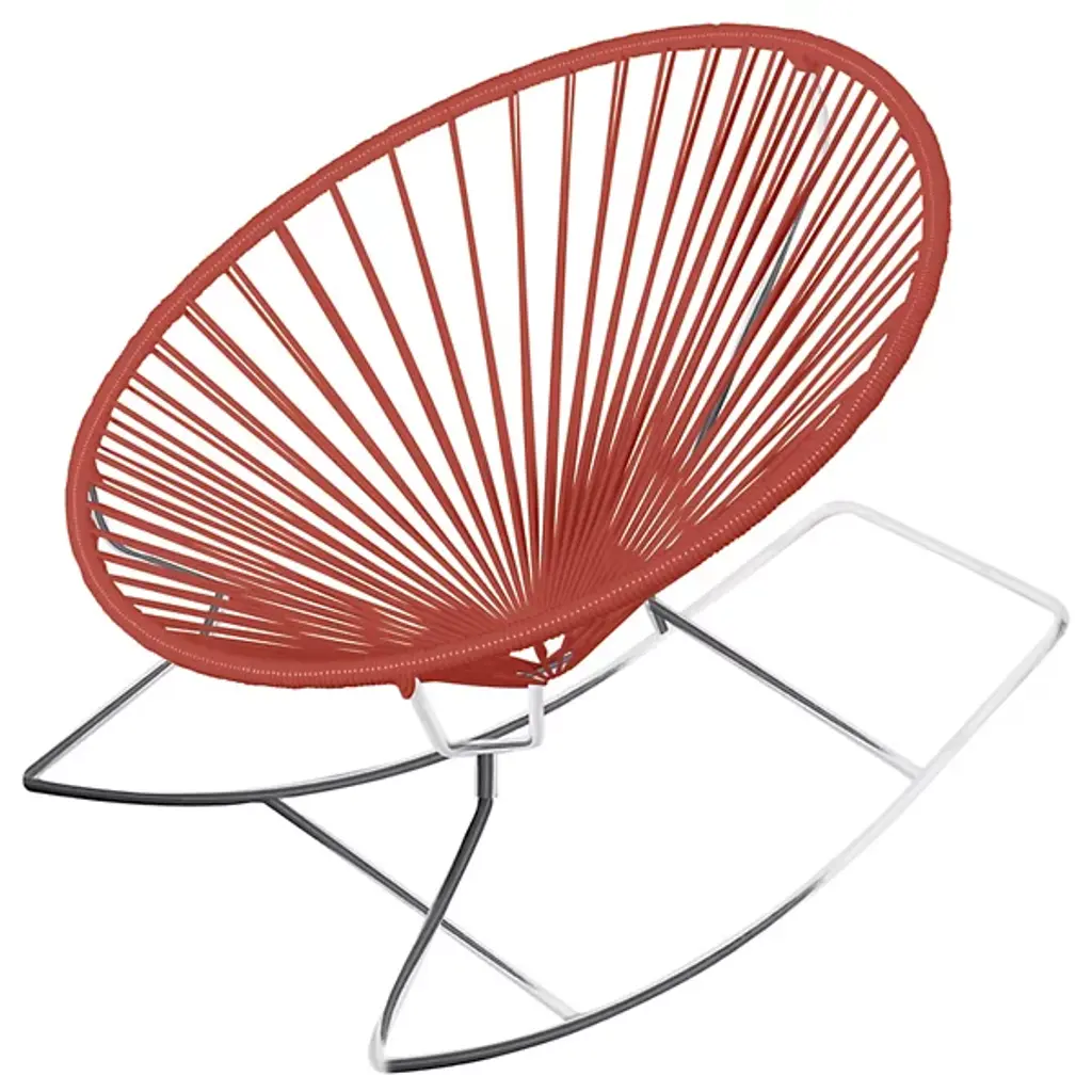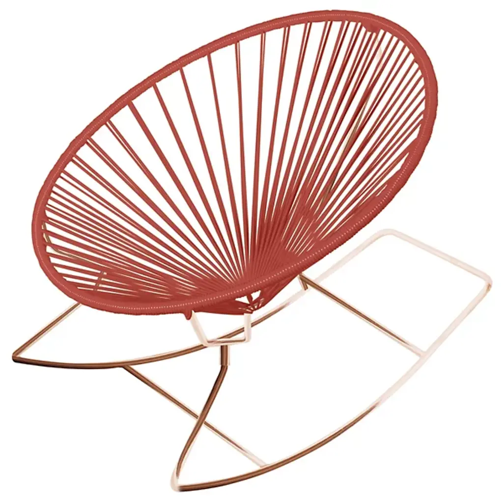 Once you're innit, you'll never want to get out. The Innit Designs Innit Outdoor Rocker is an adaptation of the company's signature chair. Inspired by the pear-shaped Acapulco Chair, the Innit stands on its own with a completely round seat. And the comfortable woven vinyl seat is made even more so with a relaxing steel rocker base. Note: Chrome and copper frame finishes are suitable for indoor use only.