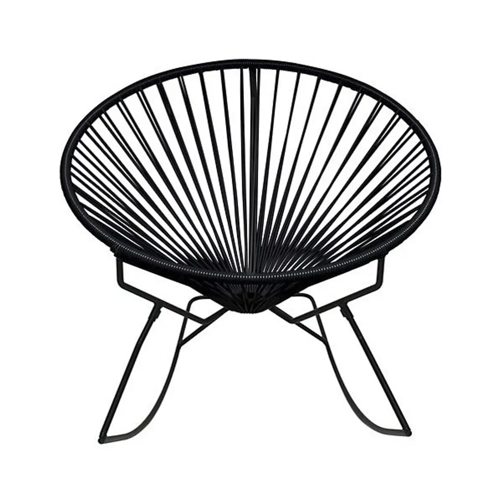 Once you're innit, you'll never want to get out. The Innit Designs Innit Outdoor Rocker is an adaptation of the company's signature chair. Inspired by the pear-shaped Acapulco Chair, the Innit stands on its own with a completely round seat. And the comfortable woven vinyl seat is made even more so with a relaxing steel rocker base. Note: Chrome and copper frame finishes are suitable for indoor use only.