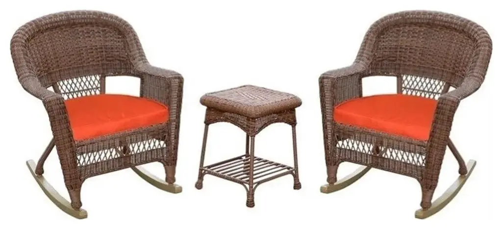 Jeco 3Pc Wicker Rocker Chair Set In Honey With Red Cushion