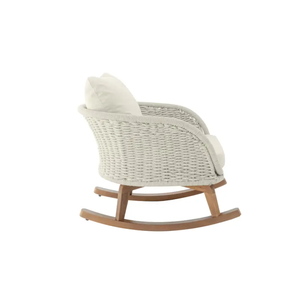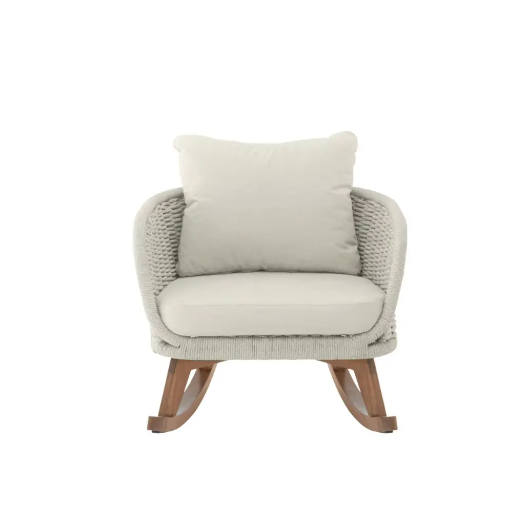 This wicker rocking chair combines modern elegance with natural charm, designed to fit seamlessly into any contemporary or coastal-style interior. Its sleek design, warm beige tones, and soft polyester cushions offer both comfort and aesthetic appeal. Whether placed indoors or outdoors on your patio or balcony, the spacious seat and smooth rocking motion provide a relaxing experience for reading or unwinding. Constructed with a durable wooden frame and high-quality PE rattan, this chair offers lasting durability and stability. Perfect for any home, this versatile rocking chair brings a touch of sophistication to your space.