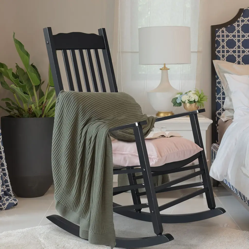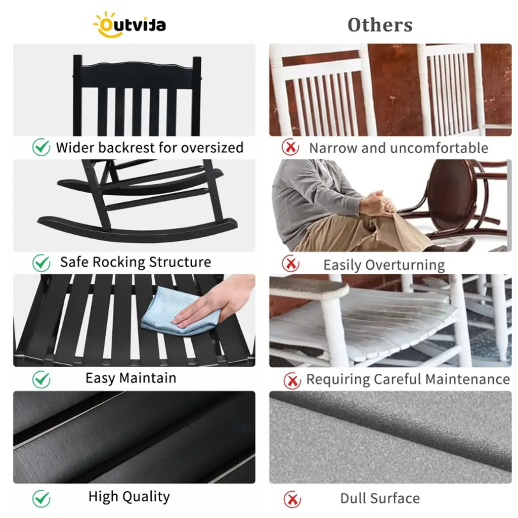 This beautifully designed rocking chair complements any outdoor setting, perfect for a backyard or front porch area. This rocking chair's solid wood frame and legs create a stable structure,offers a classic slatted wooden seat. Sure to become a favorite napping spot, indoors or outdoors.it offers a smooth and calming sway. Relax and enjoy a soothing cup of morning coffee on our rocking chair. The simple and classic design provides a comfortable rocking motion setting. Enjoy the fresh breeze of a sunny spring day or a summer night while sitting and having a conversation with friends.Relax, lean back, and let these patio rockers gently sway you into serene slumber.