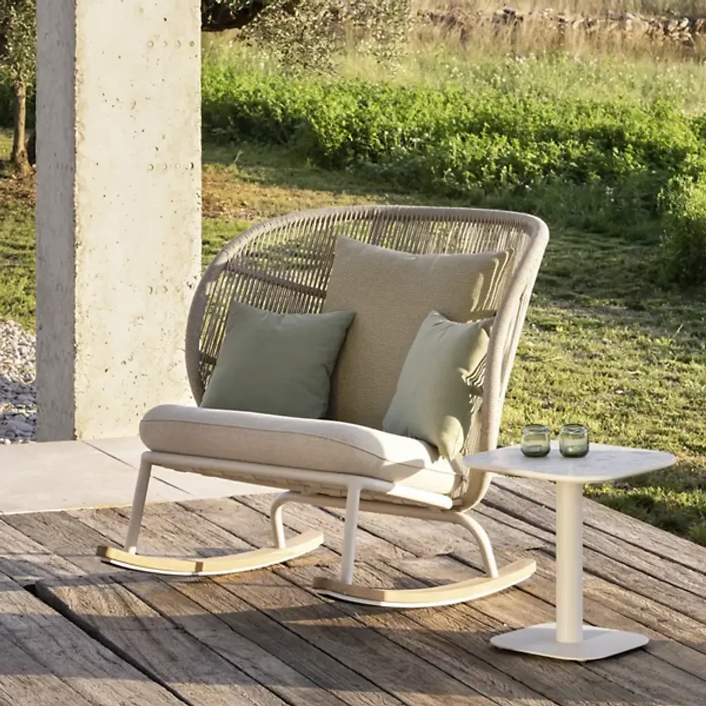 Enjoy lazy weekends and crisp autumn evenings on your front porch or back patio space with the Vincent Sheppard Kodo Outdoor Rocking Chair. This stylish outdoor rocking chair is built with a powder-coated aluminum frame and features solid teak rockers, ensuring a smooth back-and-forth rocking motion with every use. This outdoor rocking chair also includes Quick Dry foam with removable seat cushions, working together to keep your seat dry and comfortable. Adds a charming touch to your outdoor area.