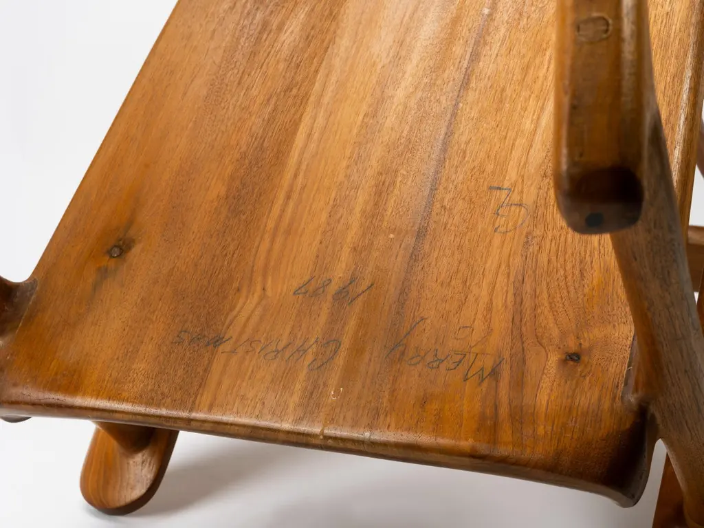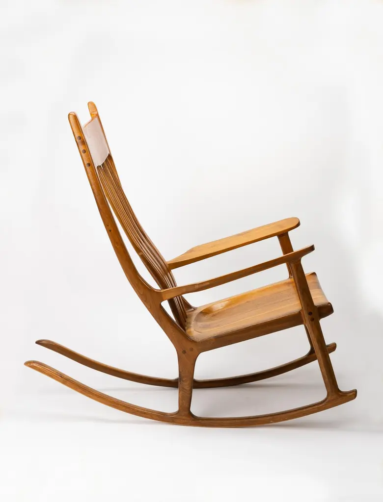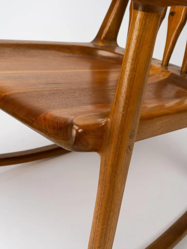 Sam Maloof was an American furniture designer, known for his trademark sculptural style and utilization of the utmost quality in materials. He was a prolific designer, with works still showcased in galleries and museum across the country, but perhaps his most iconic design is his rocking chair. Jimmy Carter once referred to him as his "woodworking hero."Characterized by its dramatic lines and highly sculptural form, Maloof’s rocking chairs are a masterclass in woodwork, and an original Maloof rocker commands a high premium in the modern furniture market.This example was made in Germany in the 1980s, by a designer who wanted to capture the quality and essence of Maloof’s craftsmanship.This piece is in immaculate condition, featuring sculptural lines and a dramatic form, it is sure to stand out in any space.
