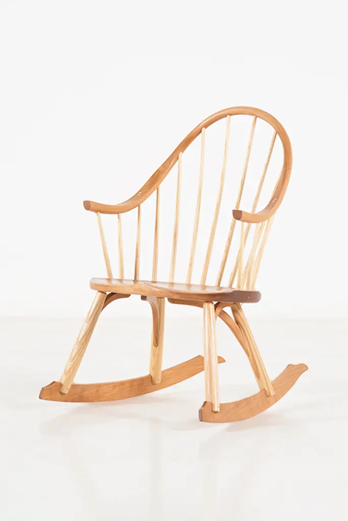 The Mademoiselle Rocking Chair is made from solid birch and was specifically developed for the home. Crafted using an age-old construction method, the spoke back contrasts strikingly with the smooth modernist curves of the seat's softly rounded edge. In creating the Mademoiselle, designer Ilmari Tapiovaara drew inspiration from traditional Finnish chairs, then applied his own modern design approach. Also available as a lounge chair.
