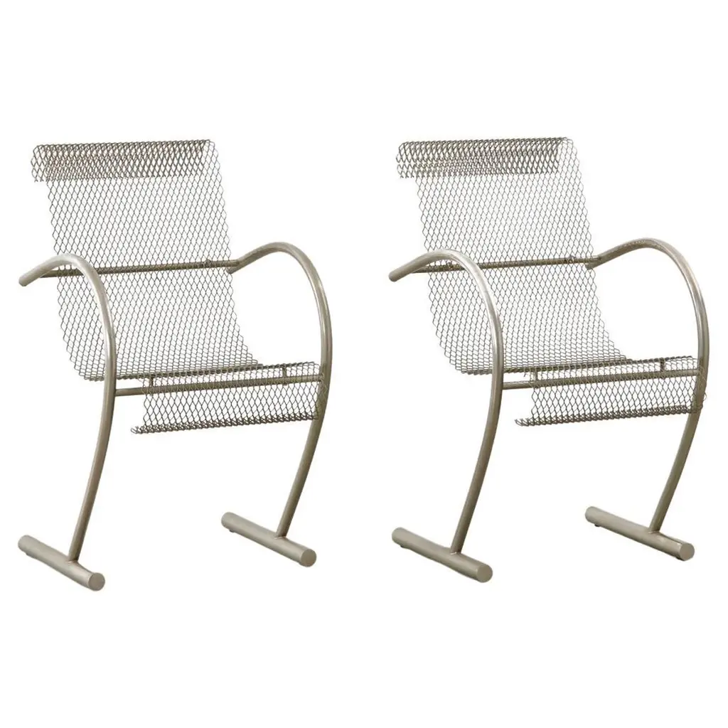 In the style of Maurizio Tempestini, a rare pair of complementary mesh and flat steel springer and rocking chair for indoor, outdoor, garden, porch or patio use. Wonderful design, springy mesh seat and back for comfort and relaxation on that summer day. Chairs have generous proportionsDimensions are for glider.Rocker: 33.25 H X 37.25 D X 21.5 WAH=26./ SH 17.5 / SD=16 / SW=16.3Salterrini. Woodard, Maurizio Tempestini.