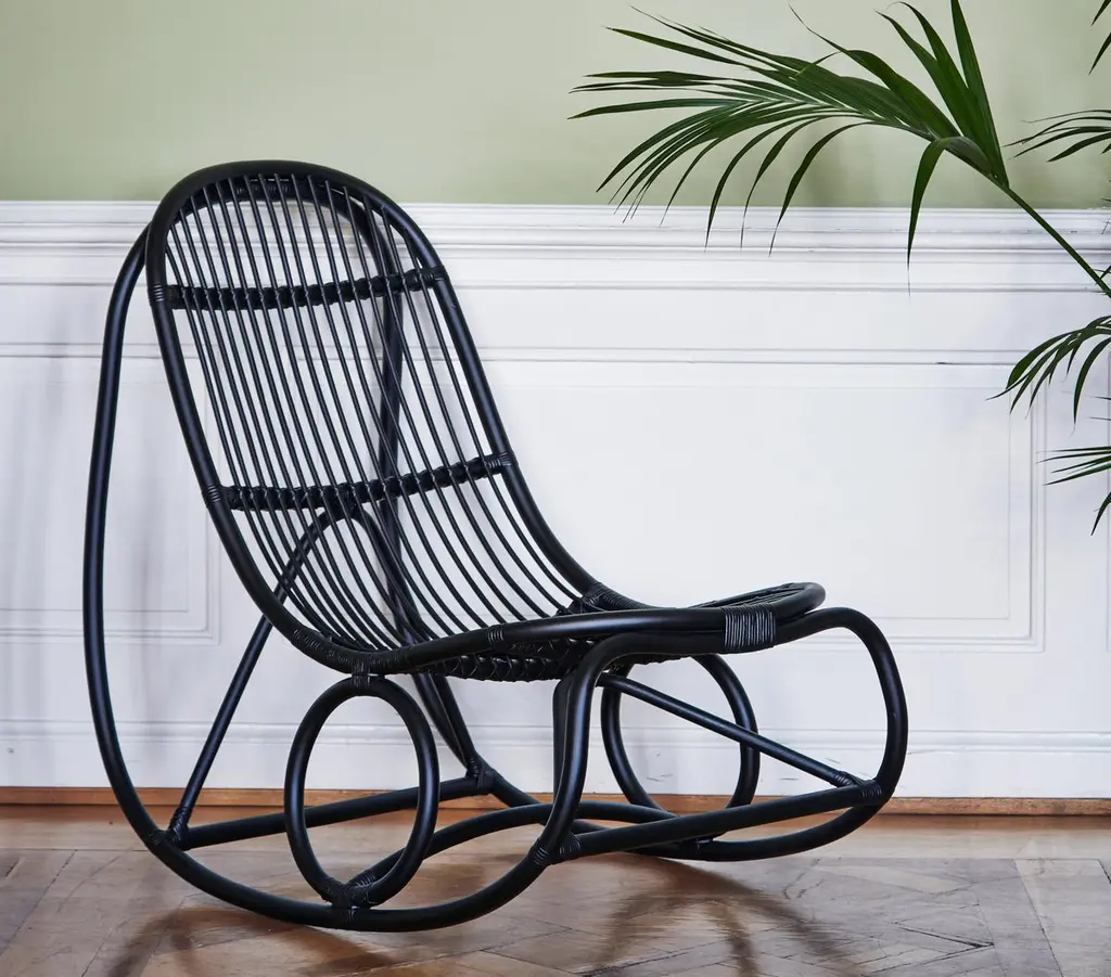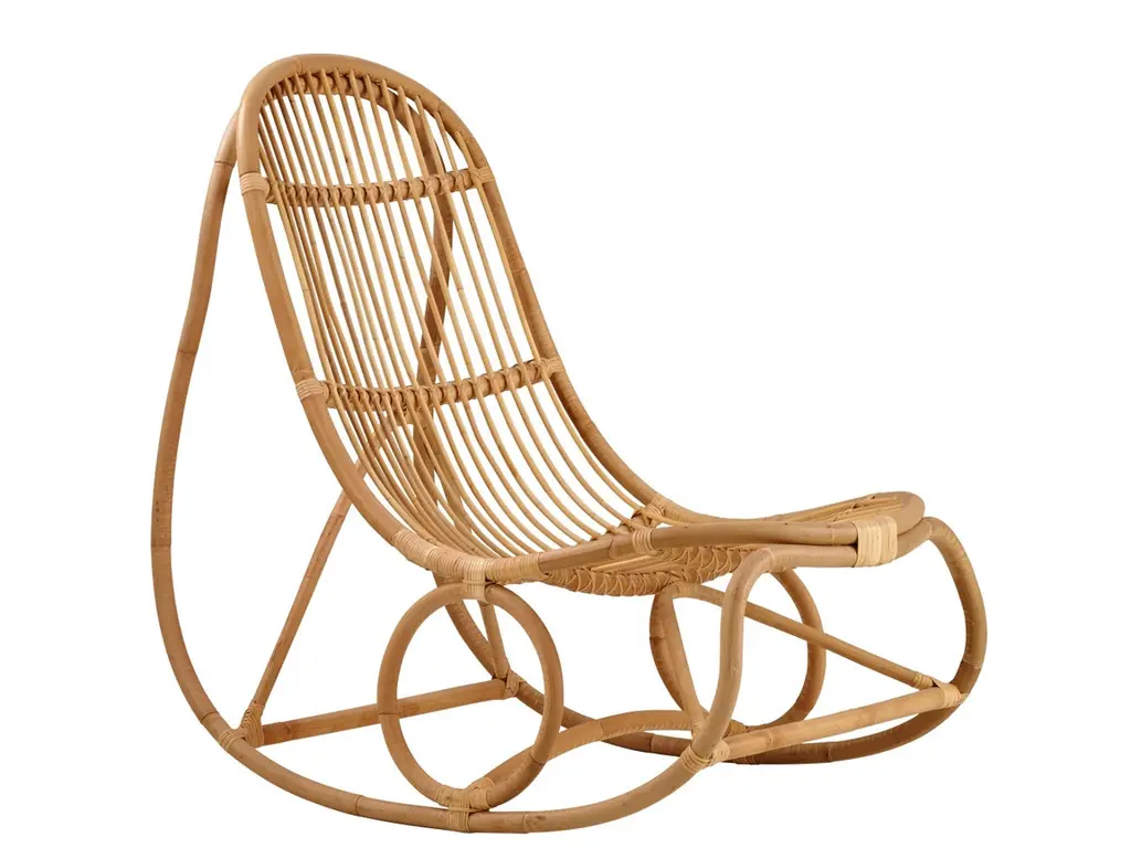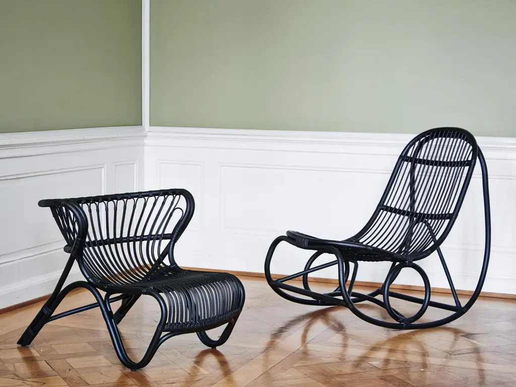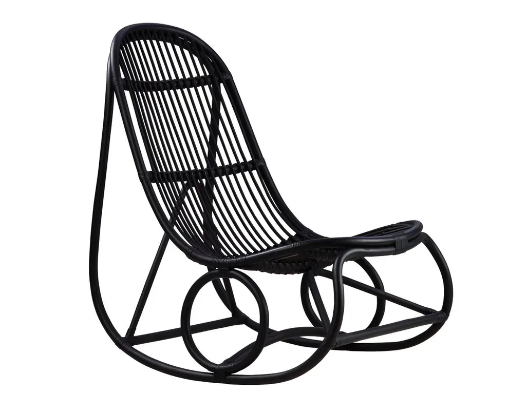 Scandinavian rocking chair model Nanny by Nanna Ditzel.New edition. Nanna Ditzel trained as a cabinetmaker before studying at the School of Arts and Crafts and then at the Royal Academy of Fine Arts in Copenhagen. She left in 1946, and the same year she founded her own design studio with her husband Jorgen Ditzel.The particular and ergonomic shape of this rattan rocking chair ensures excellent comfort. Nanny is available in natural rattan and matte black rattan.