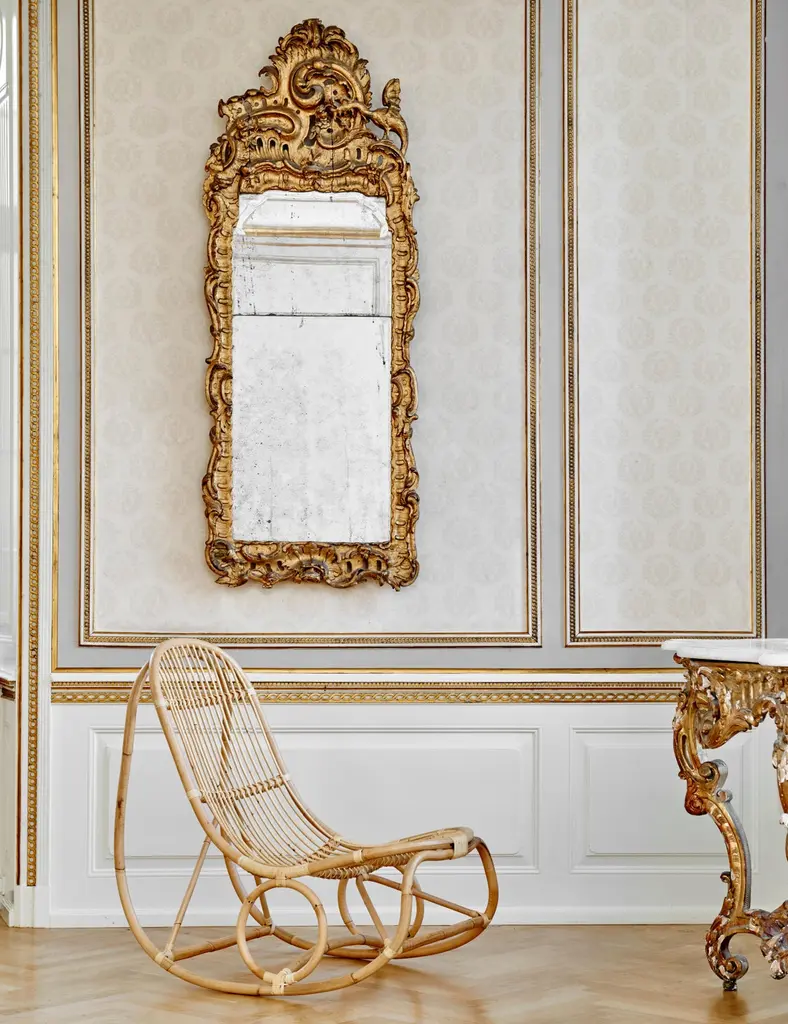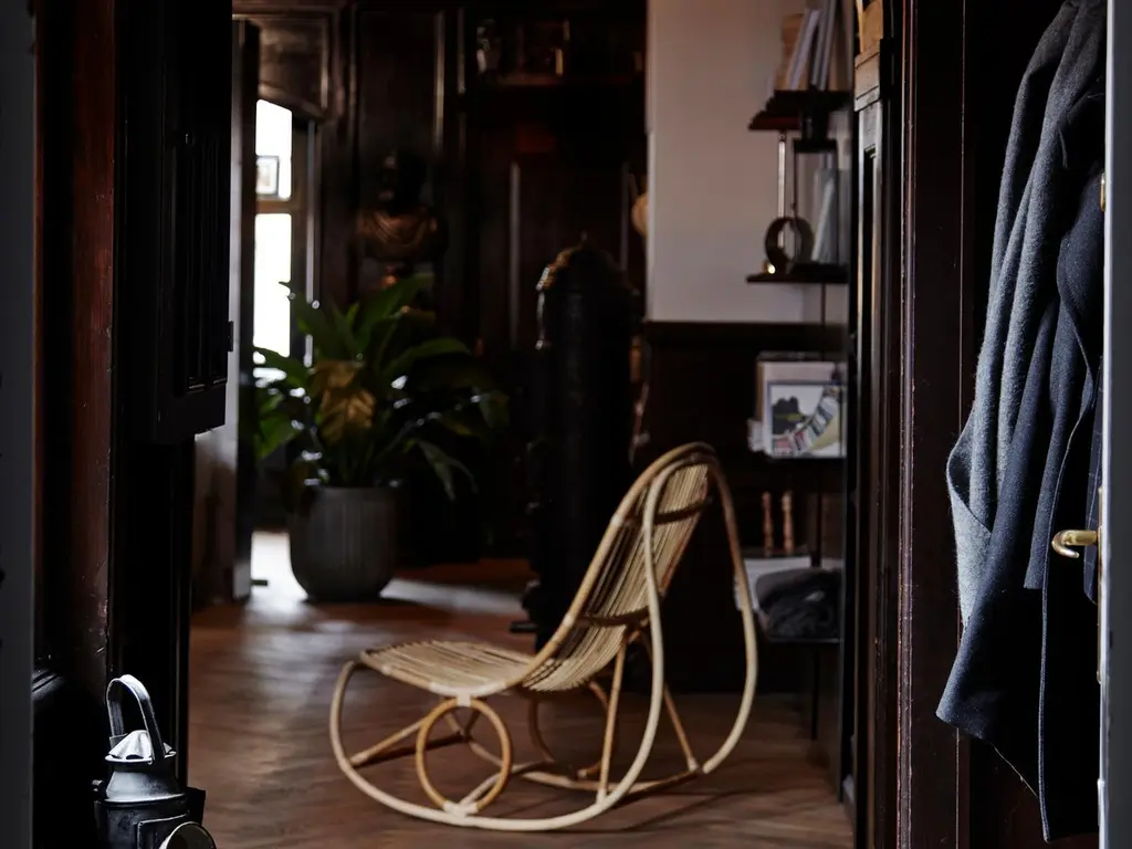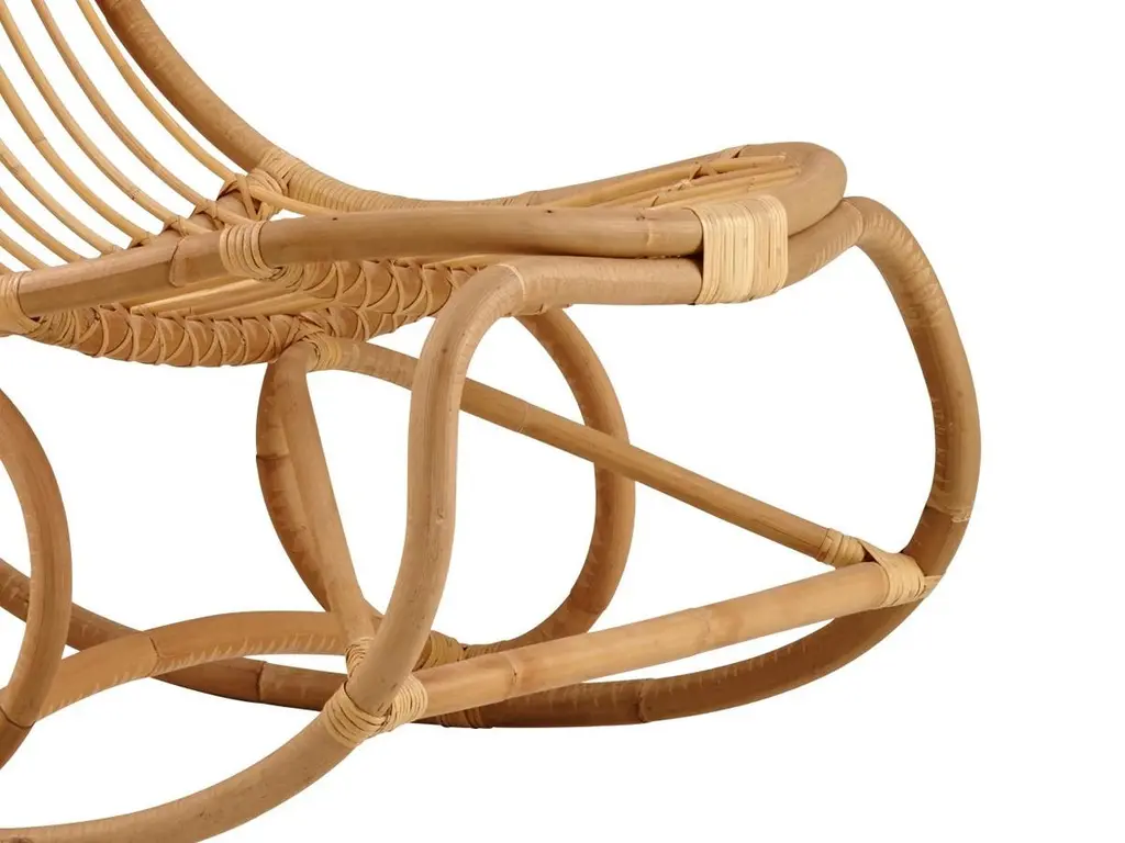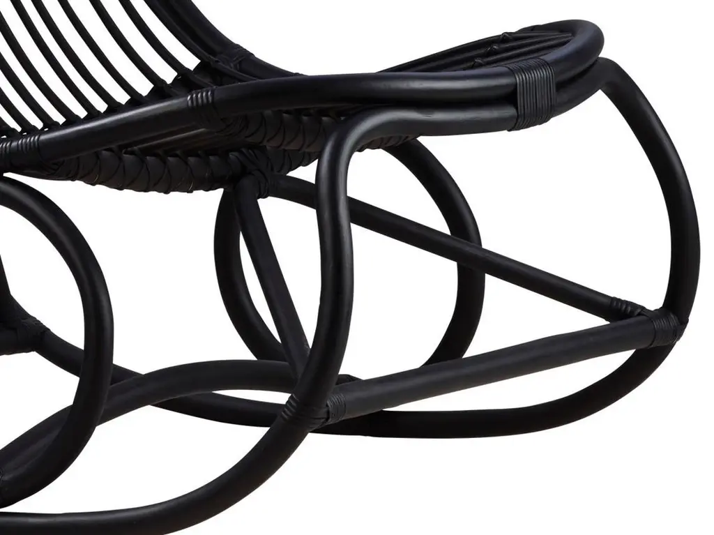 Scandinavian rocking chair model Nanny by Nanna Ditzel.New edition. Nanna Ditzel trained as a cabinetmaker before studying at the School of Arts and Crafts and then at the Royal Academy of Fine Arts in Copenhagen. She left in 1946, and the same year she founded her own design studio with her husband Jorgen Ditzel.The particular and ergonomic shape of this rattan rocking chair ensures excellent comfort. Nanny is available in natural rattan and matte black rattan.