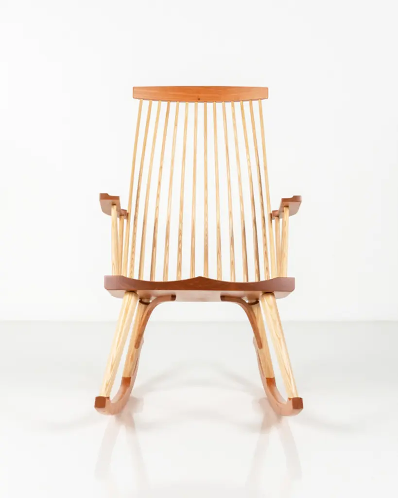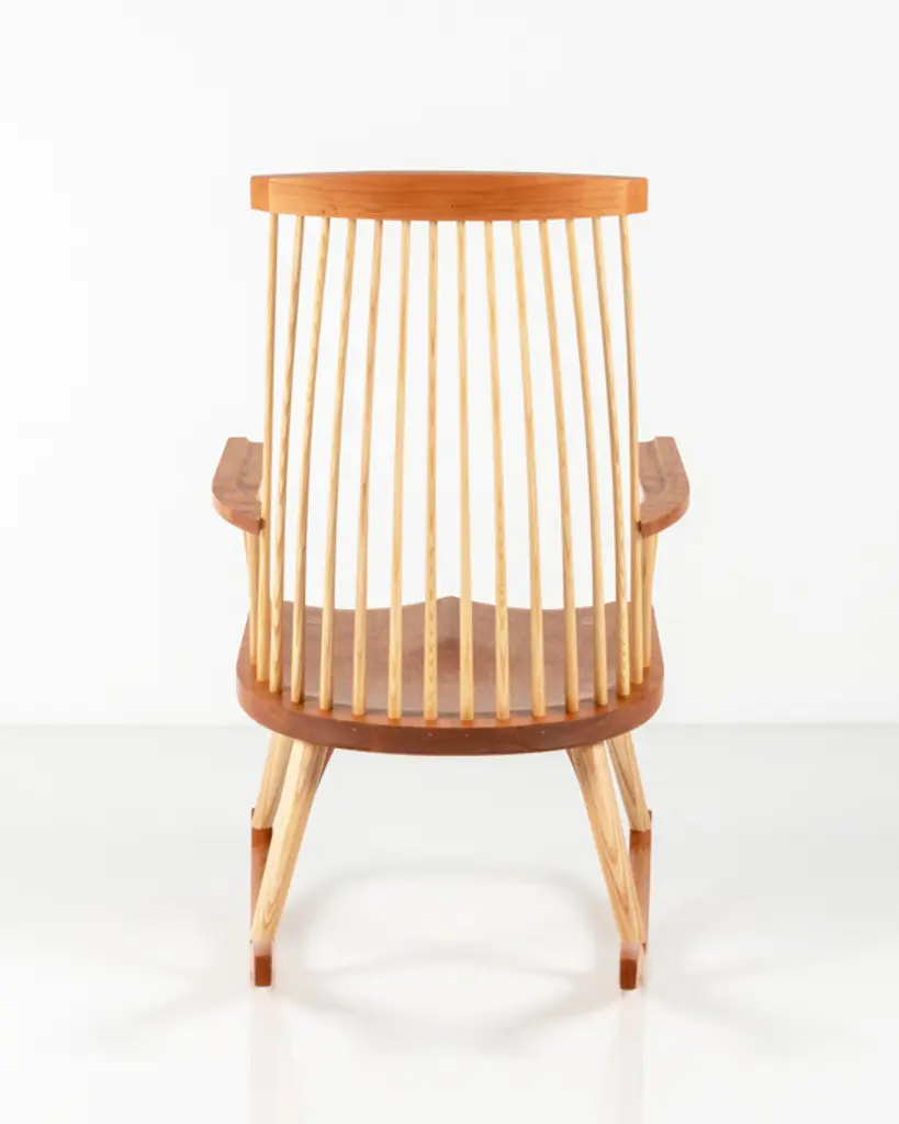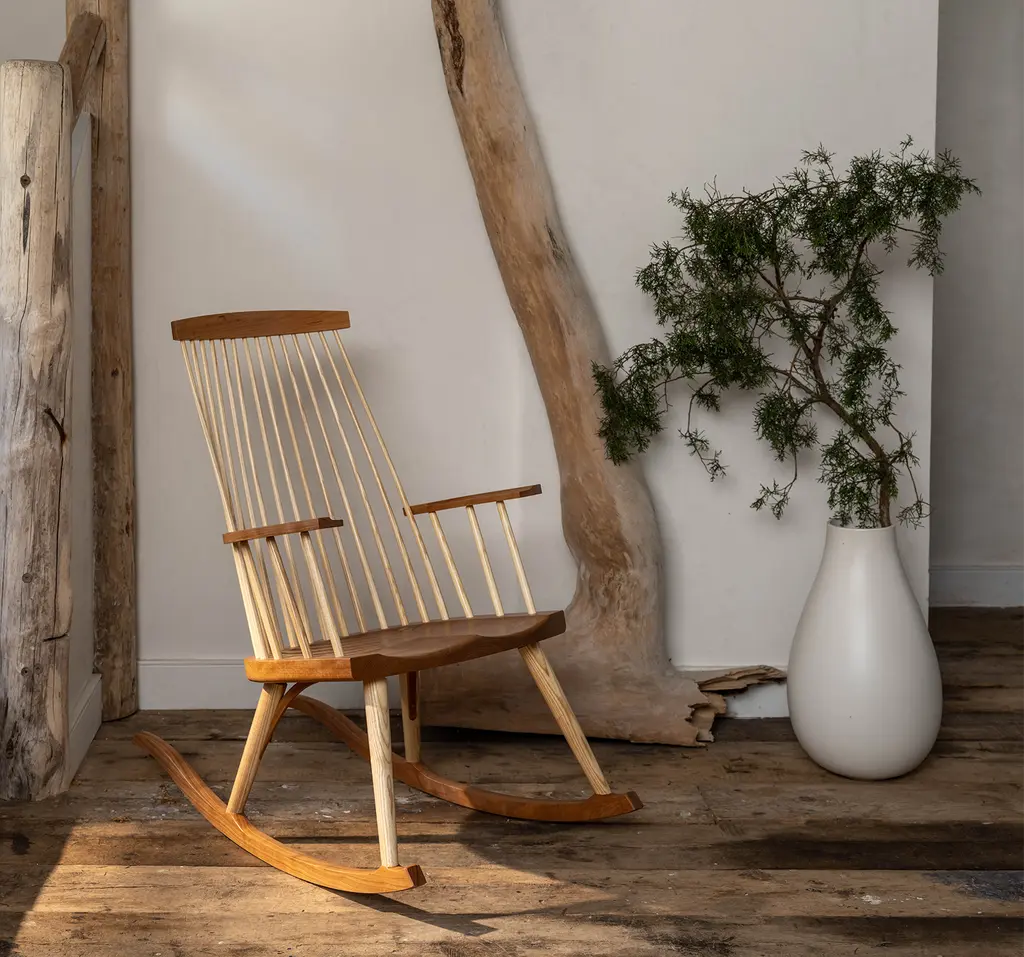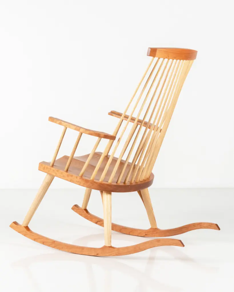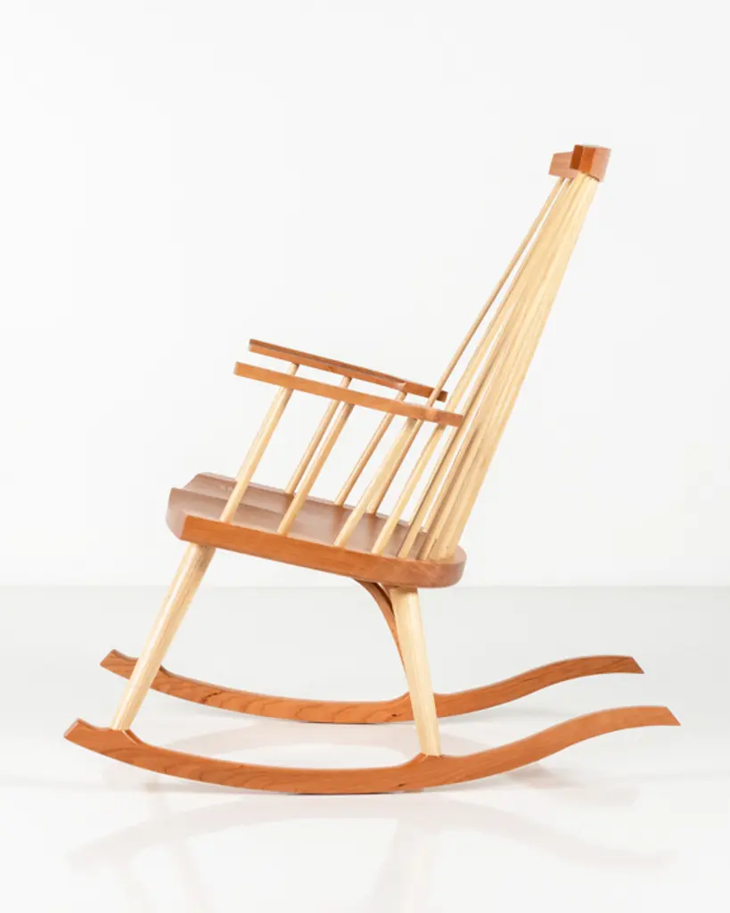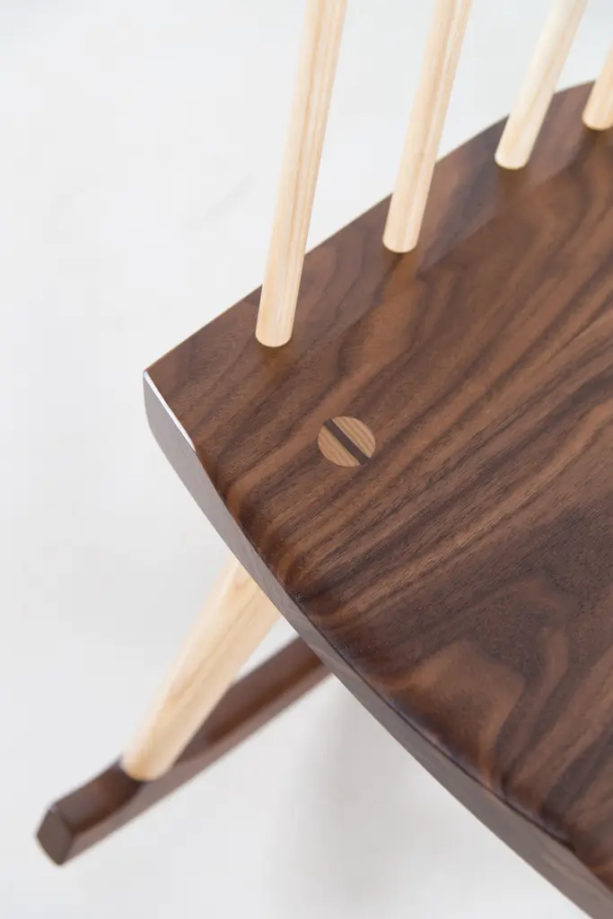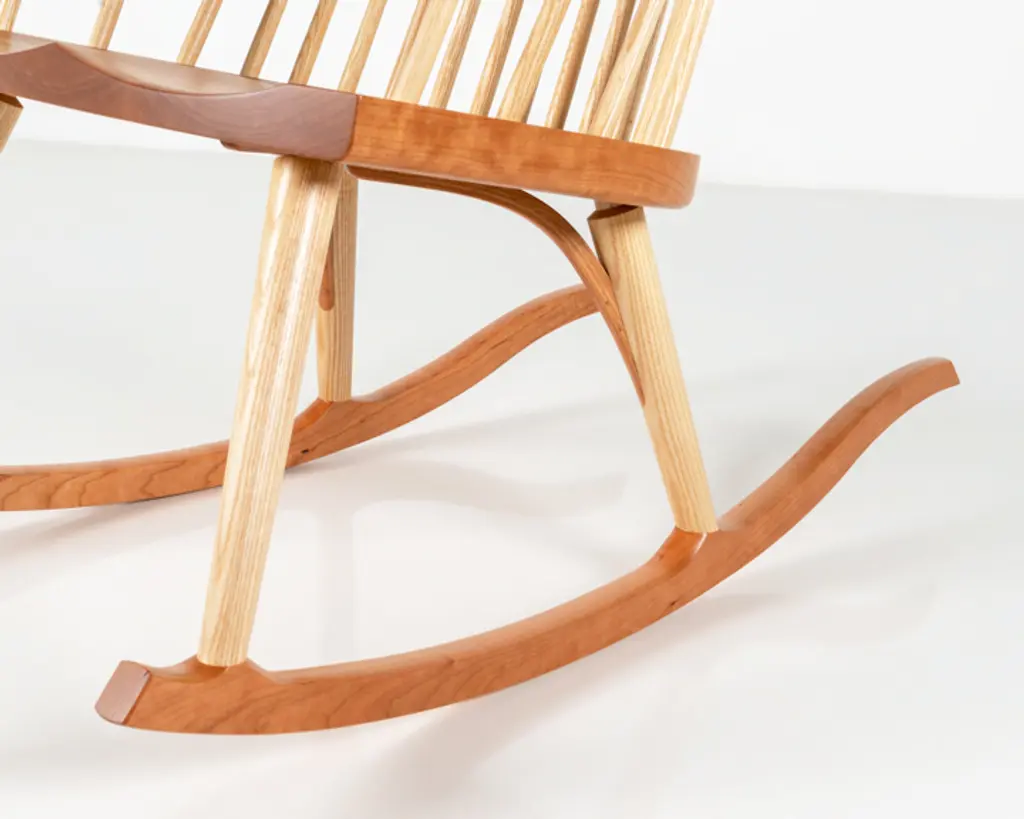 Inspired by the aesthetic appeal of the Salem rocker that originated in New England circa 1840, Tom started with an adapted form of the deep, comfortable rocker seat, added his own spindle and arm design to create his first prototype, and kept refining from there. The result is a thoughtful integration of ash and cherry or walnut with simple lines, and meticulous use of traditional mortise-and-tenon joinery.