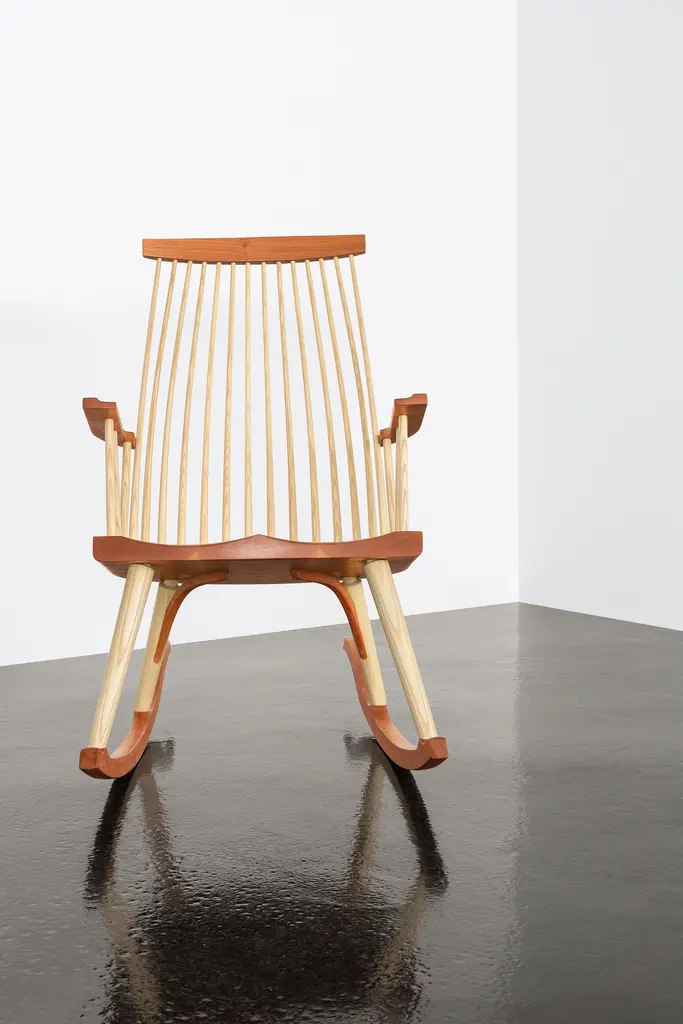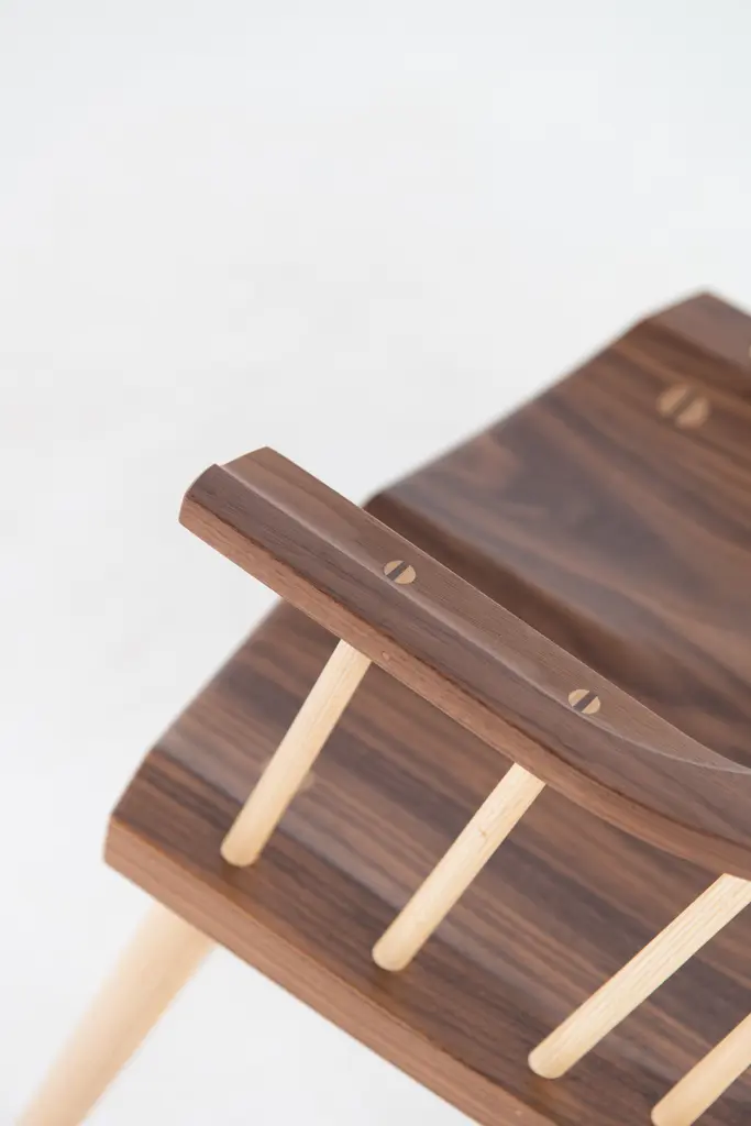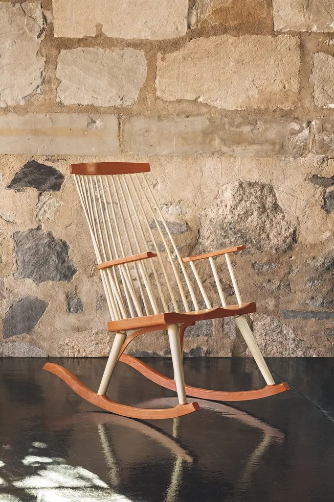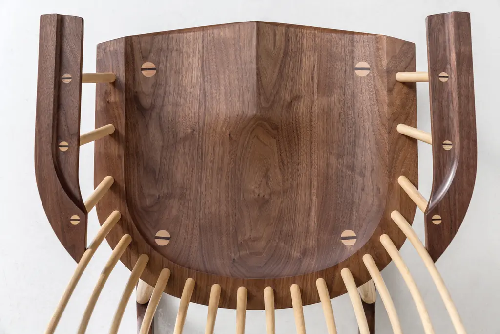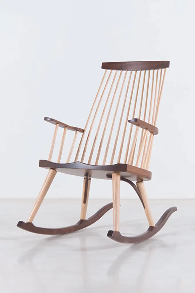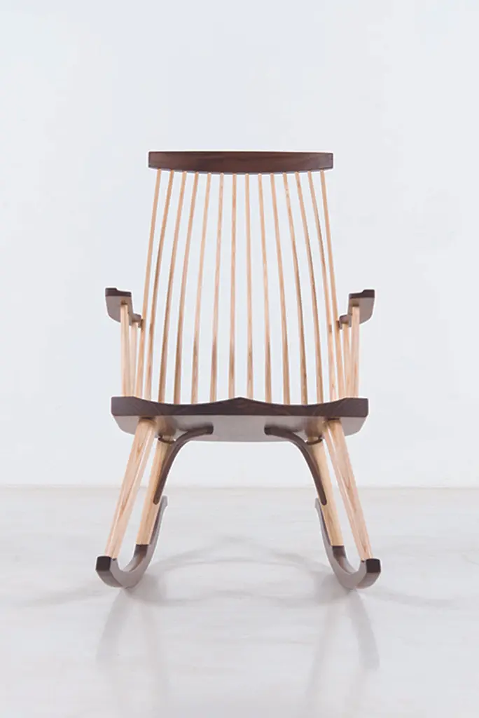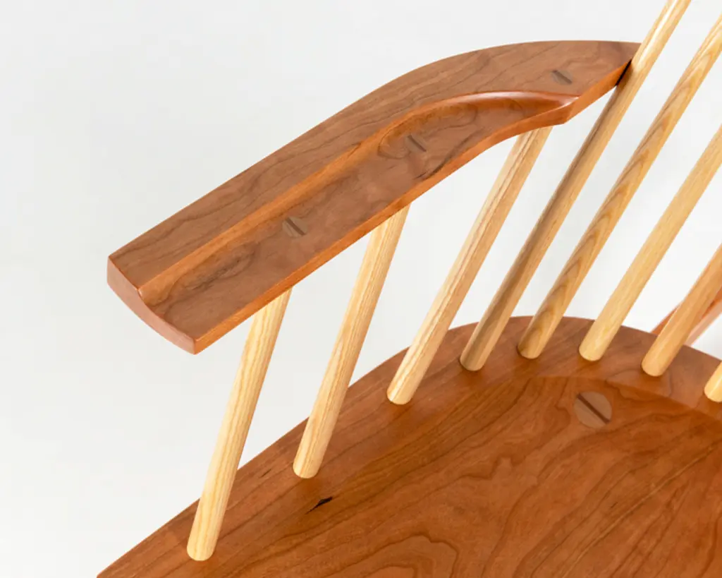 Inspired by the aesthetic appeal of the Salem rocker that originated in New England circa 1840, Tom started with an adapted form of the deep, comfortable rocker seat, added his own spindle and arm design to create his first prototype, and kept refining from there. The result is a thoughtful integration of ash and cherry or walnut with simple lines, and meticulous use of traditional mortise-and-tenon joinery.