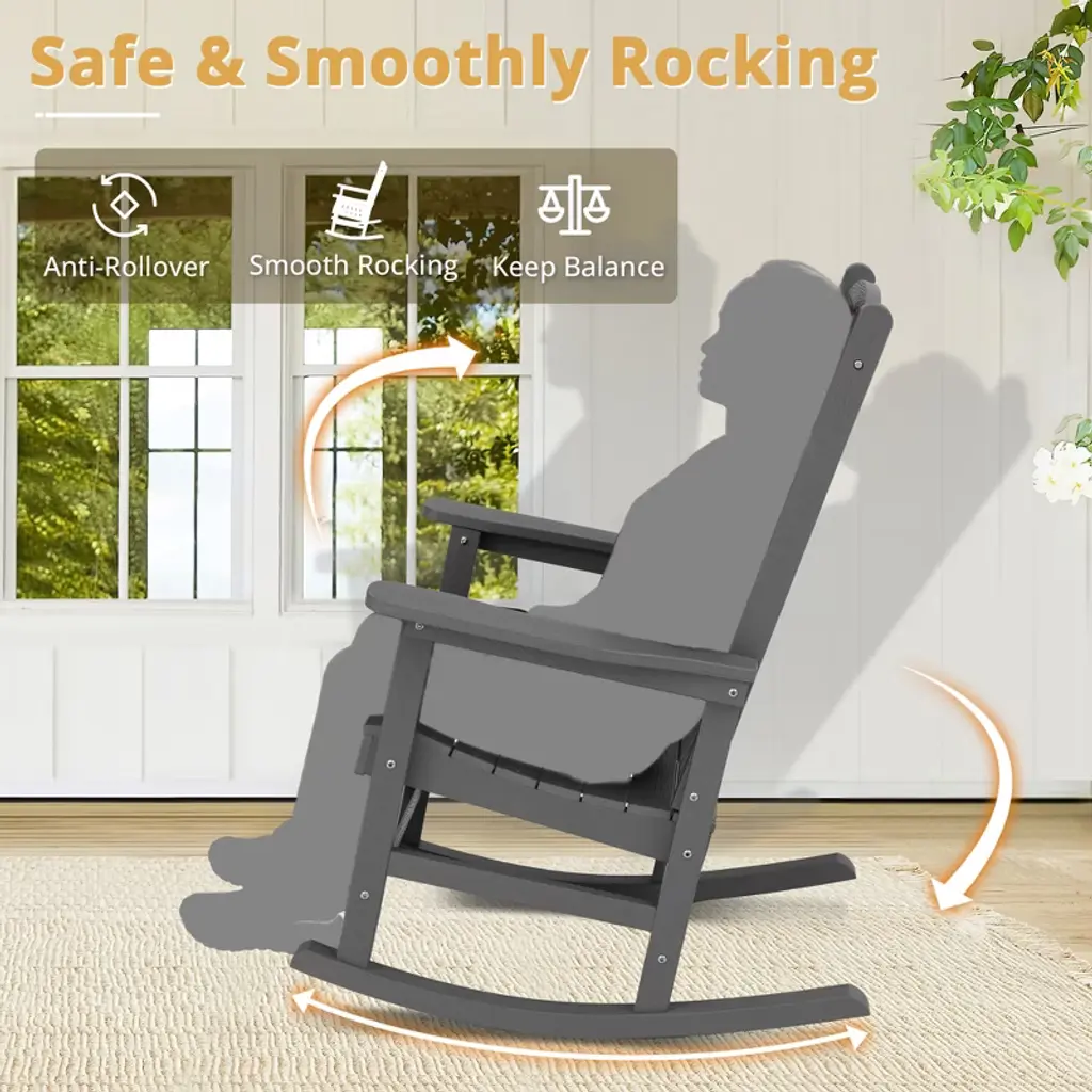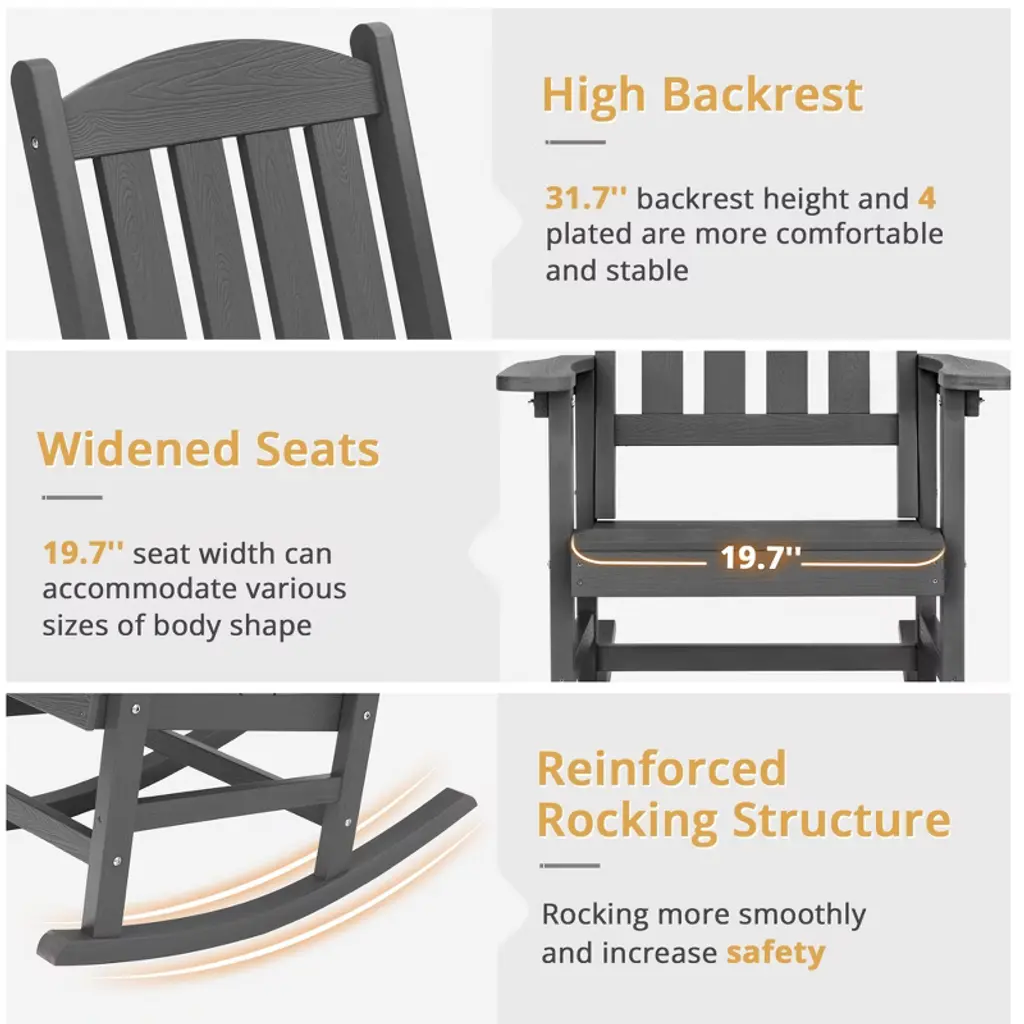Weather Resistance: The rocking chair is crafted with HDPS with excellent durability which will not fade, crack, peel; It can withstand various environmental pressures, including sun, snow and strong wind, the 304 stainless steel screws connected make the chair more long-lasting Maximum Comfort: Boasting dimensions of 35.2'' D x 25.9’’ W x 41.7’’ H, this patio rocking chair offers an extra higher 31.7’’ raised backrest that relieves any tension in your neck; 19.7’’ wide seat is contoured to support a natural sitting position; the smooth slat corners prevent accidental bumps Anti-Rollover: The porch rocker features four supporting points with cross bars, these front porch rocking chairs evenly disperse the pressure to each point; the accurate calibration of the rocking radian ensures personal safety, enhances balance, and achieves ultimate relaxation Modern Style: The rocking chair is a simple and elegant style that can blend perfectly into any decor; the anti-wood surface with classic color adds movement and lightness to the chair; you can sit on it to enjoy leisure time in the living room, garden, patio, balcony, and other areas Easy to Assemble and Maintain: Clear instructions and high-quality hardware make assembly very easy; no need to paint or stain during maintenance, just clean with soap, water, and a soft brush or sponge, no other maintenance is required