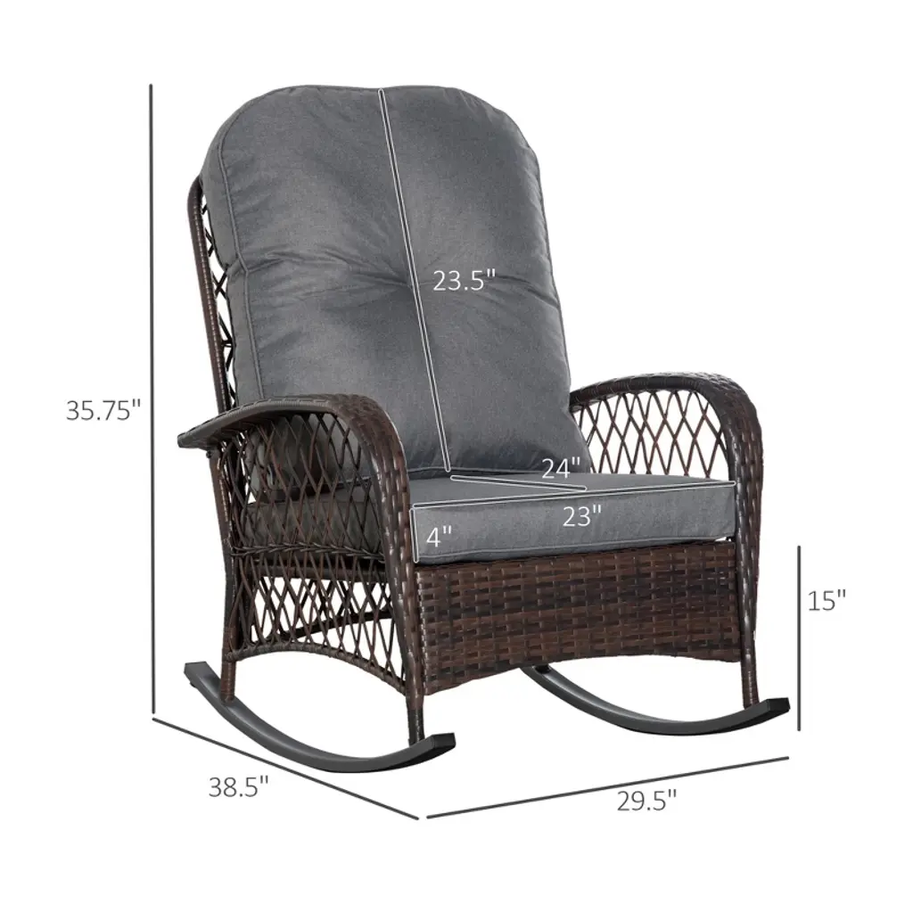 Plush Seating: A classic staple of outdoor furniture, this handwoven rattan rocking chair can provide form and function to any porch. Designed to pair with any patio, this plush porch rocker features soft neutral tones and a rustic natural look. Outdoor Ready: Crafted from PE plastic wicker and a heavy-duty steel frame to withstand water and wear, this porch rocker was made with outdoor in mind. Also, the cushion covers zip on and off so you can quickly spot them when needed. Safe Rocker: This rocking chair doesn't just look pretty on the patio it also stops you from slipping and sliding while you rock. You won't have to worry about falling down while sitting down with its anti-slip bottom strip. A chair featuring a steel frame capable of a 352 lbs. weight capacity, stay sitting soundly. All-Weather Set: Our outdoor sectional furniture set is made with handwoven PE rattan, a material with all the tropical style of classic wicker with superior resistance to UV and weather. Also, a water-safe powder-coated steel frame reinforces the sofa, allowing for a high weight capacity. Cushioned Rocking Chair Info: Overall Dimensions: 29.5" W x 38.5" D x 35.75" H.