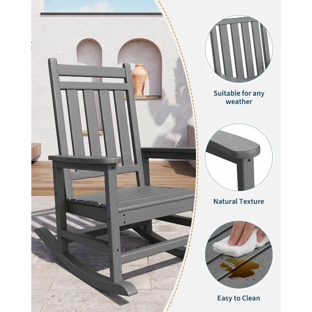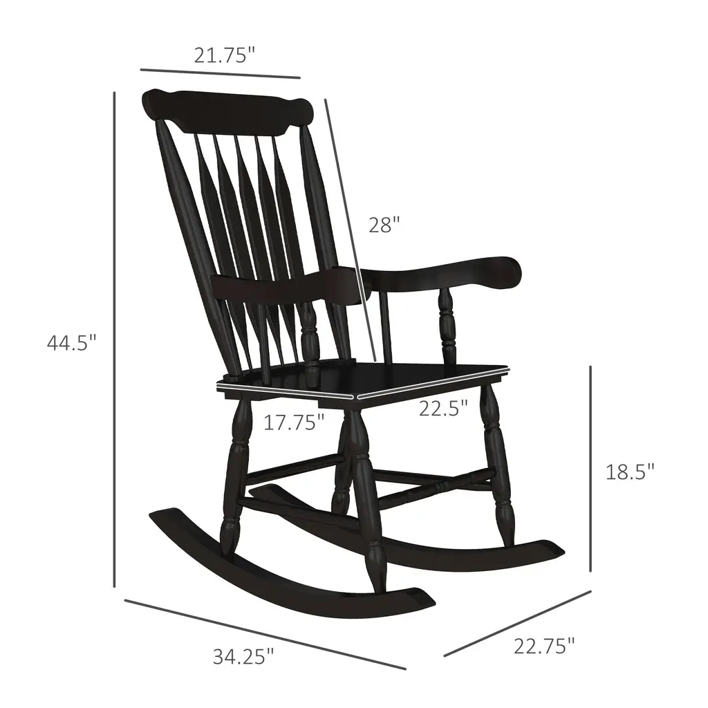 Wooden Outdoor Rocking Chair: Sway smoothly through the breeze. Our patio rocking chair has a strong, thoughtfully curved base with a safe rocking range (98-158°).Comfy Porch Rocker: With a wide seat, a tilted back, and armrests to wrap you all around, our outdoor rocker is built to bring classic comforts to your patio, porch, yard, or garden.Outdoor Ready Wood: Crafted from solid poplar wood sealed with a polyurethane finish, this outdoor rocking chair is resistant to water and problems from UV, such as yellowing, making it excellent for outdoor use.A Classic Look: Few things can pair with a porch as well as a wooden rocking chair. A classic staple of outdoor spaces everywhere, wood offers a charm that is equally applicable for living rooms, porches, decks, and balconies.