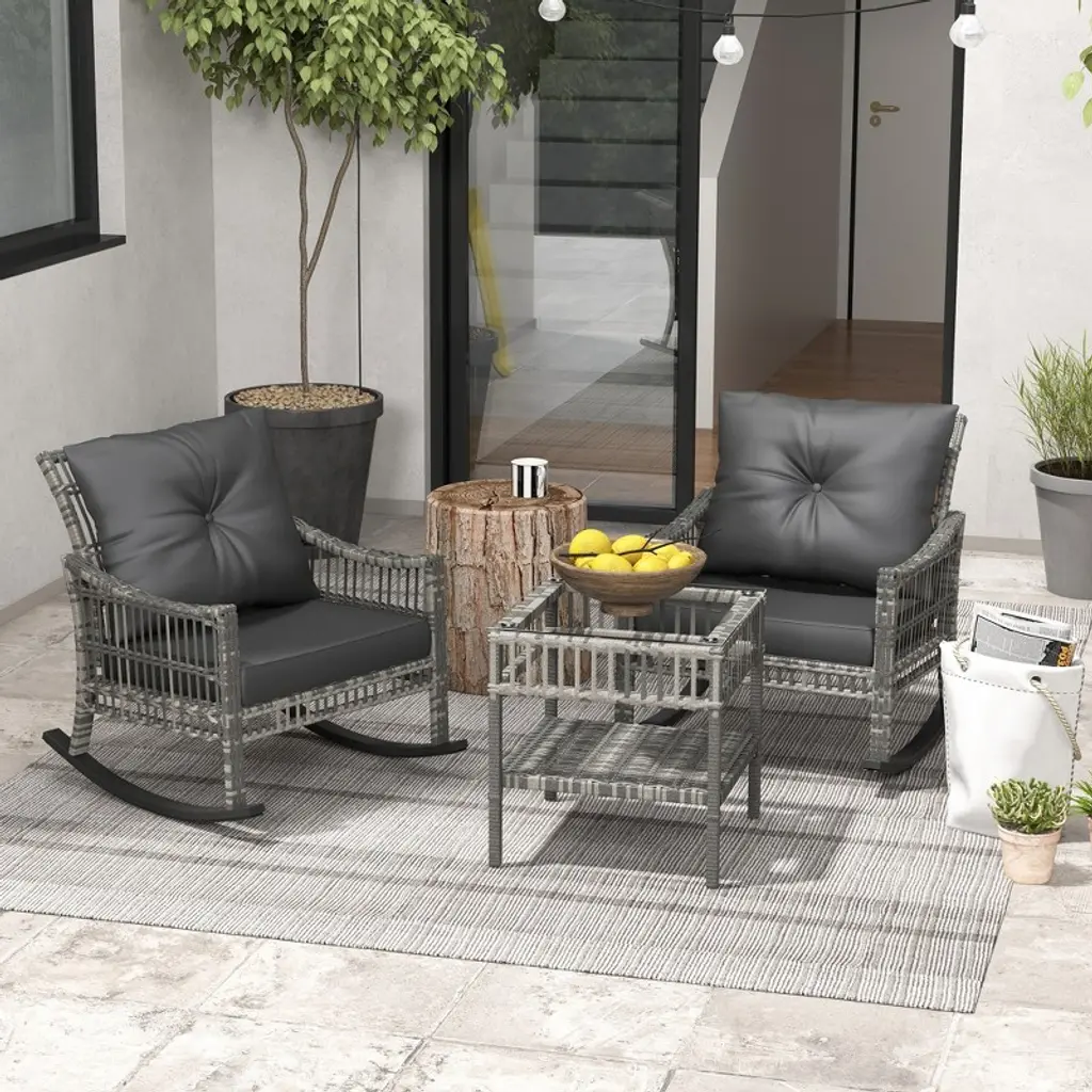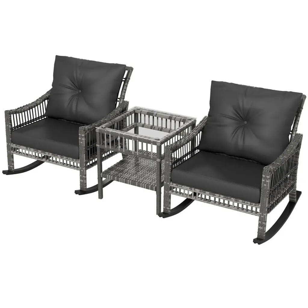 Outsunny Wicker Outdoor Rocking Chair Set, 3 Piece Patio Furniture Set With Padded Cushions And Storage Table, 2-seater Rattan Bistro Set, Gray