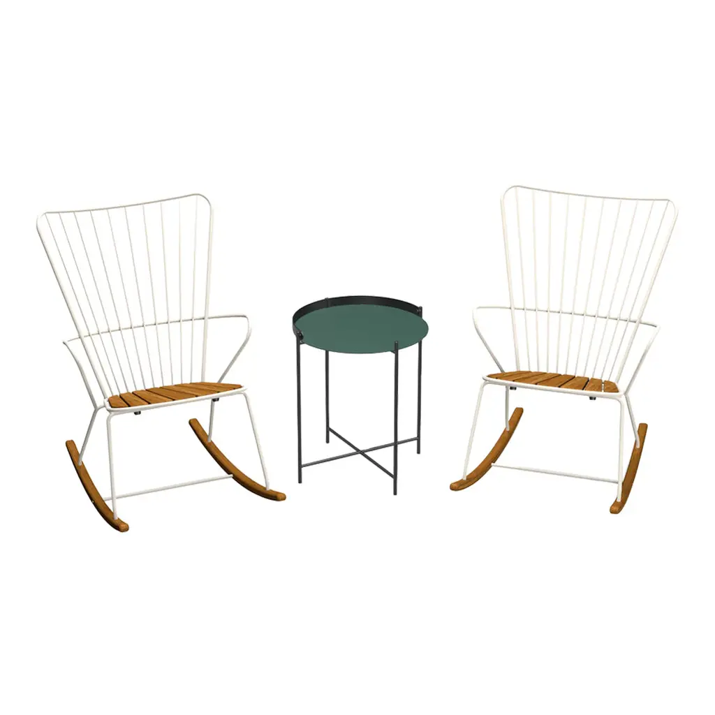 Note: The PAON Outdoor Rocking Chair cushion is sold separately. PAON is light Scandinavian in its design but with a touch of French Victorian romance. The PAON line consists of dining chairs, Lounge chair, Rocking chair, a two seater Bench and a Bar chair. Made in powder coated steel combined with beautiful bamboo lamellas. The PAON chair has a seating comfort which you would not expect from a metal chair!