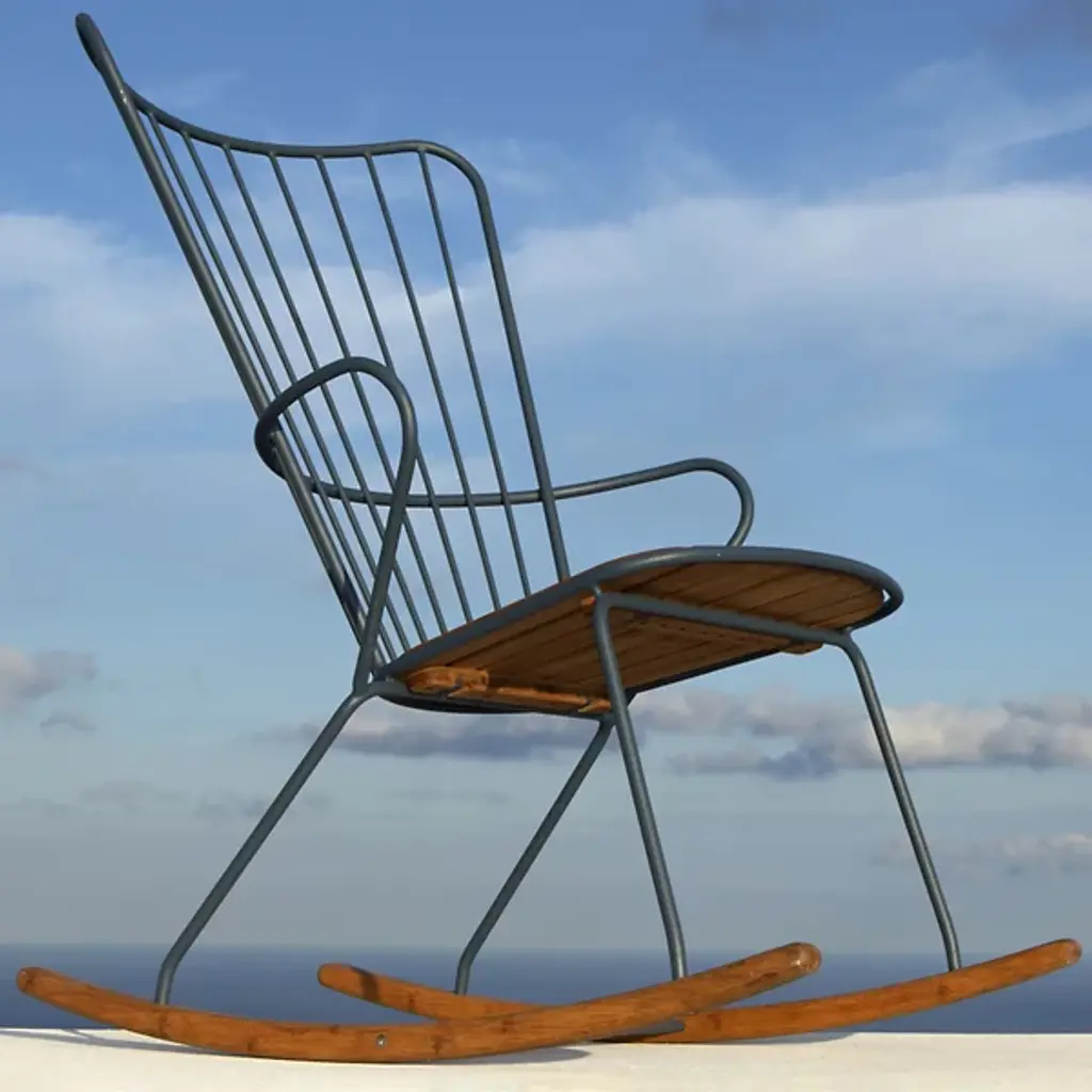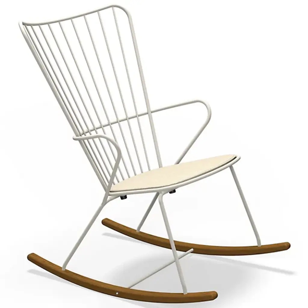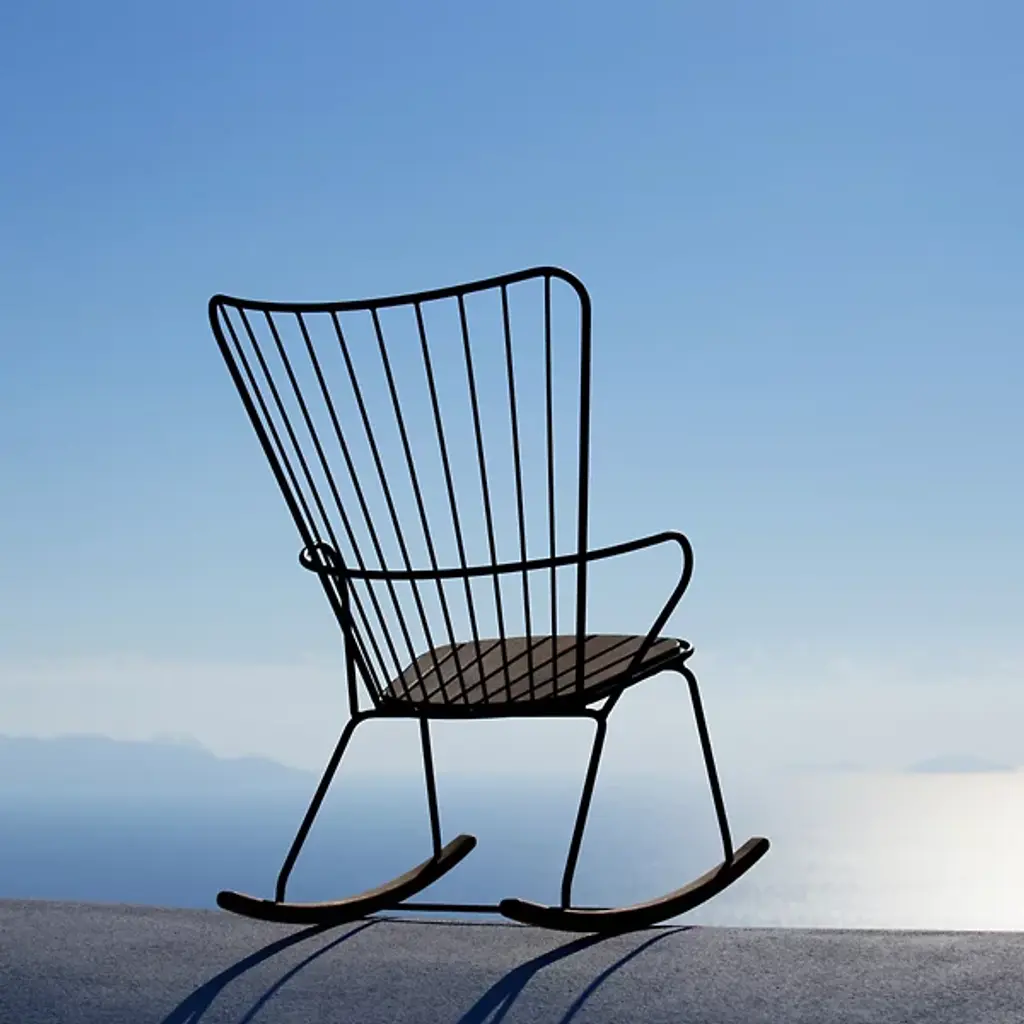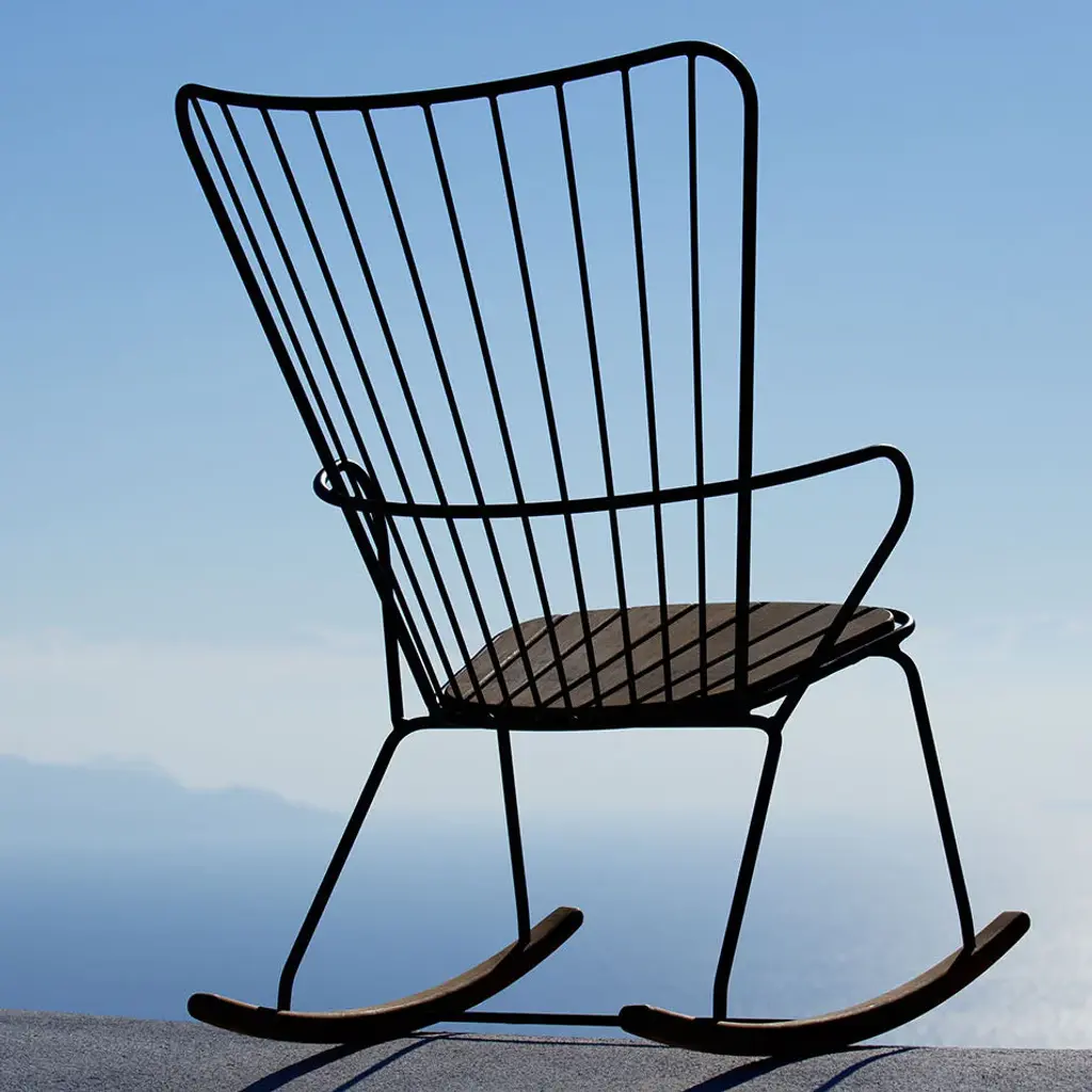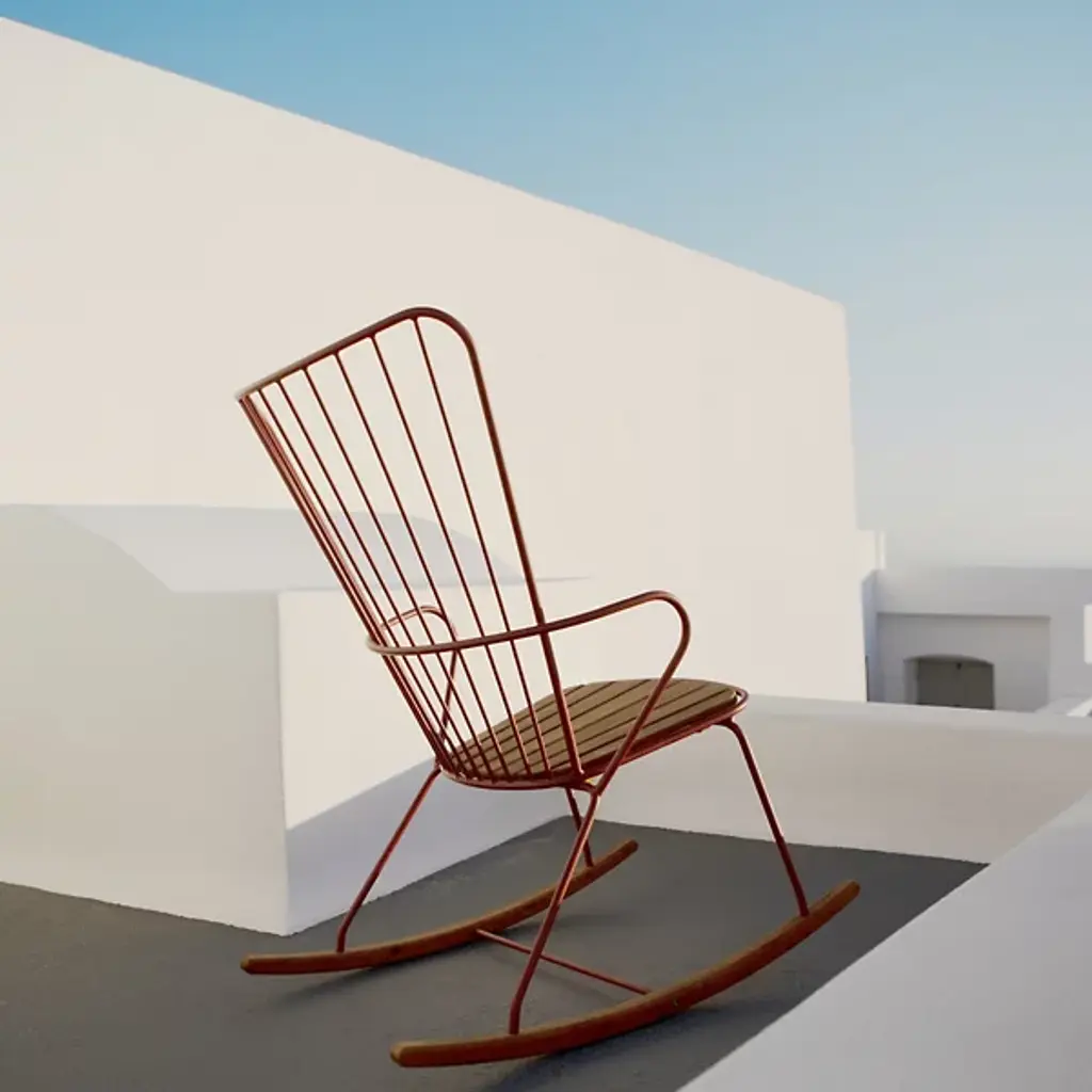 The PPaon Outdoor Rocking Chair from Houe sets one at ease while in motion and in stillness through its gentle curves modeled after Scandinavian and French Victorian design. The chair’s contoured silhouette impresses from all angles. It sets a relaxed tone with the sweeping curves of its rocking base. Steel rods taper upwards and curve dramatically to create a unified armrest. The tall backrest envelops the body with a pleasant curve to it. It features a linear pattern that allows comfortable air to travel through. The seat rest below pleases with a soft, low-profile shape.