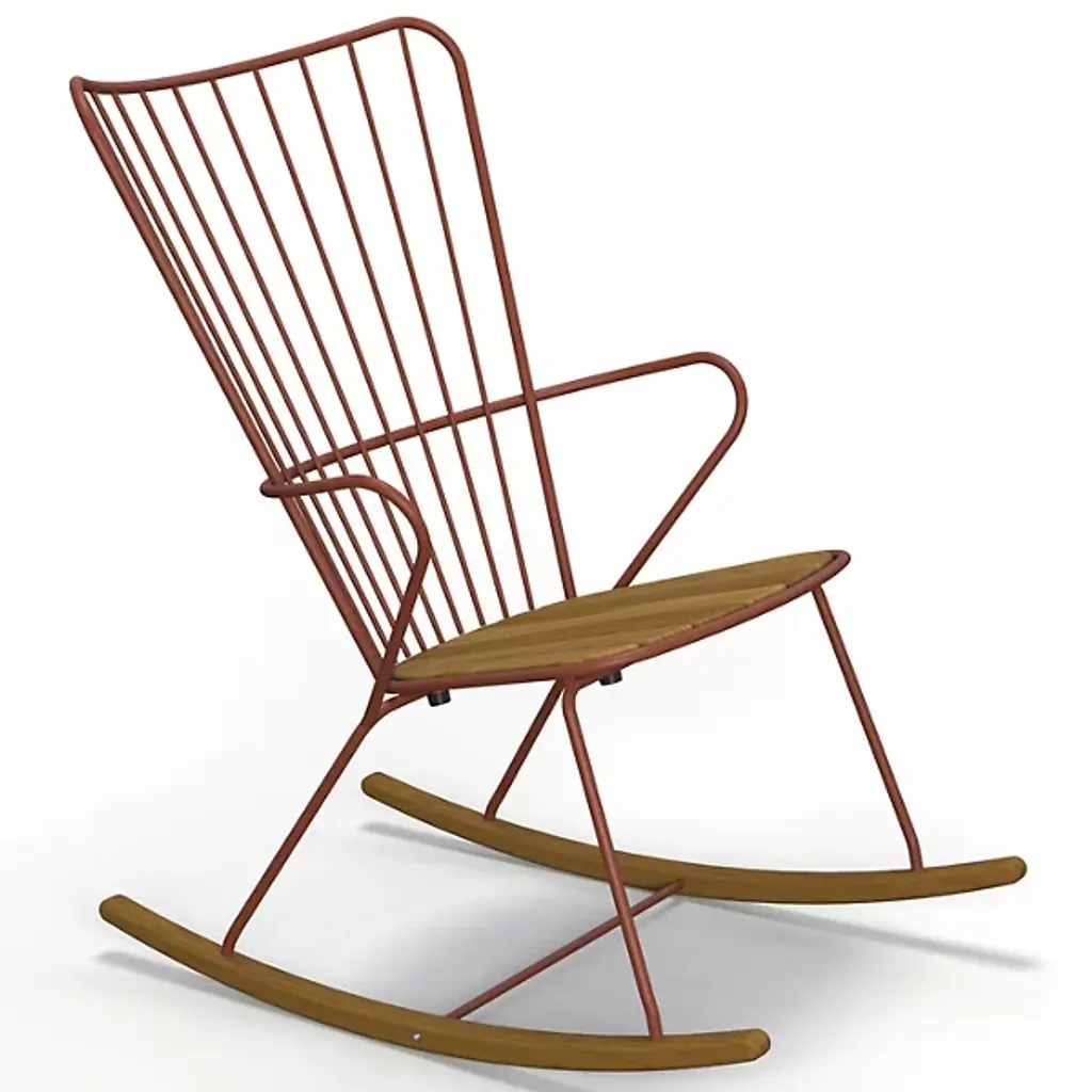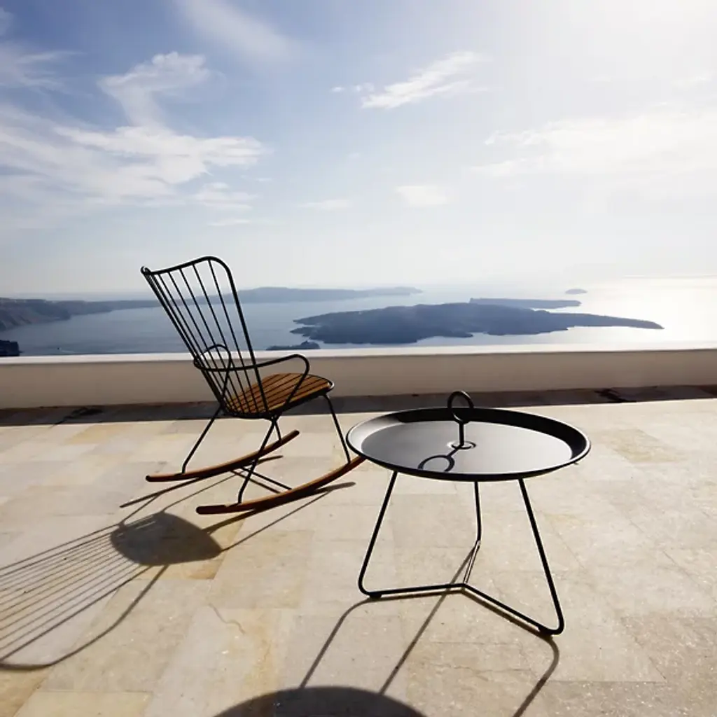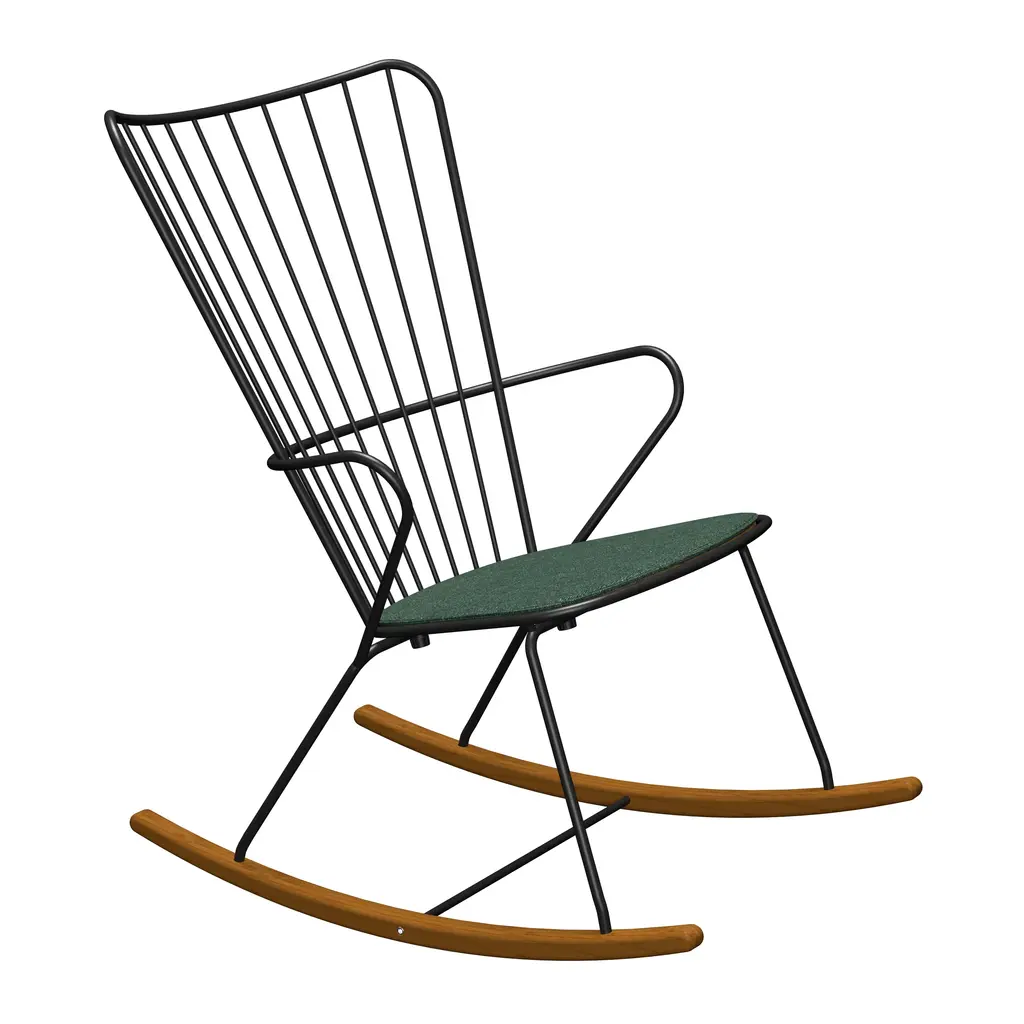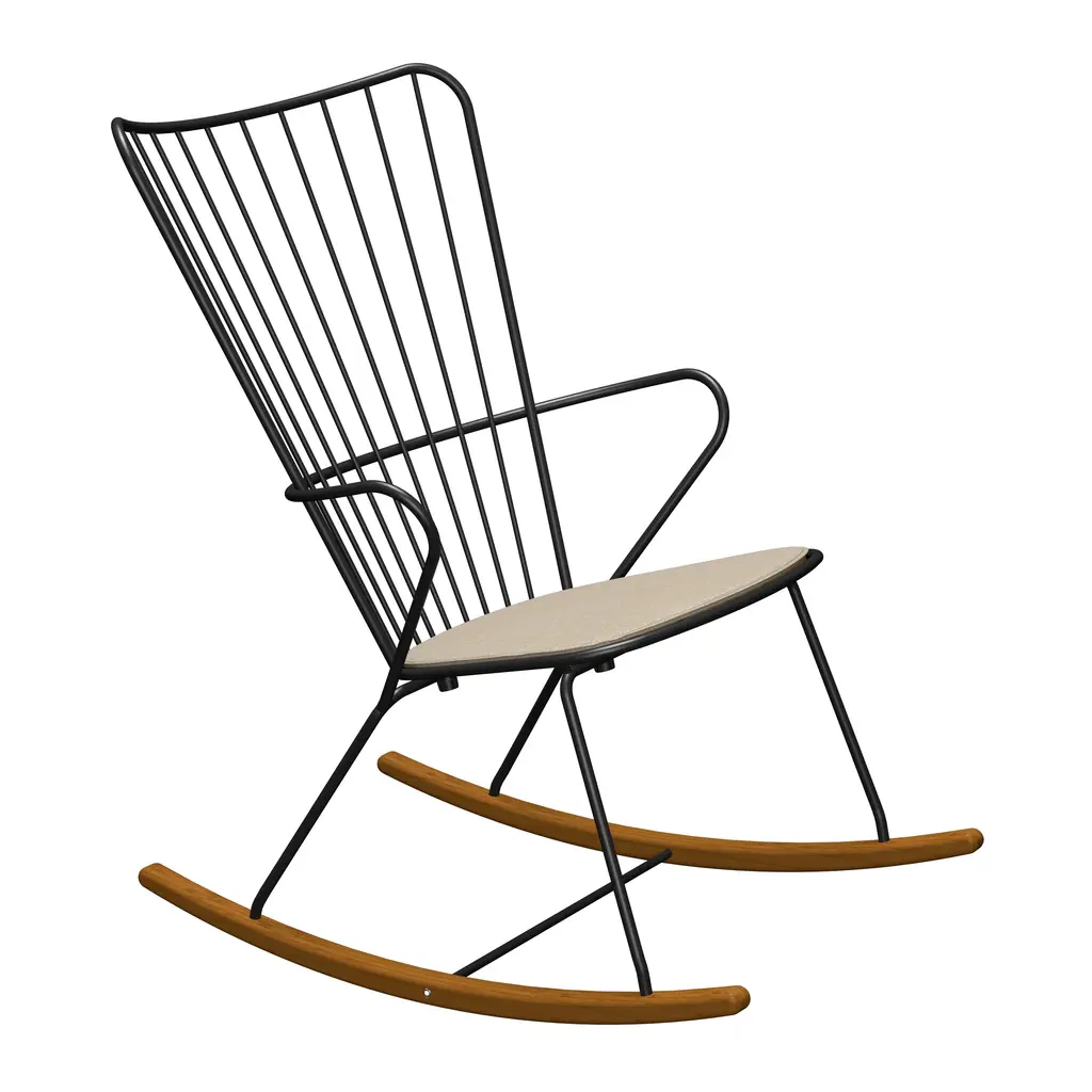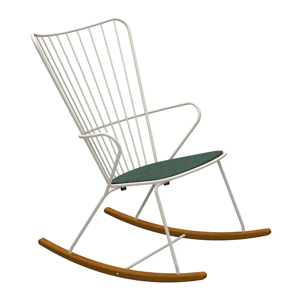The PPaon Outdoor Rocking Chair from Houe sets one at ease while in motion and in stillness through its gentle curves modeled after Scandinavian and French Victorian design. The chair’s contoured silhouette impresses from all angles. It sets a relaxed tone with the sweeping curves of its rocking base. Steel rods taper upwards and curve dramatically to create a unified armrest. The tall backrest envelops the body with a pleasant curve to it. It features a linear pattern that allows comfortable air to travel through. The seat rest below pleases with a soft, low-profile shape.