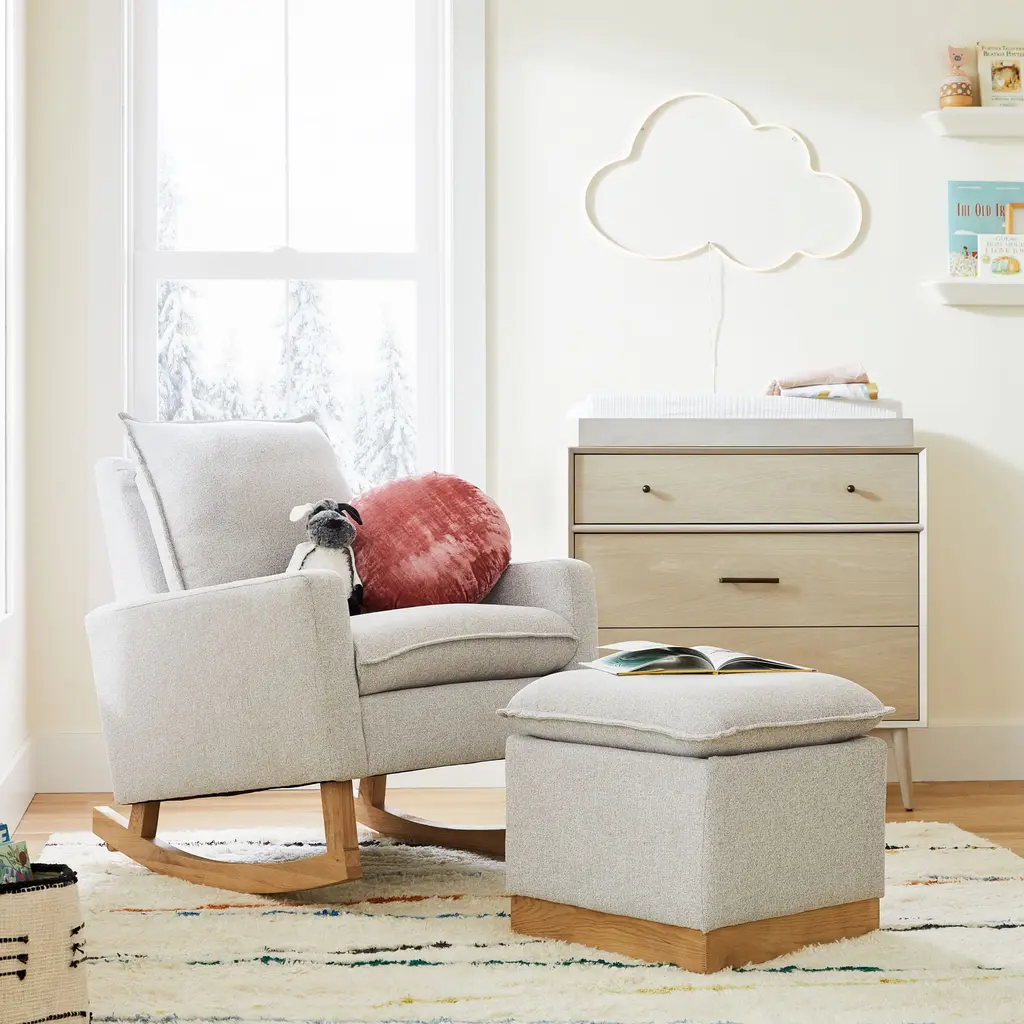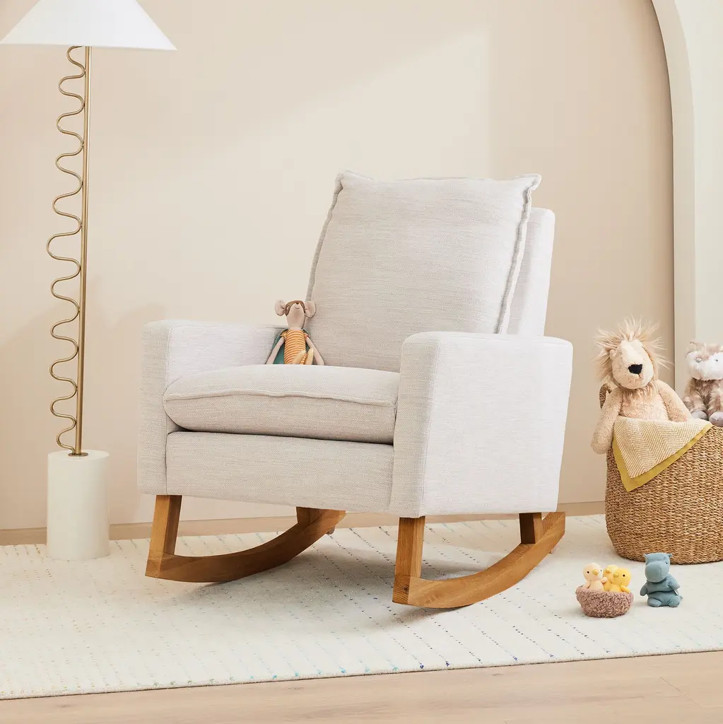 Perfect for nurseries and playrooms. The durable frame with plush cushions. Rockers can be replaced with stationary legs. GREENGUARD Gold Certified as low VOC.