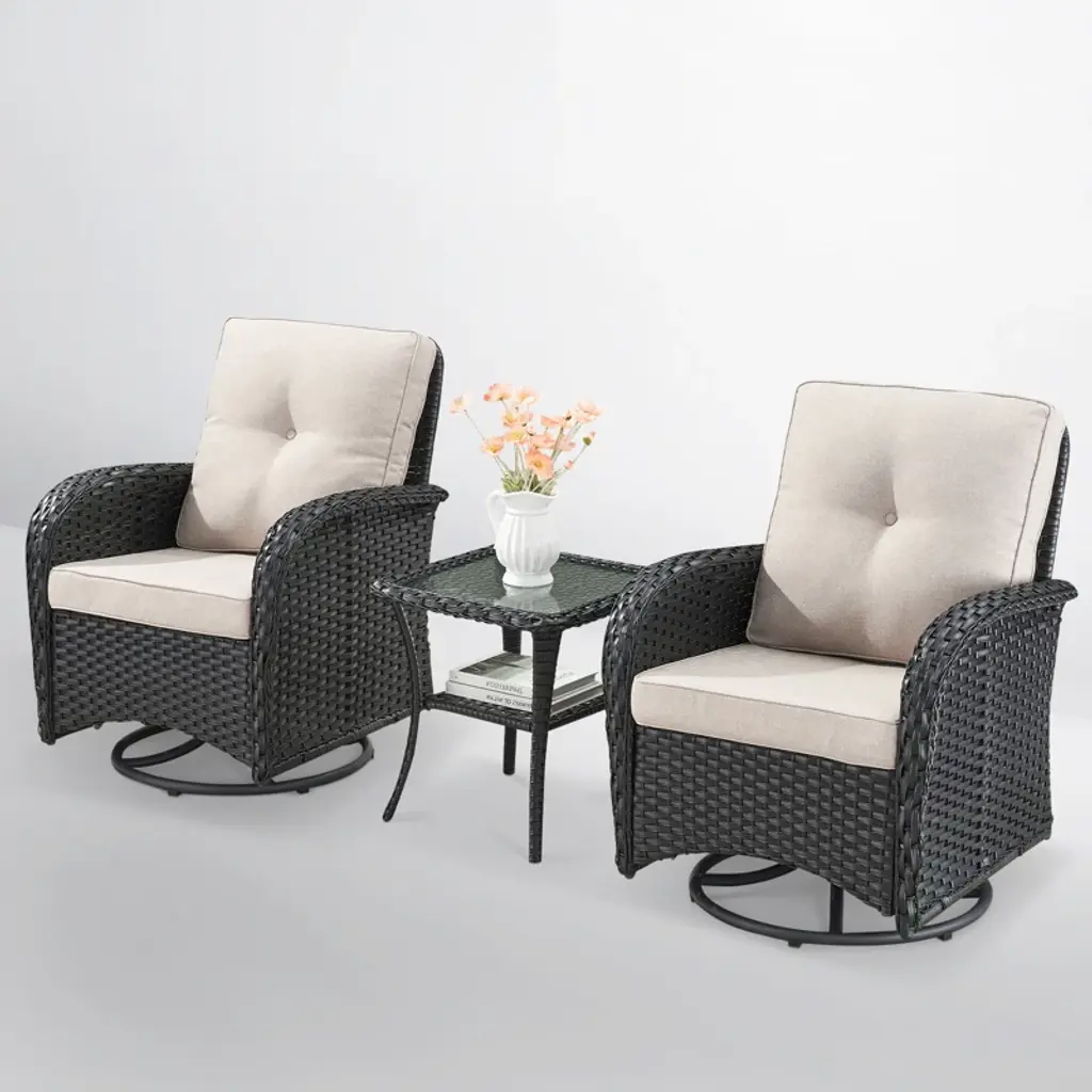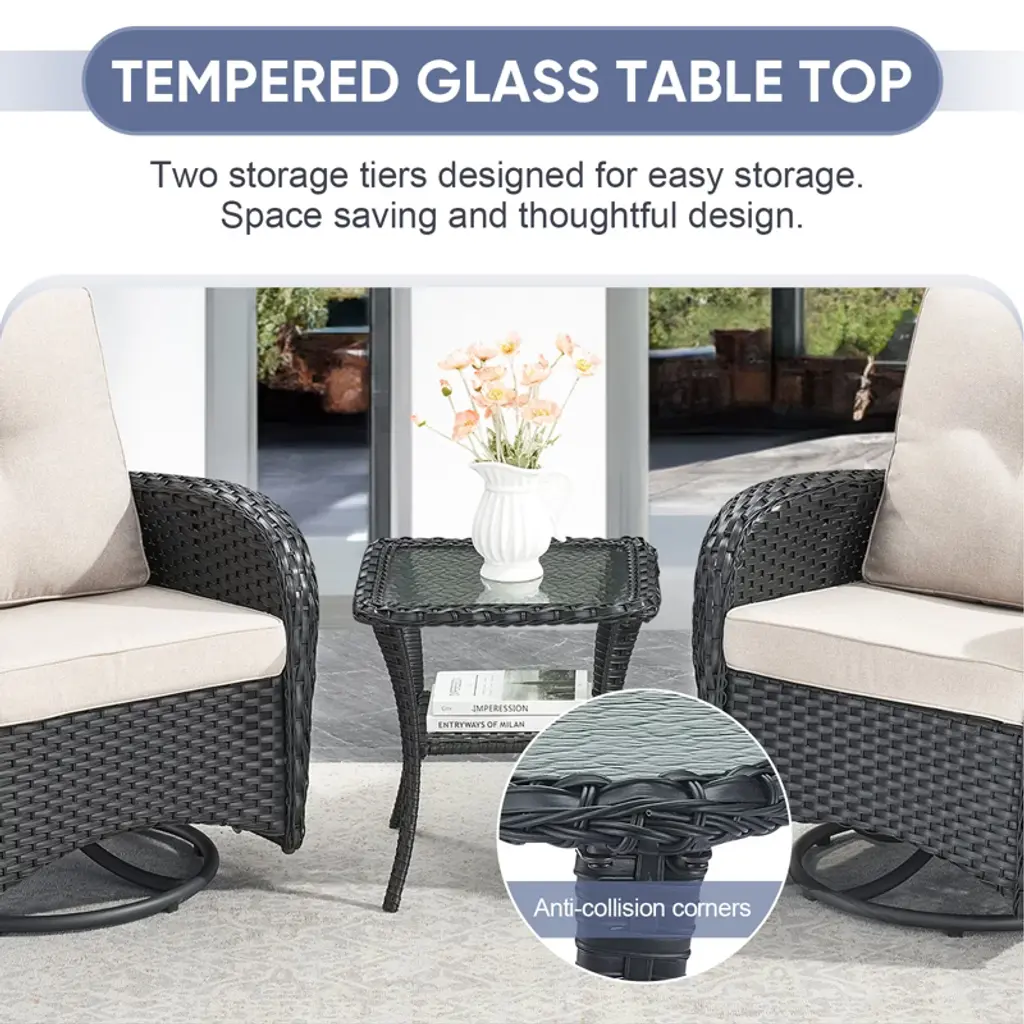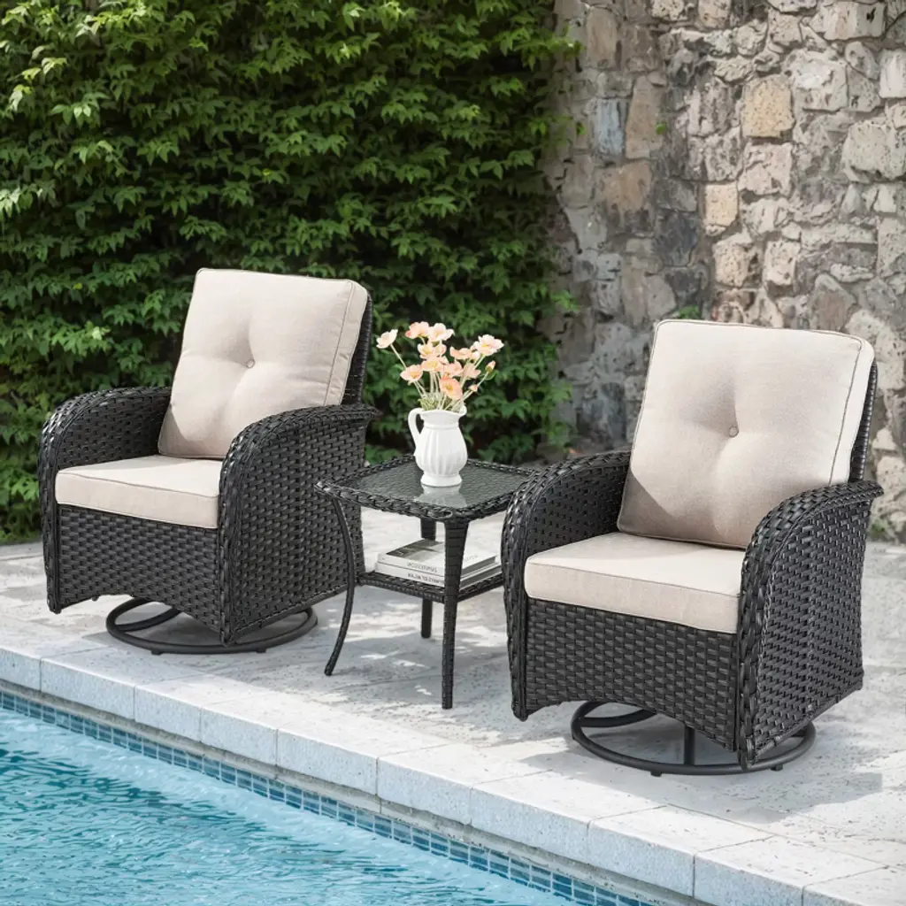 The POCASSY PE Wicker Swivel Patio Rocker Gliding Chairs feature a 360-degree swivel function, allowing you to effortlessly change direction. This design makes it easier to keep an eye on your children, engage in face-to-face conversations with loved ones, or simply enjoy moments of relaxation. Paired with a woven rattan coffee side table topped with tempered glass, this set is perfect for holding books, tea cups, and other small everyday items. Place two of these stylish outdoor chairs on your balcony or in your garden to create a cozy space for chatting with family and friends. Whether you're enjoying a quiet moment alone or sharing stories outdoors, this set is the ideal companion for embracing a peaceful and enjoyable outdoor lifestyle.