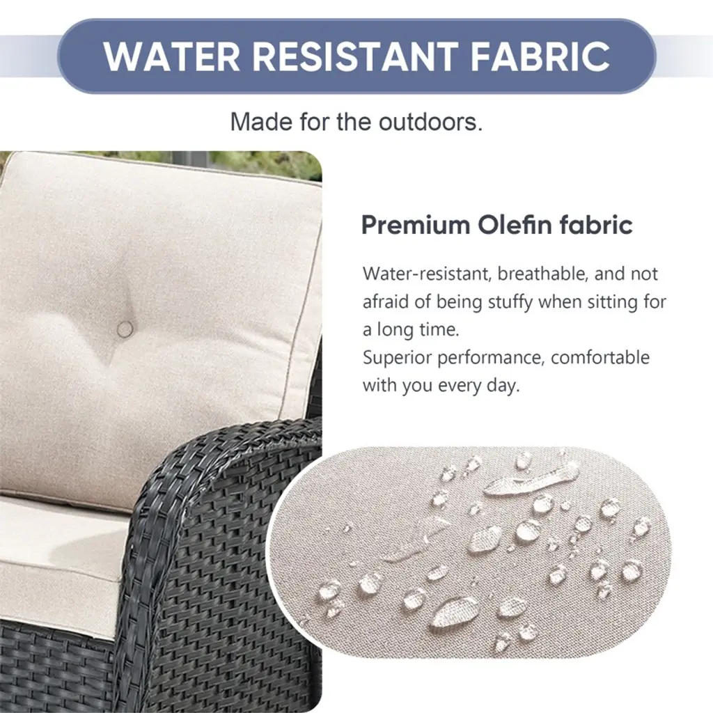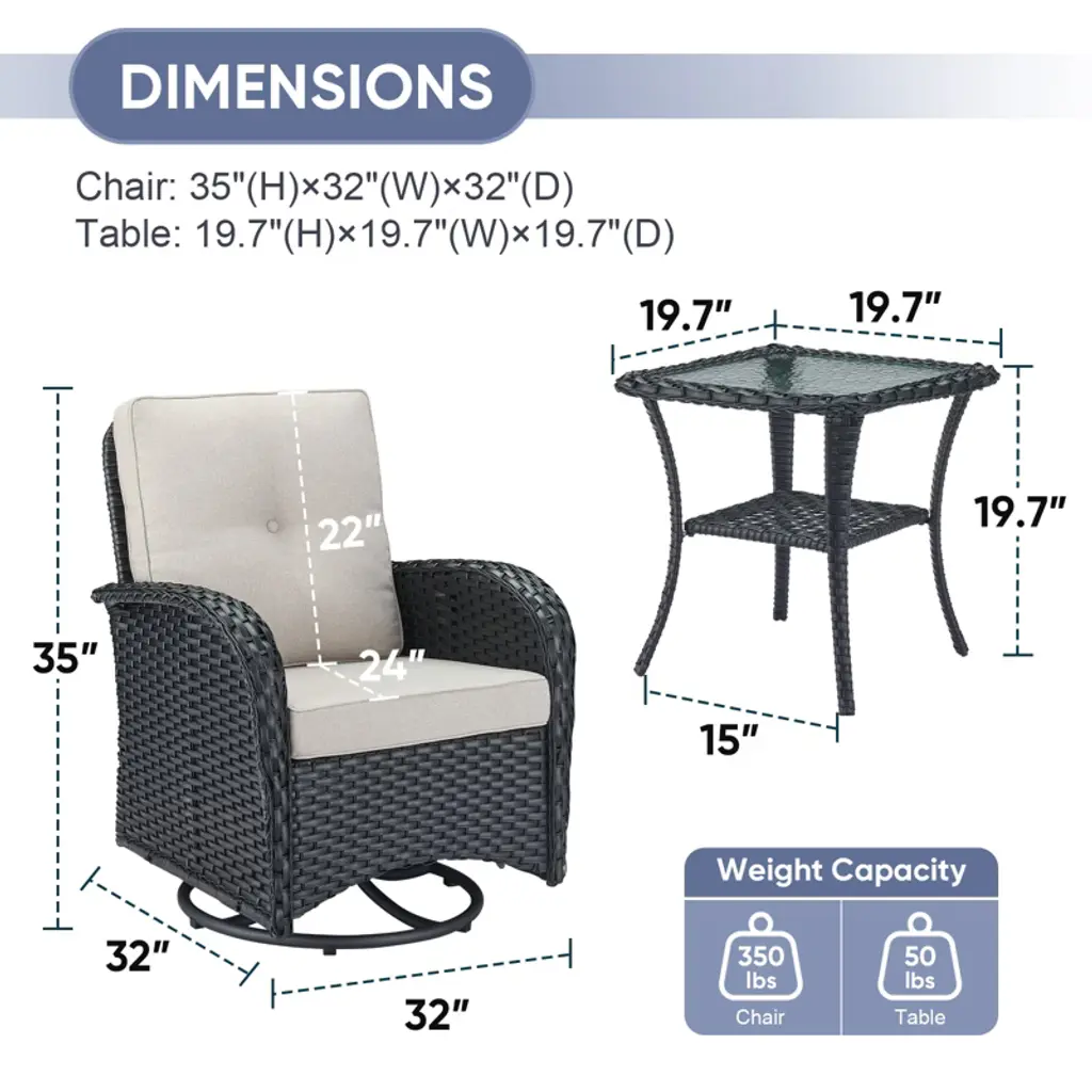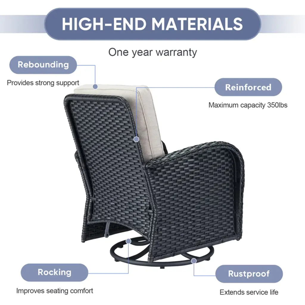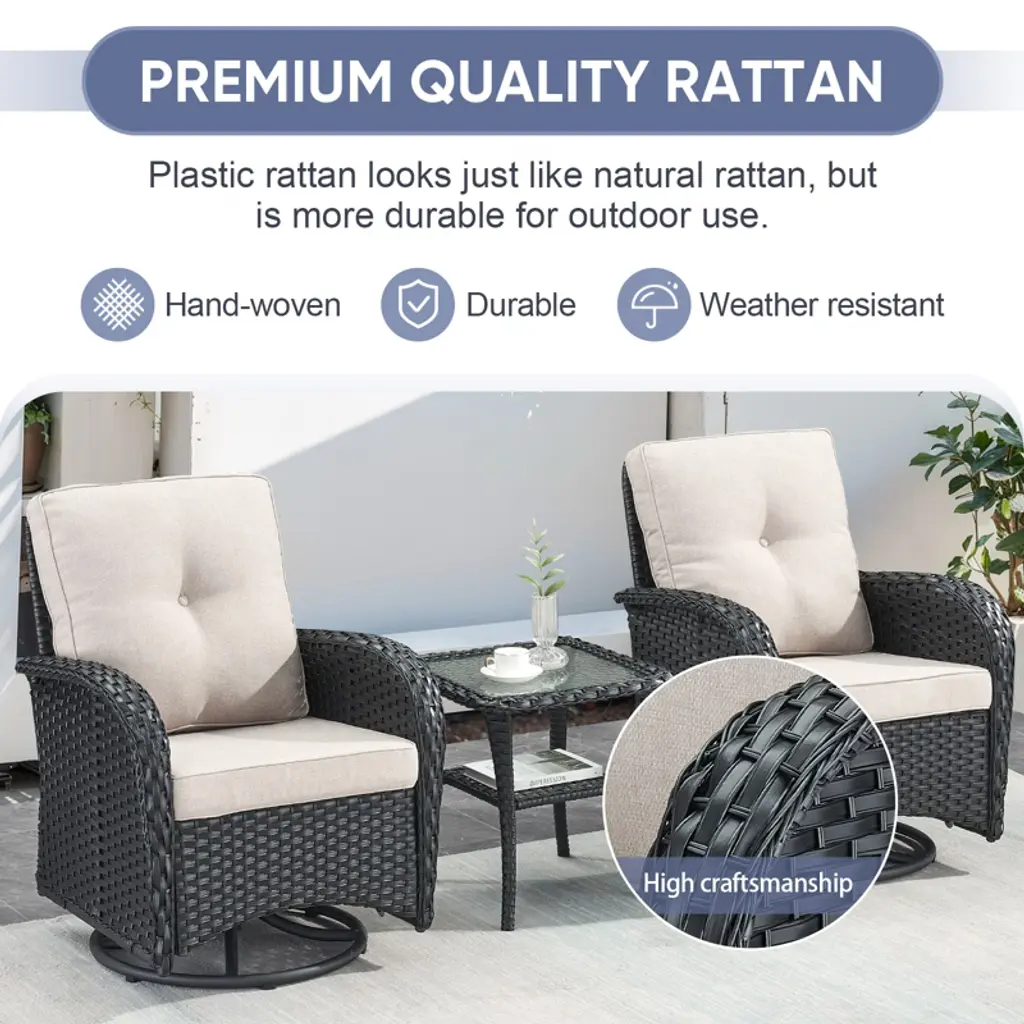 The POCASSY PE Wicker Swivel Patio Rocker Gliding Chairs feature a 360-degree swivel function, allowing you to effortlessly change direction. This design makes it easier to keep an eye on your children, engage in face-to-face conversations with loved ones, or simply enjoy moments of relaxation. Paired with a woven rattan coffee side table topped with tempered glass, this set is perfect for holding books, tea cups, and other small everyday items. Place two of these stylish outdoor chairs on your balcony or in your garden to create a cozy space for chatting with family and friends. Whether you're enjoying a quiet moment alone or sharing stories outdoors, this set is the ideal companion for embracing a peaceful and enjoyable outdoor lifestyle.