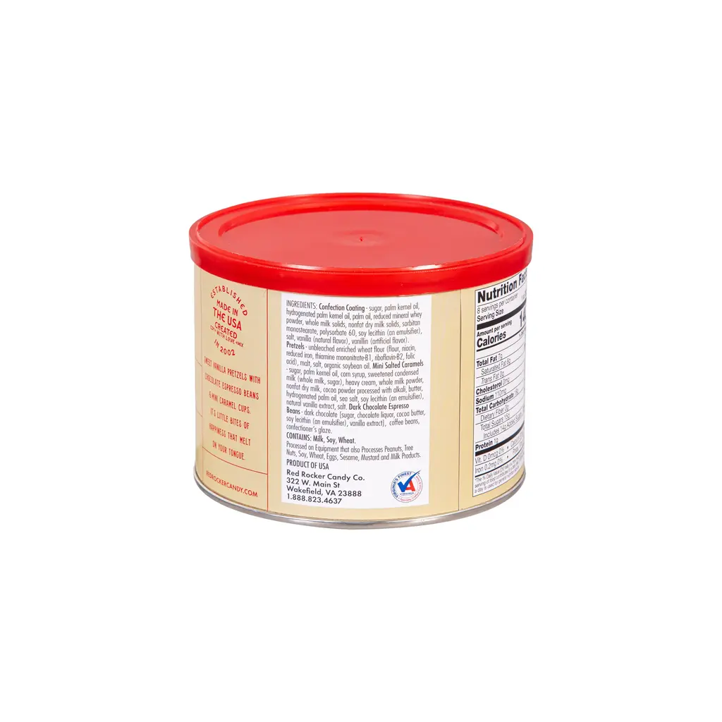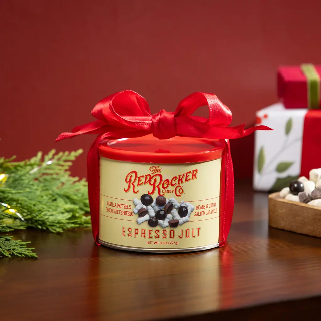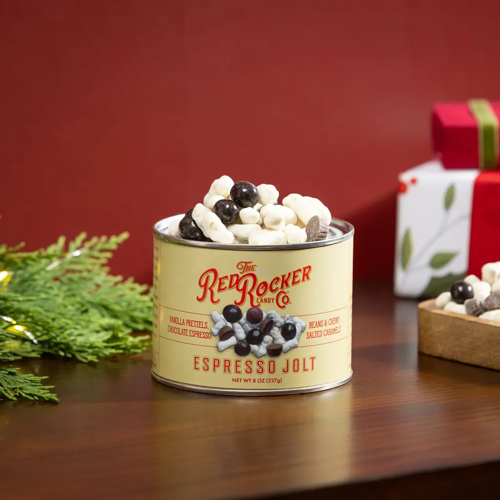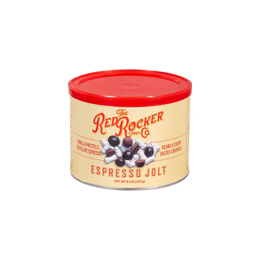 Wake up your taste buds with a bold, buzz-worthy treat: Espresso Jolt from The Red Rocker Candy Co. This energizing mix is the perfect pick-me-up, packed with rich chocolate espresso beans, vanilla-coated pretzels, salted caramels, and chocolatey bites that bring a delicious jolt of flavor to every handful. Whether you're powering through a busy afternoon, need a snack break with a kick, or just love coffee-inspired indulgence, this 8 oz tin delivers sweet satisfaction with every crunchy, creamy, chewy bite.