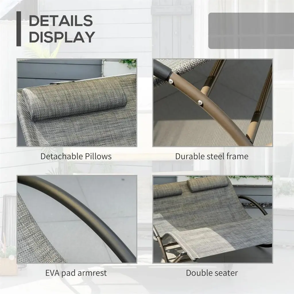 Experience the joy of lounging outdoors side by side with our versatile Day Bed Sun Lounger. Perfectly designed for two, this rocking chair provides a comfortable spot for reading, napping, or simply soaking in the sun.Enjoy summer days worry-free under the protective canopy shade of this rocking lounge chair. Its arched top offers ample shade, making it an ideal addition to your garden, poolside, or patio while keeping you cool and protected from harmful UV rays. - Color: Brown, Light Gray, Beige - Materials: Steel, Polyester, Breathable Mesh Fabric - Overall Dimensions: 70.75" L x 53.5" W x 62.25" H - Canopy Size: 61.75" L x 51.25" W - Bed Size: 50" W x 74.75" D - Headrest Size: 39.25" L x 6.75" W x 2.25" H - Weight Capacity: 528 lbs. Item Weight:61 pounds Resenkos Outdoor Double Chaise Rocking Chair, Day Bed Sun Lounger with Canopy Shade, Headrest Pillow, Armrests, Light Gray