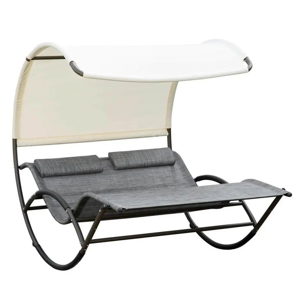 Resenkos Outdoor Double Chaise Rocking Chair, Day Bed Sun Lounger With Canopy Shade, Headrest Pillow, Armrests, Light Gray