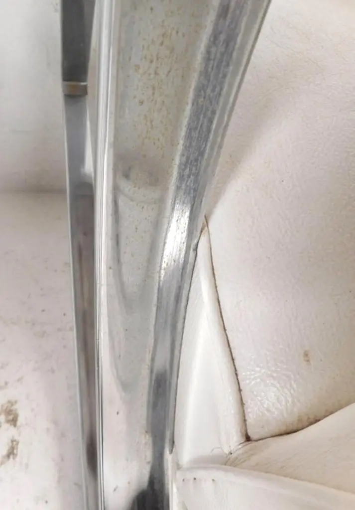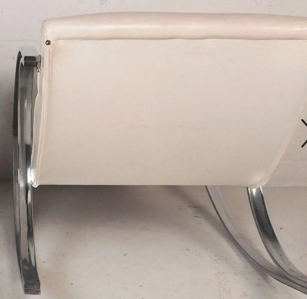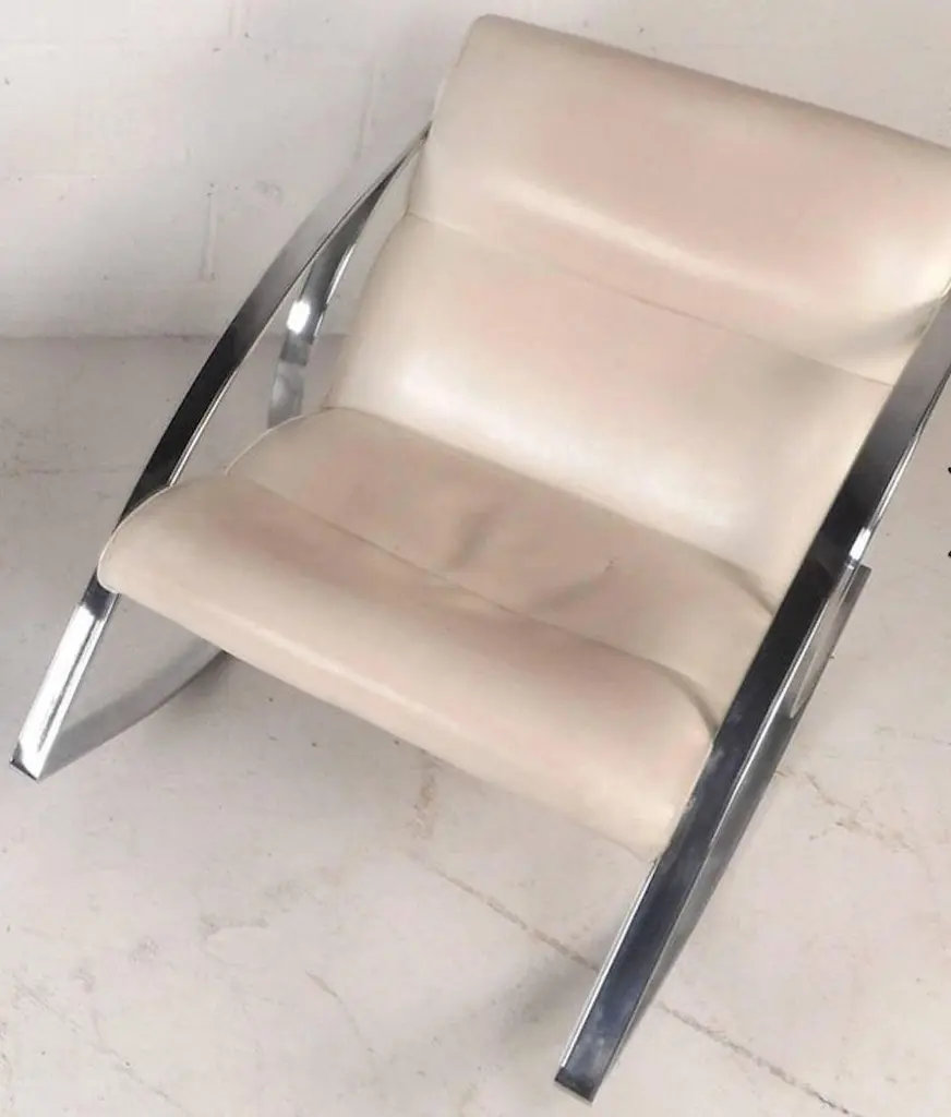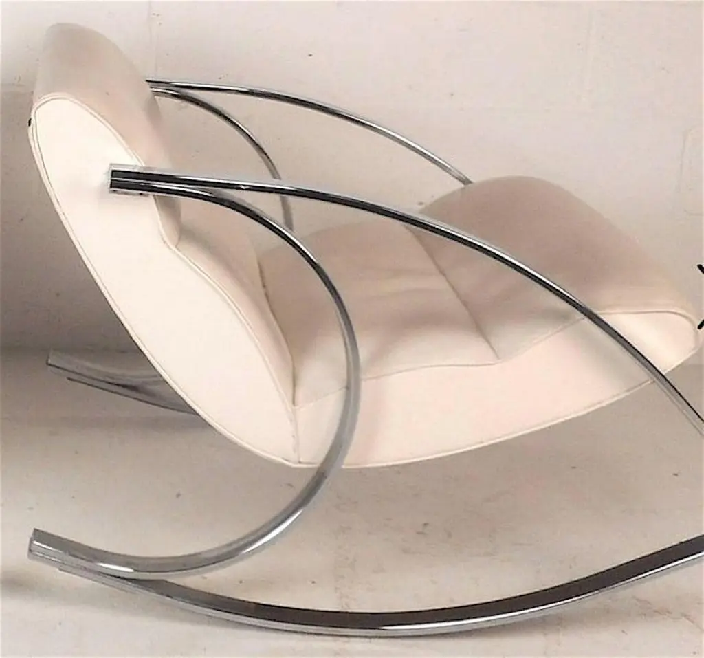 Stunning vintage rocking chair with a unique sculpted chrome frame. Extremely smooth and comfortable rocking motion with thick padded cushions upholstered in white vinyl. The sleek retro design offers comfort and style in any modern interior. Please confirm item location (NY or NJ).