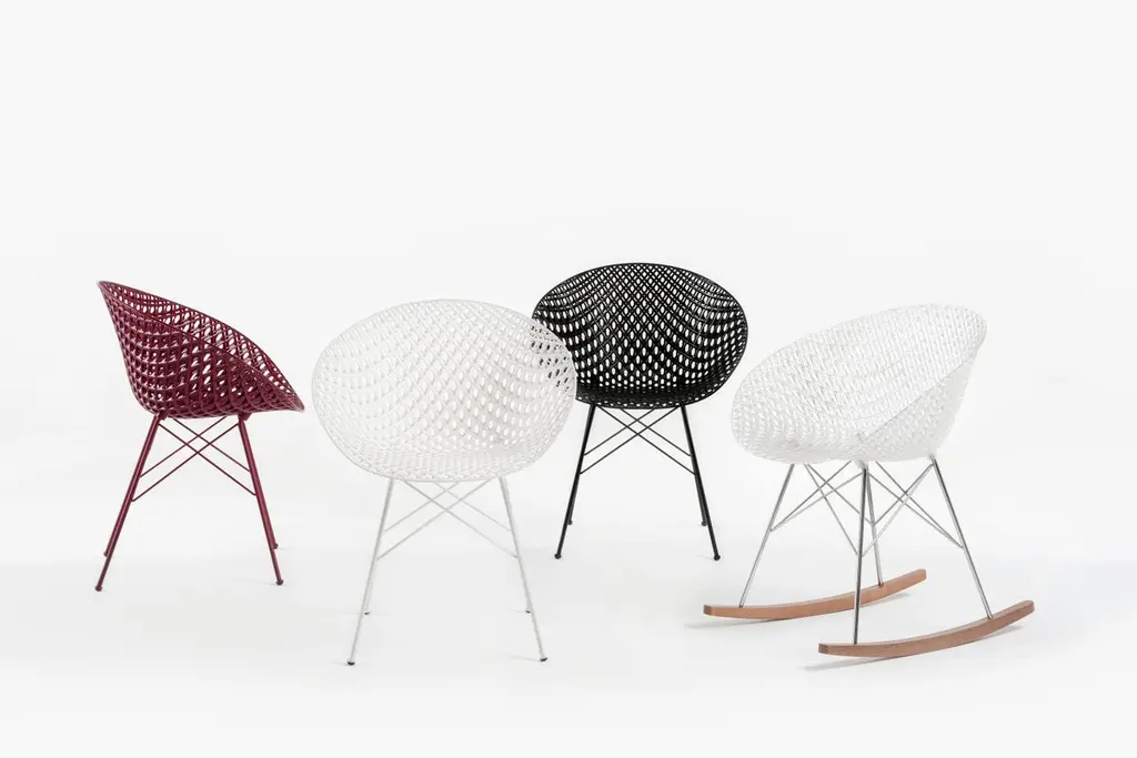 Smatrik is available transparent in white with painted or chrome-plated steel legs, and in stainless steel with oak-stained wood finish.Dimensions: Height 30.33 in.; Width 24 in.; Depth 26.38 in. Made of: Polycarbonate.