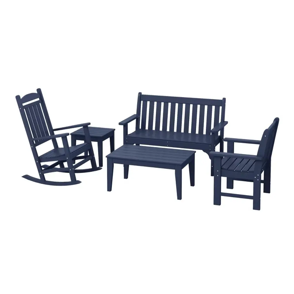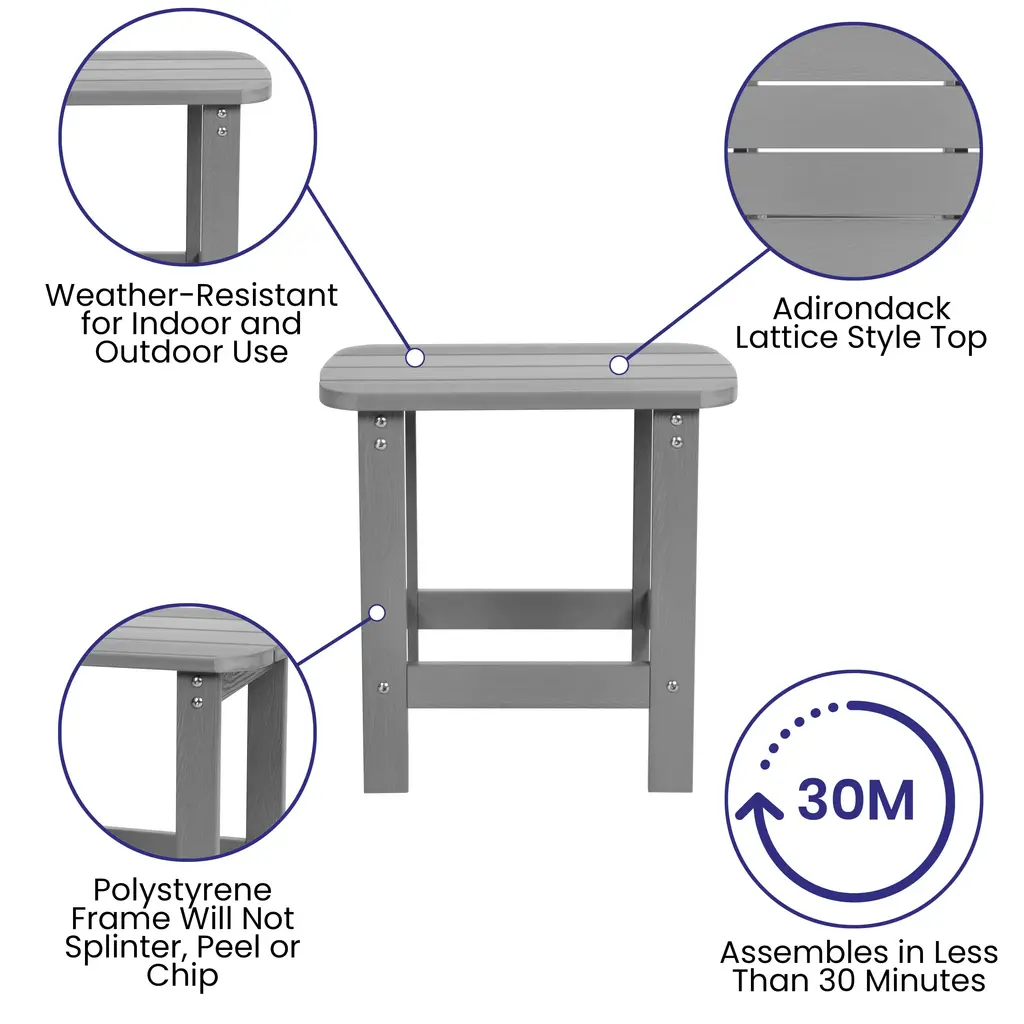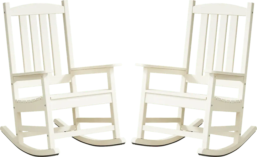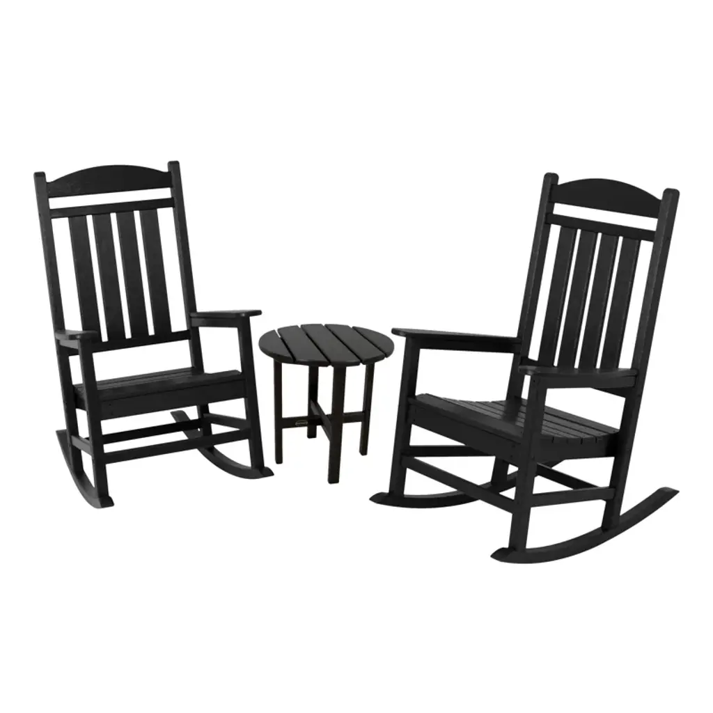 Enjoy the view from your front porch or back deck with this set of 2 poly resin rocking chairs with an included accent table. The design of this seating set is a timeless classic and will create a soothing atmosphere. A perfect addition to your patio, deck, or sunroom, this versatile indoor/outdoor conversation set invites you to settle in and stay awhile. No matter where you choose to spend your free time comfort is essential. These rockers have a full-back design for full support while the sloping runners provide a smooth rocking motion for full relaxation. The handy slatted top side table holds your drinks, snacks or your latest read. Boasting a faux wood look that is UV protected and constructed of weather-resistant polystyrene, this patio table and chair set is designed to hold up in many environments. Unlike traditional wood furniture there is no back breaking sanding, painting or sealing and this low maintenance table and 2 chair set won't rot, peel or splinter. Easily clean spills, dirt, or dust with water and a neutral detergent. Assembly takes less than 30 minutes with the included tools and illustrated instructions. This all-weather indoor/outdoor seating set beckons you to unwind and let go of the day.