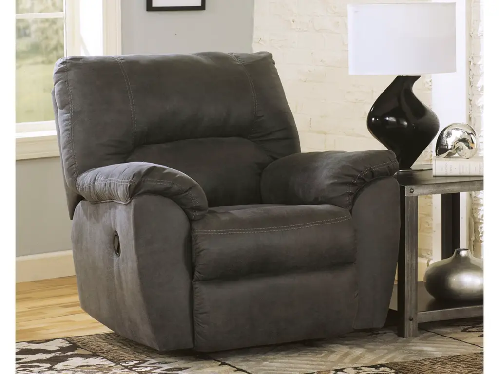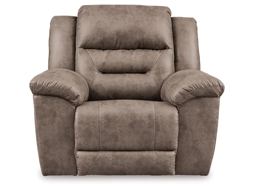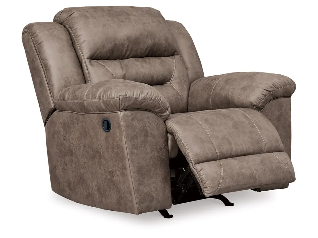 For those who love the cool look of leather but long for the warm feel of fabric, the Stoneland rocker recliner delivers both with ease. Its high-performance padded faux leather is remarkably durable and easy to clean, making it just the thing for family spaces. Channel-stitched back cushions provide indulgent lumbar support for maximum comfort—not to mention fashion-forward flair.