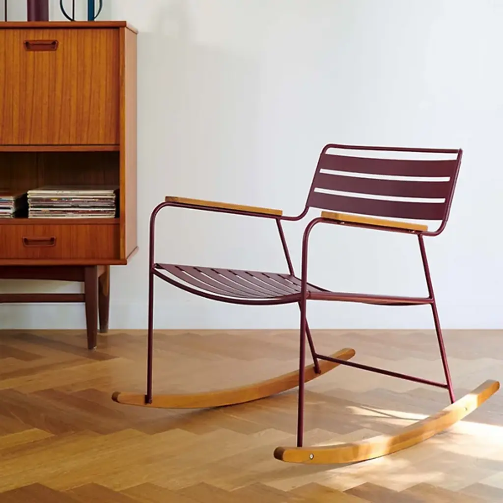 A rocker with an unexpectedly pleasing blend of materials and textures. The Surprising Rocking Chair by Fermob was designed by Harald Guggenbichler with natural teak wood taking the place of metal on the armrests and rocker base. In-between, this chair is all steel, with a steel rod frame and curved steel slats for the seat and back, all of it finished with a durable powder coat. Altogether, this rocking chair is a comfortable and colorful piece destined to dress up any porch or patio.