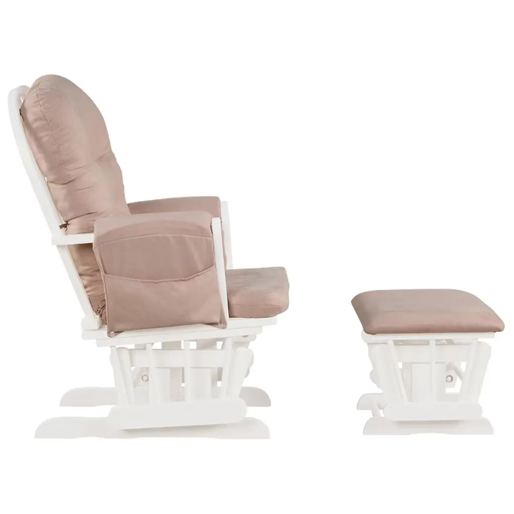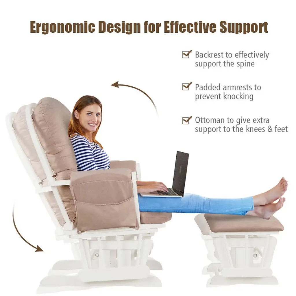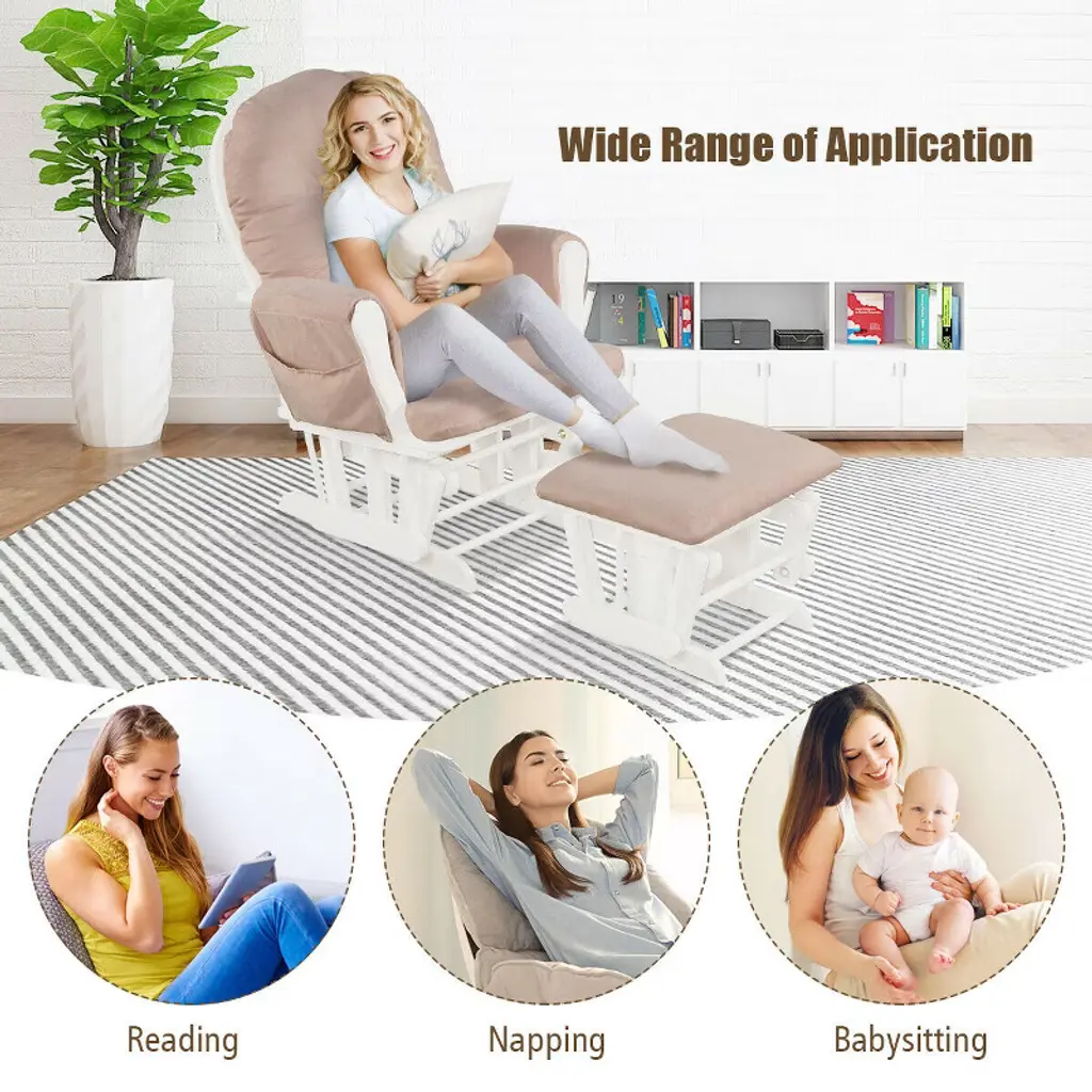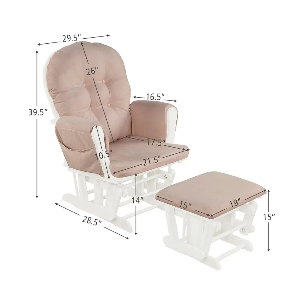 Our rocking chair with ottoman is designed to provide an easy glide for optimum cradling when watching your little one sleep. The frame on this item is constructed from solid wood to ensure long-lasting use and weight capacity. The padded armrests with a storage pocket provide support for your hands, at the same time it will provide additional storage space. In addition, the armrest is detachable, so you can easily adjust the orientation of the storage pocket. The soft cushion with straps is not only easy to remove, but also effectively anti-skid. This rocking chair with ottoman is suitable for living room, bedroom, nursery and other places!FeaturesSurface with soft microfiber fabric provides a comfortable relaxing time The cushion can be detached which is convenient to maintain daily Comfortable ottoman provides extra support to your knees, legs and feet Easy to assemble with complete accessories and instruction Suitable for living room, bedroom, nursery and other places Ideal for napping, reading, watching TV, etc Specifications Color: Brown/Beige/Dark Grey/Pink/Light Grey/Grey+ White Material: Rubber wood+ Bentwood+ MDF+ Sponge+ Soft Microfiber Fabric Overall Dimension: 29.5'' x 28.5'' x 39.5'' (W x D x H) Ottoman Size: 19'' x 15'' x 15'' (W x D x H) Net Weight: 39.5 lbs Glider Weight Capacity: 300 lbs Ottoman Weight Capacity: 225 lbs Package includes: 1 x Rocking Glider 1 x Ottoman 1 x Instruction