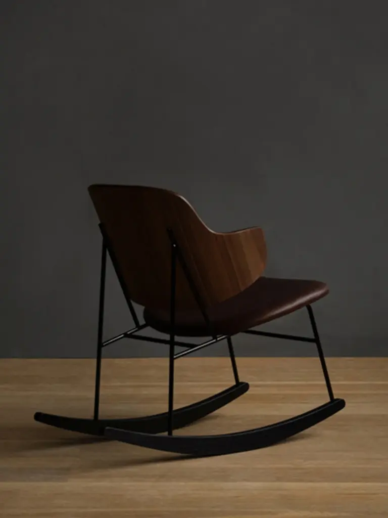 The Penguin Rocking Chair leans towards the American modernists from the 1950s and 1960s. So beautiful that it can be displayed as a work of art in any home, it is open in its construction with a curved back of oak or walnut veneer and has a seat upholstered in fabric or leather against the stringent steel frame. Contrasting and playful, while being well-proportioned and fully formed, the chair, designed by furniture designer Ib Kofod-Larsen in 1953, is a piece of Danish cultural heritage and design history – and maybe more modern than ever before with its beautiful silhouette and sculptural, organic lines and curves.
