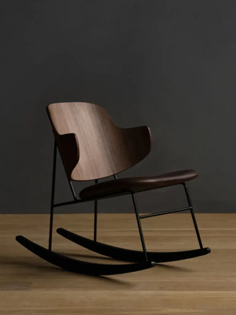 The Penguin Rocking Chair leans towards the American modernists from the 1950s and 1960s. So beautiful that it can be displayed as a work of art in any home, it is open in its construction with a curved back of oak or walnut veneer and has a seat upholstered in fabric or leather against the stringent steel frame. Contrasting and playful, while being well-proportioned and fully formed, the chair, designed by furniture designer Ib Kofod-Larsen in 1953, is a piece of Danish cultural heritage and design history – and maybe more modern than ever before with its beautiful silhouette and sculptural, organic lines and curves.