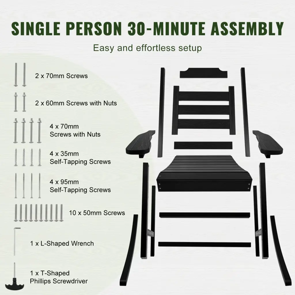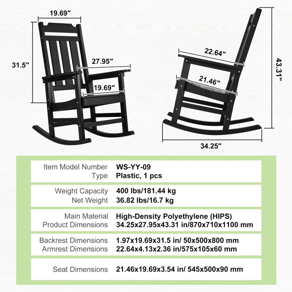 Feature: Sturdy and Durable Material: This porch rocker is made from high-density polystyrene (HIPS) material, providing solid construction with enhanced impact resistance and stability. It supports up to 400 lbs, suitable for various body types. The material resists deformation, fading, and weather conditions, ensuring long-lasting use. Comfortable Seating Experience: Our ergonomic rocking chair outdoors tilts back 5° to keep your back naturally reclined. With an extended seat depth of 50 cm, it offers more comfort for lounging. The smooth rocking motion provided by the base ensures a gentle and steady rocking experience, allowing you to relax and enjoy a soothing rhythm. Easy Assembly: We provide 70% pre-assembly, so you only need to follow the manual to connect and secure the components. The assembly can be completed by one person within 30 minutes with minimal effort. (Note: Do not tighten screws until assembly is complete.) Effortless Cleaning: The smooth, waterproof outside rocking chair's surface resists liquid and other stains. It requires minimal maintenance—simply dust with a brush or cloth and clean surface stains with a cloth dampened with soapy water. Versatile Use: With its wood grain texture and classic design, this patio rocking chair complements any outdoor space. Ideal for patios, gardens, porches, balconies, or indoors, it adds a touch of elegance and style to any setting. Package Content 1 x Outdoor Rocking Chair 1 x L-Shaped Wrench 1 x T-Shaped Phillips Screwdriver