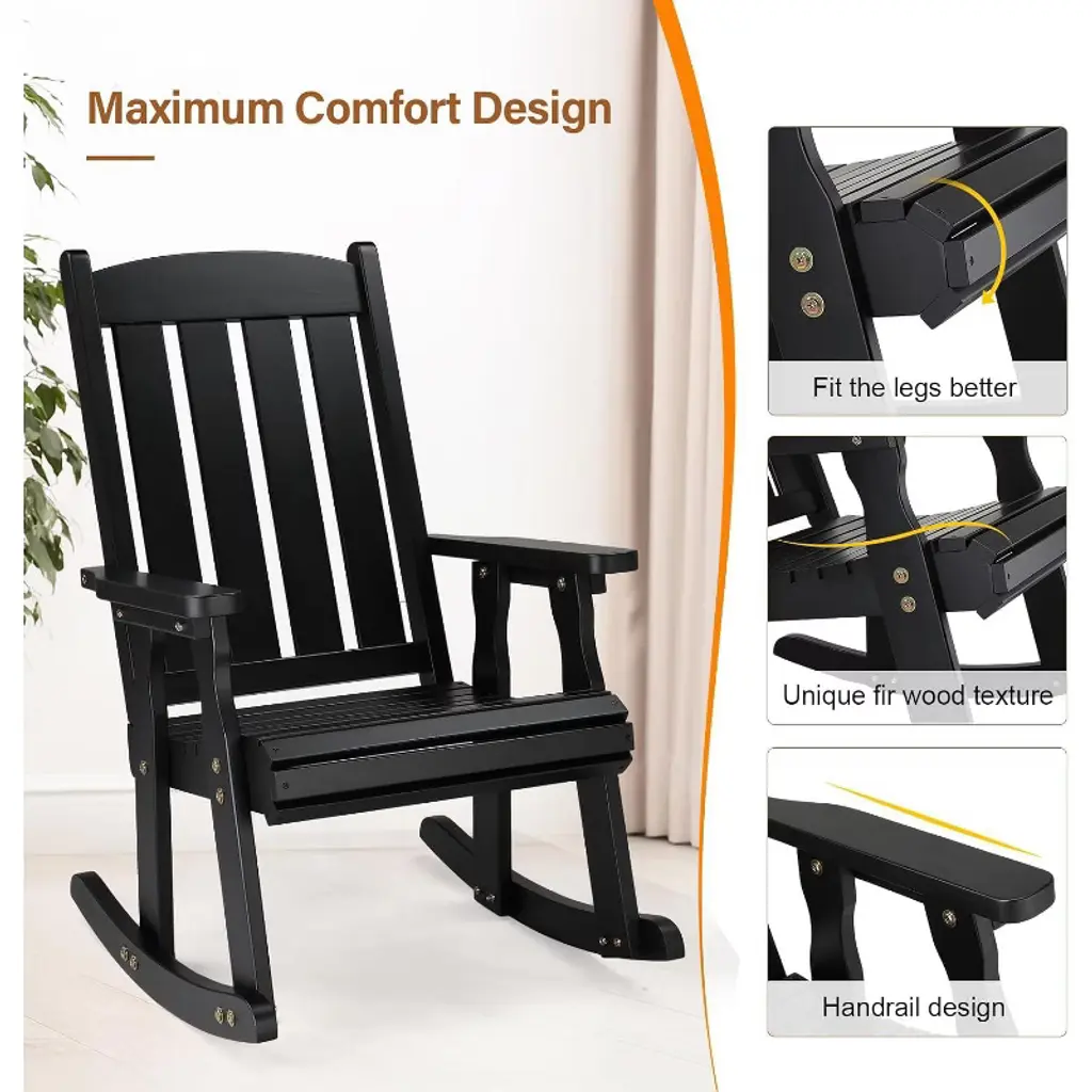Ergonomic Curved Seat Design - Our rocking chair features an ergonomically curved seat, designed to provide exceptional comfort and support, conforming to the body's natural contours for an enjoyable seating experience Ultimate Comfort Chair - Experience unparalleled comfort with a high back and round, wide armrests. The rocking chair outdoor allows a soothing rocking motion of up to 45° to maximum relaxation Robust 600 LBS Weight Capacity - Constructed with a strong and durable frame, the outdoor rockers can support up to 600 lbs, making it perfect for various body types and ensuring long-lasting stability and safety Solid Fir Wood Construction - Made with the solid wood material, the outdoor patio rocking chair is weatherproof and can adapt to outdoor scenes such as yard, garden, poolside, patio and also various indoor scenario No Much Assembly Needed - Without complicated parts that assembly is straightforward and quick. After our test, complete assembly takes only 30~60 min