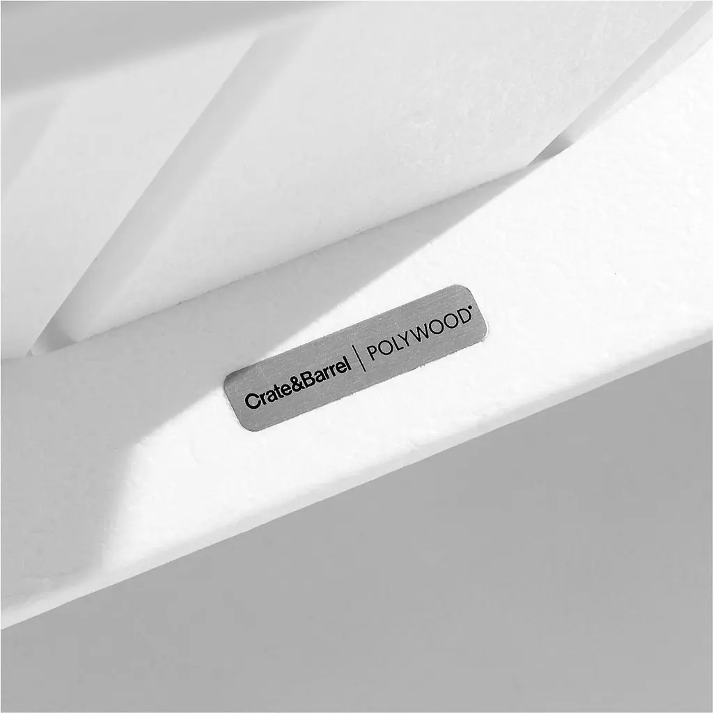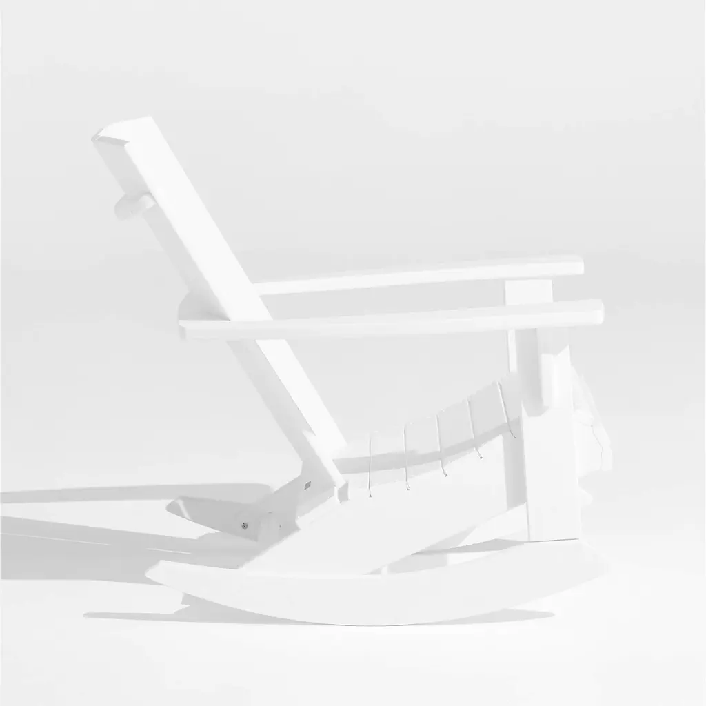 Made of plastic bottles with wood-like texture, this all-weather rendition of the classic Adirondack chair has the same iconic profile that's synonymous with summer. A sloped seat settles you back for relaxing, while the curved base lulls with a gentle rocking action. You'll love the hug of the angled wide-and-thin slat back as well as the extra-wide paddle armrests ready for propping a cool drink. Ready to greet the great outdoors in bright white, the Vista outdoor rocking chair is a Crate & Barrel Exclusive.