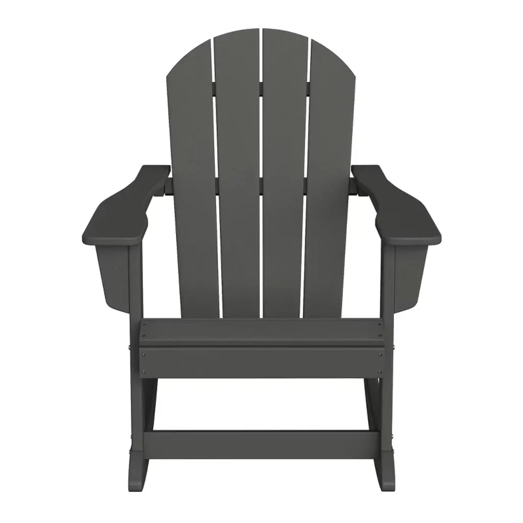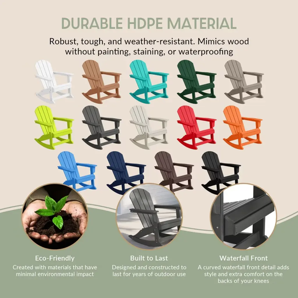 Ideal chairs and side table for unwinding in your backyard or porch on a sunny day while enjoying time with friends or family. Relax all day long thanks to the chair's contoured seat, wide armrests, and slanted seat that will have you falling into relaxation. With a smooth rocker rail base that gently rocks back and forth for a comfortable rocking experience. Created with high-quality HDPE Poly material that is durable and made to last and with the help of the weather and UV resistant treatment that protects the chairs vibrant color all year long.While we strive to accurately represent product colors, please be aware that actual colors may vary slightly due to individual screen settings and lighting conditions. FeaturesSet Includes: Two (2) Adirondack rocking chairs, One (1) side tableContoured seat and wide arm rest offer all-day comfortHigh-quality (HDPE) lumber adds strength and durabilityWeather and UV resistantSmooth rocker rails for soft rocking experienceMultiple color options to choose fromSimple to assembleDetails:Product Type: Patio Conversation SetsWhat's Included: (2) Rocking Chair; (1) Side TableRocking ChairDimensions: 29.5" W x 33.25" D x 35" HWeight: 38.5 lbs.Seat Width: 20.25"Seat Depth: 20"Seat Height: 16"Weight Capacity: 450 lbs.Table Top Width: 14"Table Top Depth: 14"Table Top Thickness: 0.5"Side TableDimensions: 14" W x 14" D x 18" HWeight: 9 lbs.Table Top Width: 14"Table Top Depth: 14"Table Top Thickness: 0.5"Weight Capacity: 180 lbs.