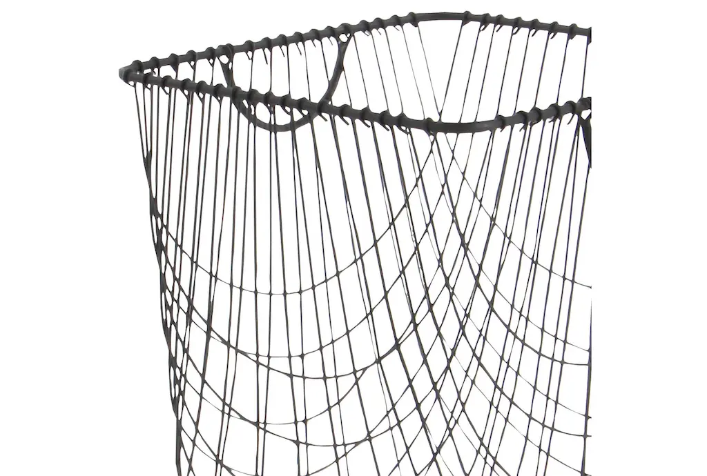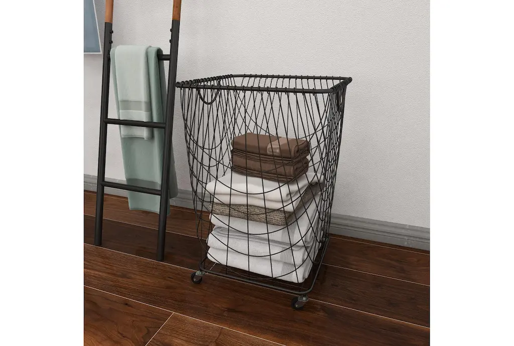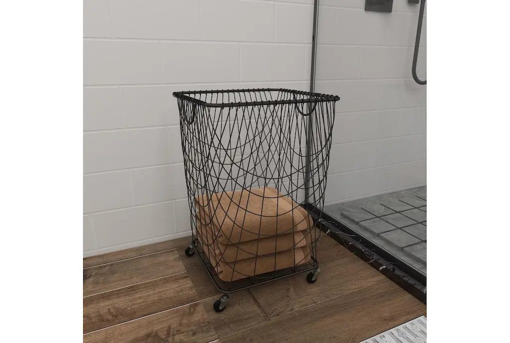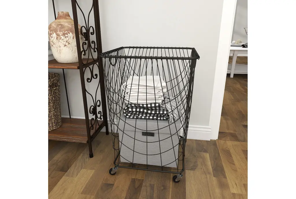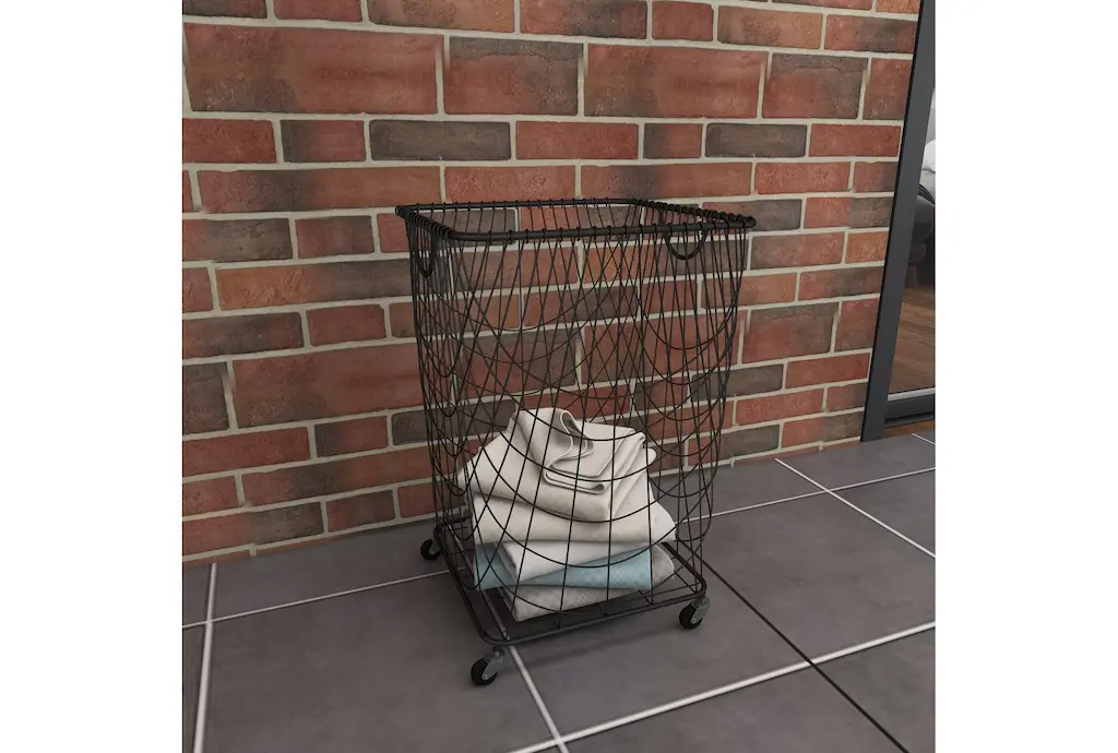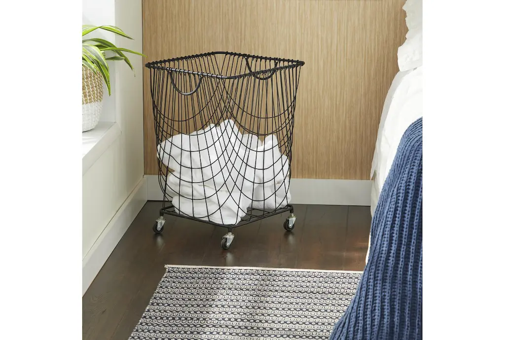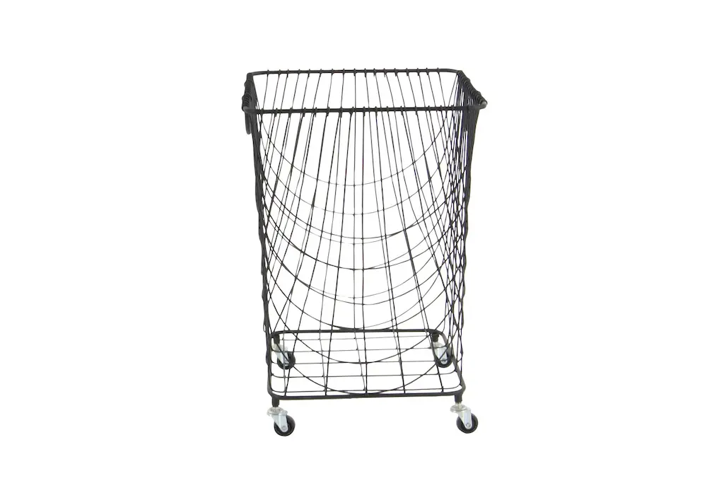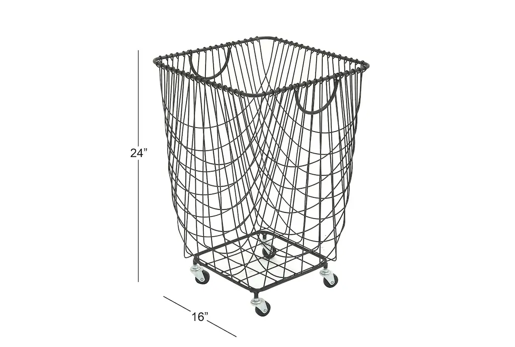 This storage cart is a refined and stunning statement piece that gives function and unique display in any space with its deep basket style cart. This item ships in 1 carton. Features easy-roll swivel caster wheels. Suitable for indoor use only. This item ships fully assembled in one piece. Maximum weight limit is 15 lbs. This is a single black colored laundry cart. Industrial style.