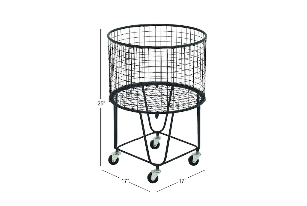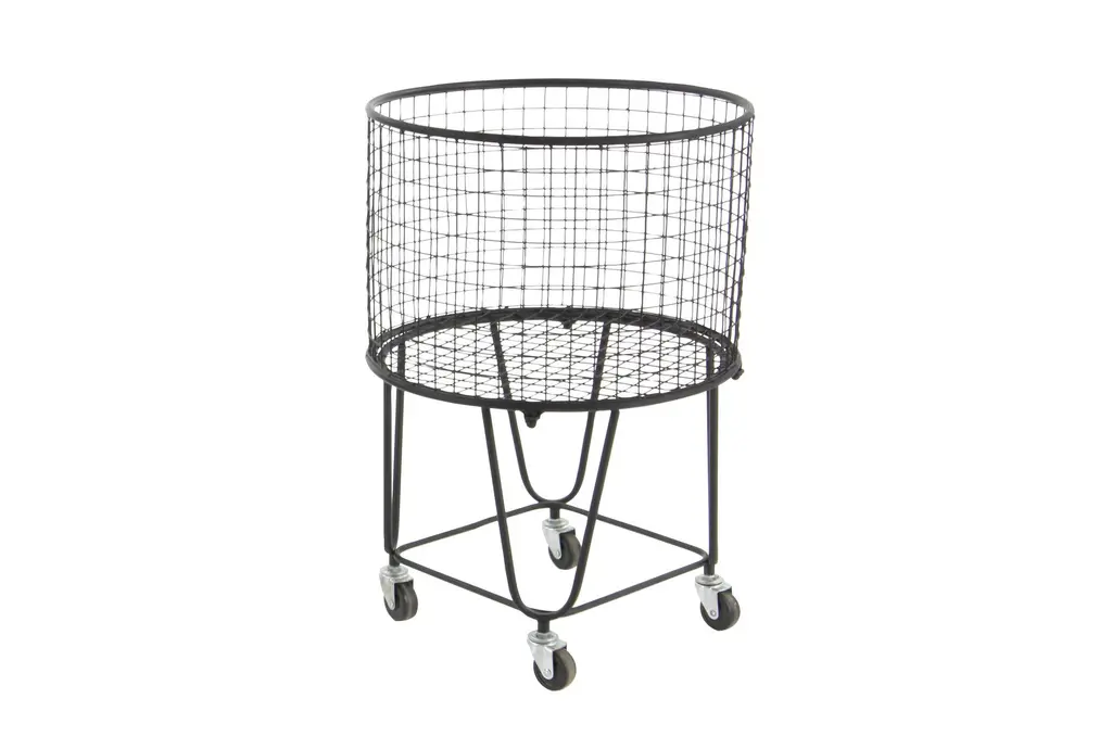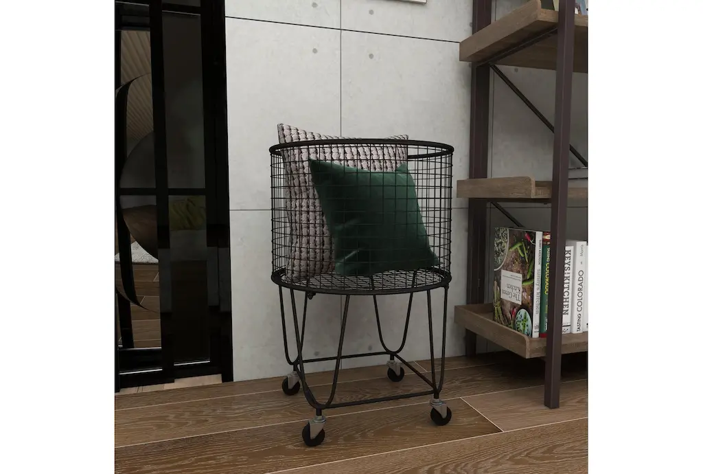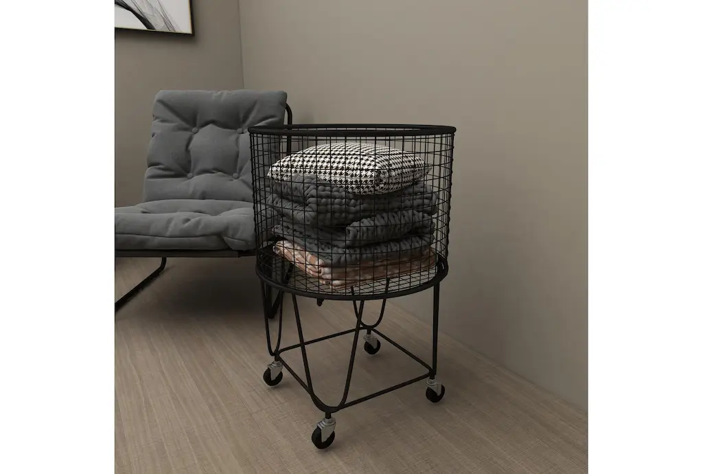This industrial rolling cart is a multifunctional home piece that can serve as a laundry hamper, pillow and blanket basket, cart , or planter stand. This item ships in 1 carton. Easy-roll swivel caster wheel. Suitable for indoor use only. Some assembly required. Maximum weight limit is 20 lbs. This is a single black colored laundry cart. Industrial style.