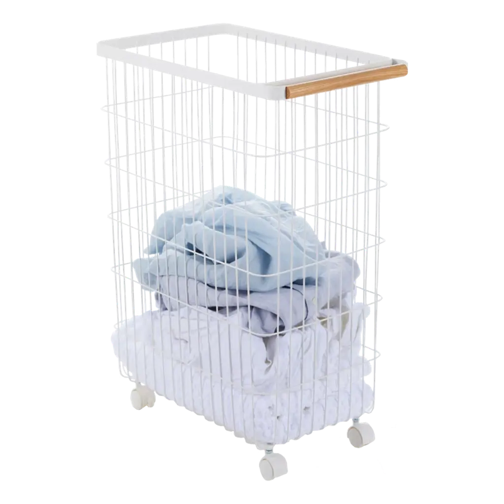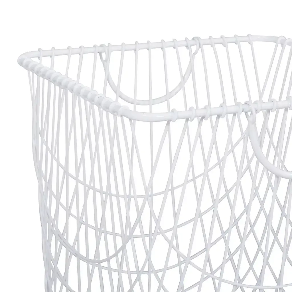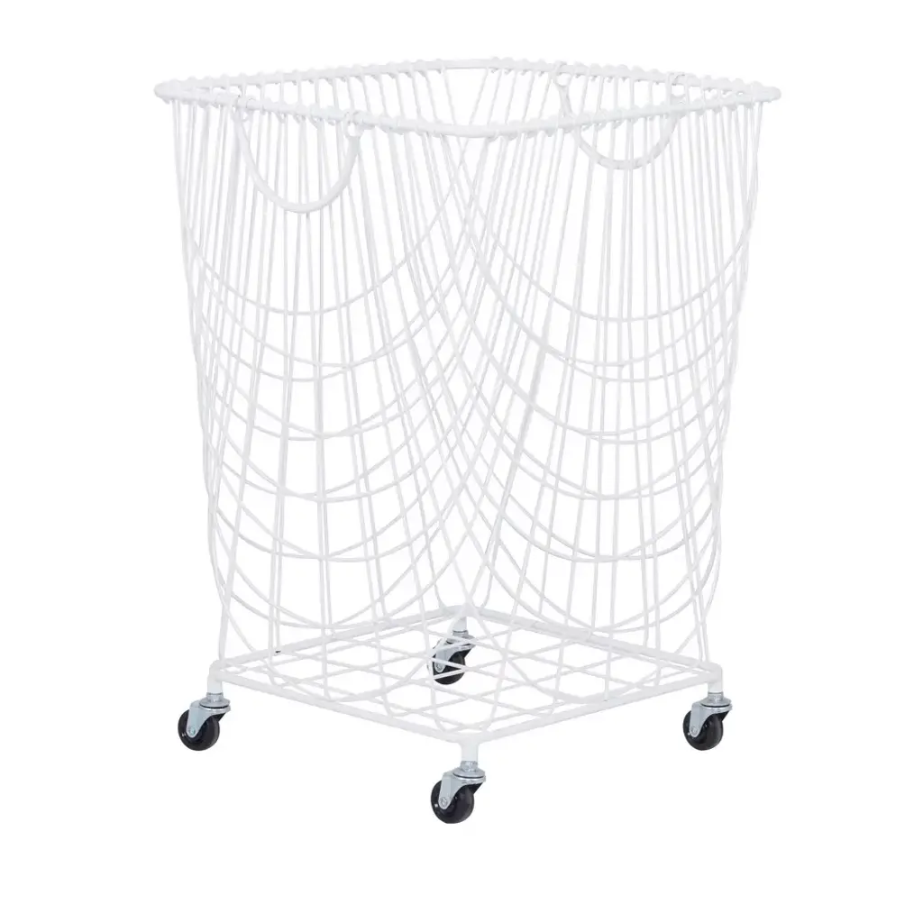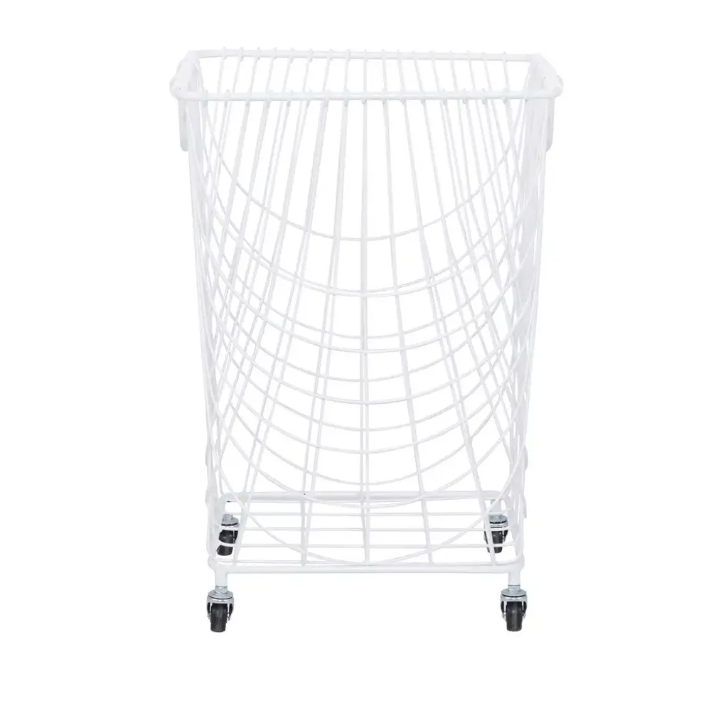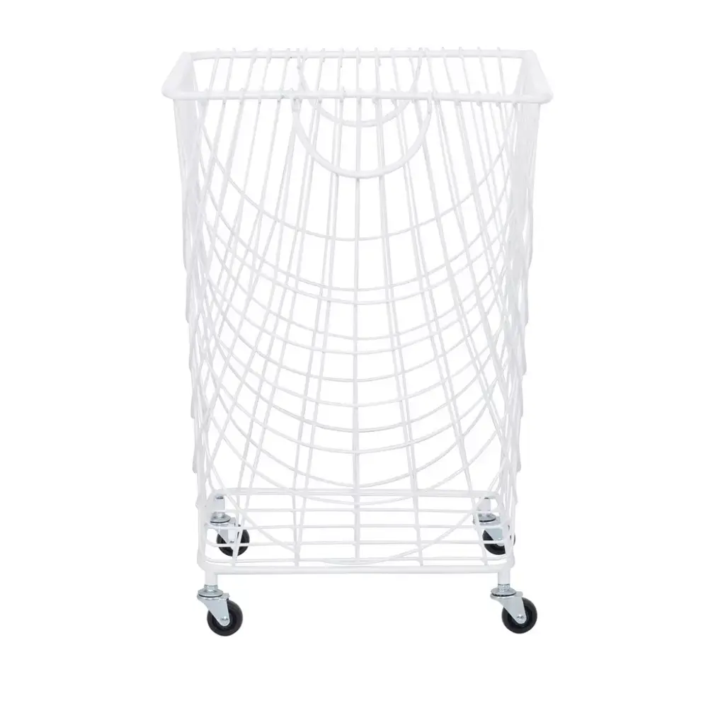 This storage cart is a refined and stunning statement piece that gives function and unique display in any space with its deep basket style cart. This item ships in 1 carton. Suitable for indoor use only. This item ships fully assembled in one piece. Maximum weight limit is 20 lbs. This is a single white colored laundry cart. Industrial style.