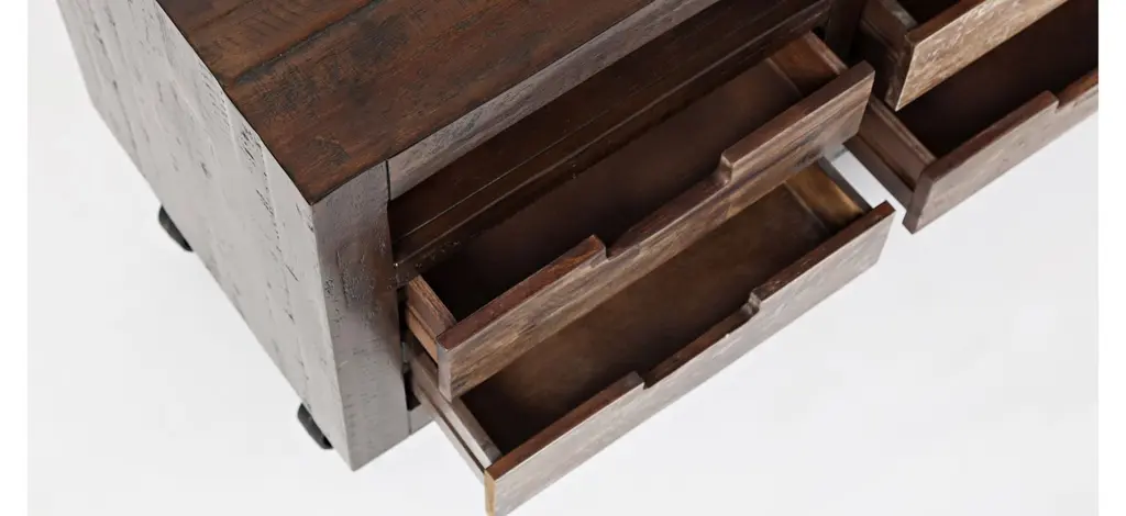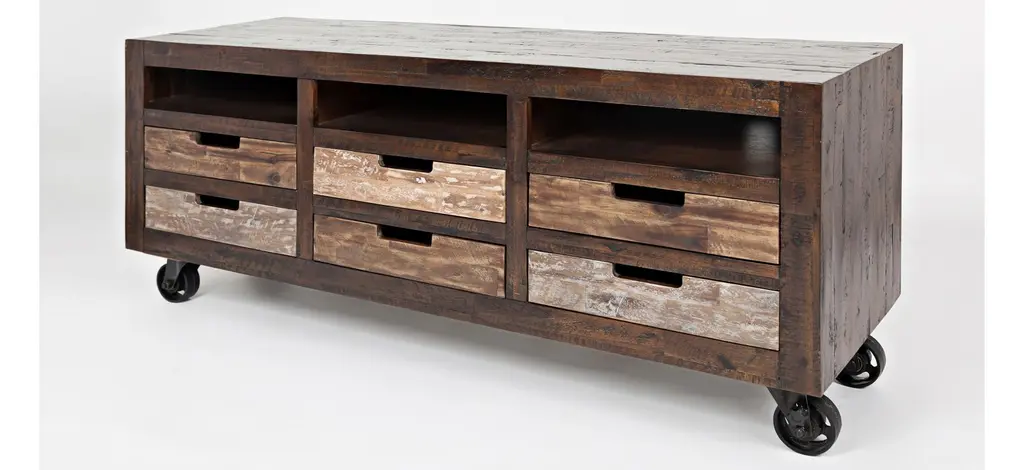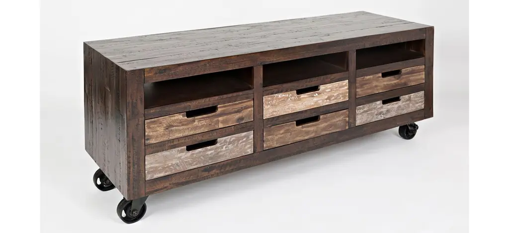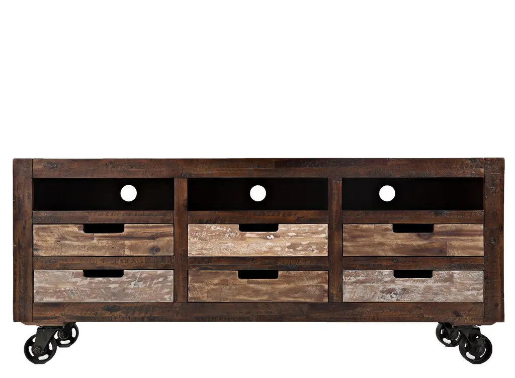 The Painted Canyon media cart is an ideal addition to any home. Varied finish tones on the drawer fronts, overall distressing, and industrial casters pair with solid construction.