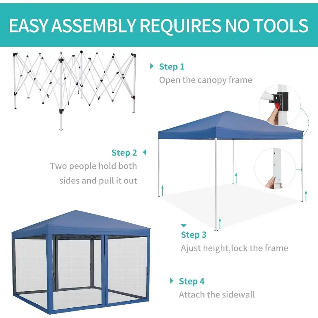 Highlights at a Glance: Heavy Duty pop up canopy tent with mosquito netting for bug-free enjoyment. Portable and easy-up design for quick setup at any outdoor event. UV-blocking Oxford cloth provides reliable sun shade and weather resistance. Adjustable height options for customizable shelter to fit your needs. Convenient roller bag for effortless transport and storage on the go. Specifications: Size: 10 x 10 Ft Material: Oxford Cloth, Iron Packing List: 1 x Canopy Top 1 x Canopy Frame 4 x Rope 8 x Tent Stake 4 x Sandbag(only bags without sand) 4 x Netting Walls 1 x Roller Carry Bag