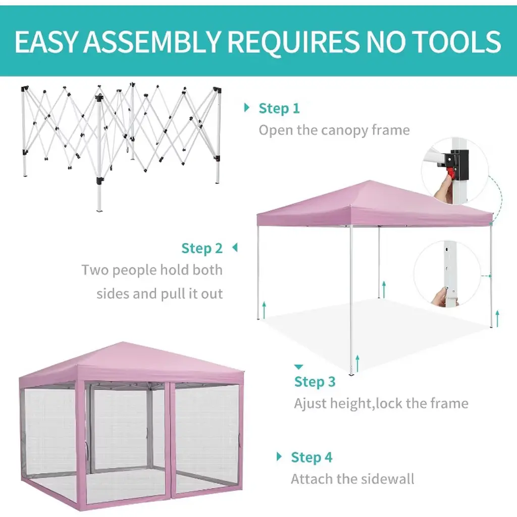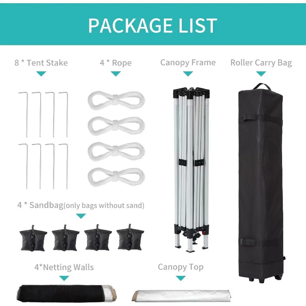 Highlights at a Glance: Heavy Duty pop up canopy tent with mosquito netting for bug-free enjoyment. Portable and easy-up design for quick setup at any outdoor event. UV-blocking Oxford cloth provides reliable sun shade and weather resistance. Adjustable height options for customizable shelter to fit your needs. Convenient roller bag for effortless transport and storage on the go. Specifications: Size: 10 x 10 Ft Material: Oxford Cloth, Iron Packing List: 1 x Canopy Top 1 x Canopy Frame 4 x Rope 8 x Tent Stake 4 x Sandbag(only bags without sand) 4 x Netting Walls 1 x Roller Carry Bag