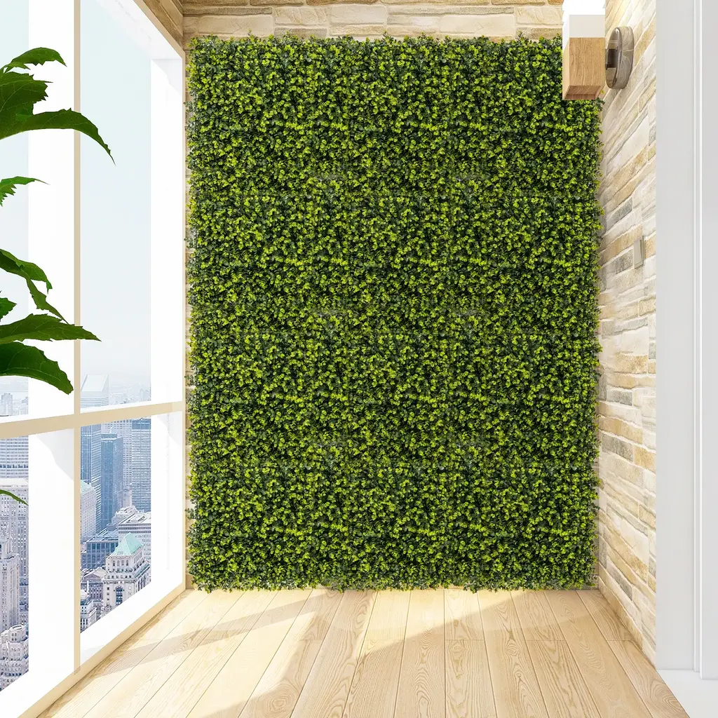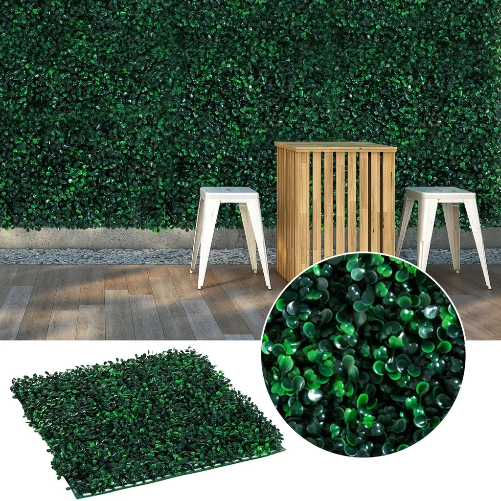 Premium PE Material: With SGS certification. Size: 10'' x 10". Quantity: 12 pcs. The polyethylene material is odorless, environment friendly, and sun-proof, which can avoid the leaves fading quickly. The artificial hedge panel will keep your fences or walls always looking good. High Simulation Look: Our boxwood panel comes with bright green color and a soft feel. The artificial grass backdrop wall is dense and has a realistic look, which is simple and beautiful. You will be immersed in the green scene. Ease of Installation: The four interlocking connectors can be anchored firmly, or you can easily connect the boxwood wall panel to any wood frame or link fence. Stable Panels: The thickened PE rivets are inverted triangles that cannot fall off from the wall. The back of each panel consists of 81 grids, effortless and convenient to clean. You also can cut it, fit and shape it to any space. Outdoor & Indoor Usage: Start your DIY projects! Perfect for adding privacy to an outdoor area, like the fence, wall, patio, garden, yard, walkways, backdrop. It also can be used in the living room, balcony, office area, reception desk, holiday party event, and more. Package Content 12 x Artificial Boxwood Panels