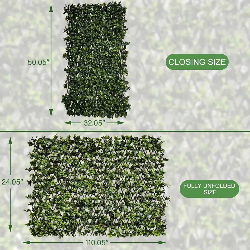 This expandable faux ivy fence privacy screen with realistic faux foliage. Artificial leaves are made from a stabilized polyethylene material, so they are sunlight resistant, waterproof and stay green, perfect for simply using as decoration. Single sided leaf fencing is the ideal solution for blank spaces to be used as decoration, dividers and to maintain privacy. Retractable Artificial Leaf Fence Screen is freely adjustable, you can adjust the lattice fence according to the adjusted size for privacy. The wicker fence expands to the size you need when you need it(24"height x 110"width), and can also be tucked away when you want to save space(50"height x 32"width). It is also the best support for wrapping LED light strings to decorate your holiday wall or yard fence, or hang other small things, everything is up to you to create a better atmosphere for parties, festivals.